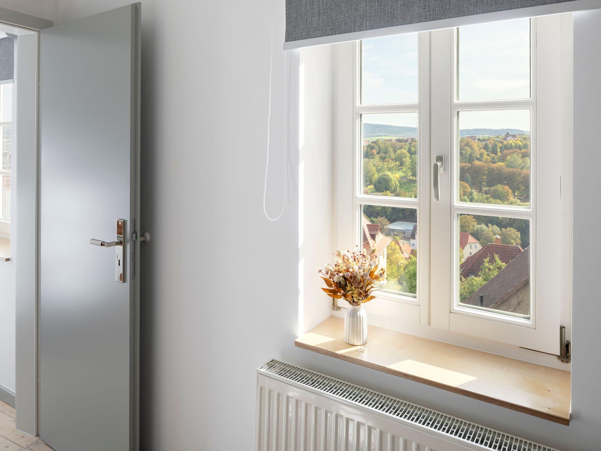 Von der Küche aus gelangt man direkt auf einen kleinen Freisitz (Balkon), von dem man einen schönen Ausblick über die Dächer der Altstadt genießen kann.