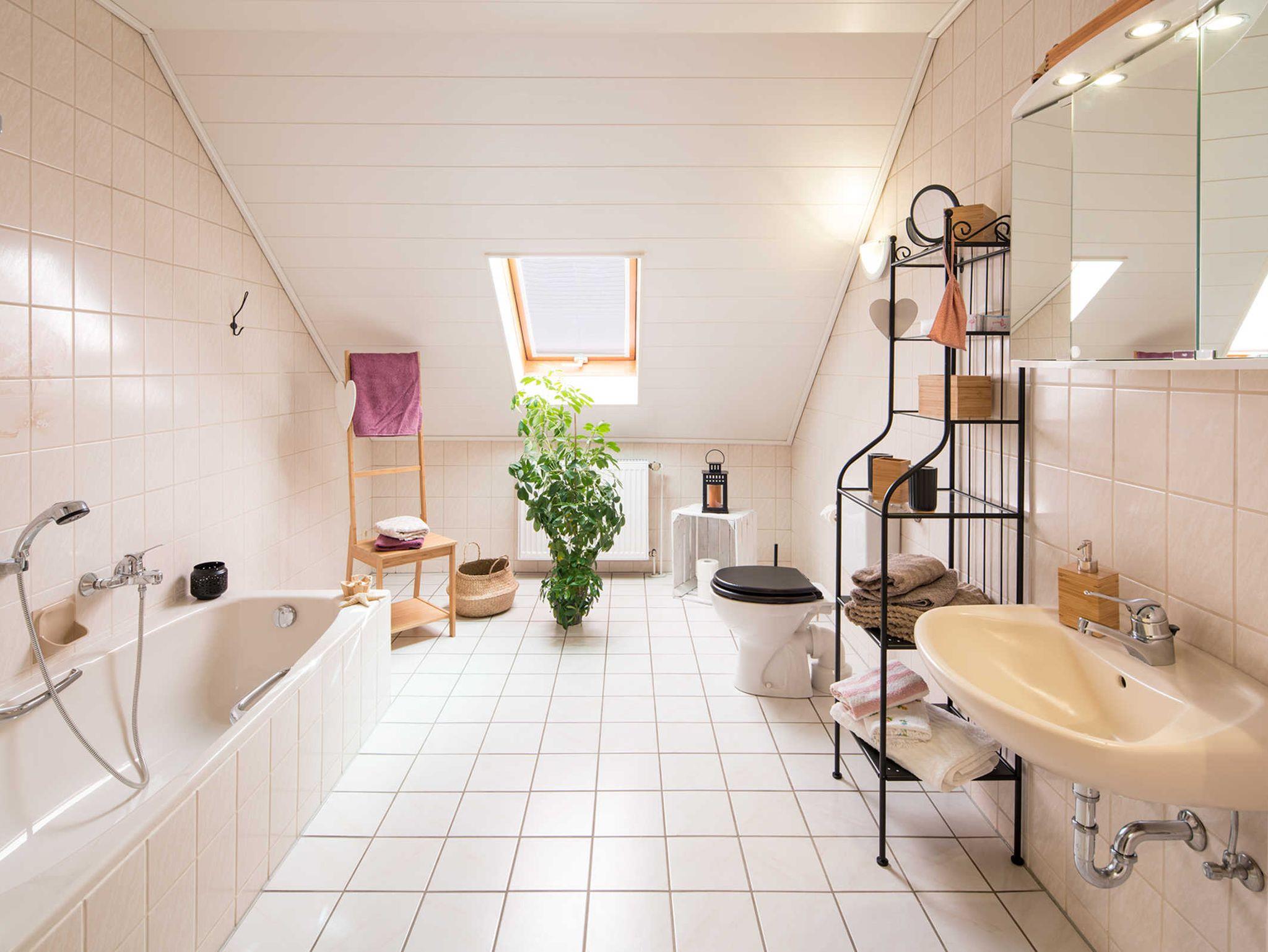 Ein behagliches Badezimmer mit Dusche und Badewanne, WC, Kosmetikspiegel, Fön, Dusch-und Handtücher inklusive schließt sich an.