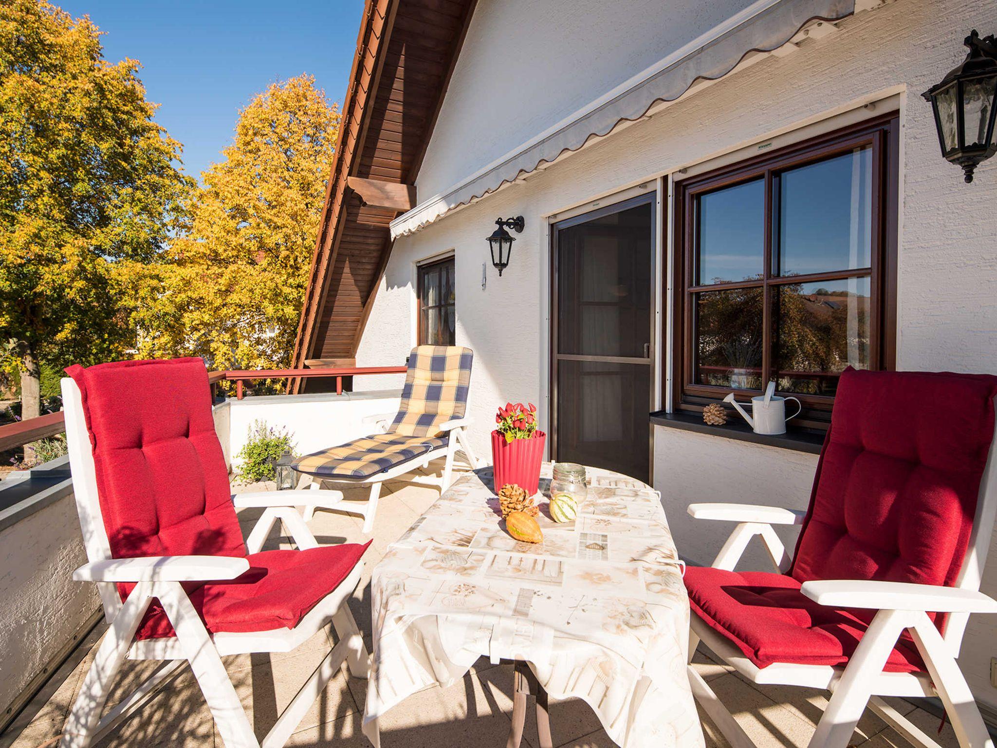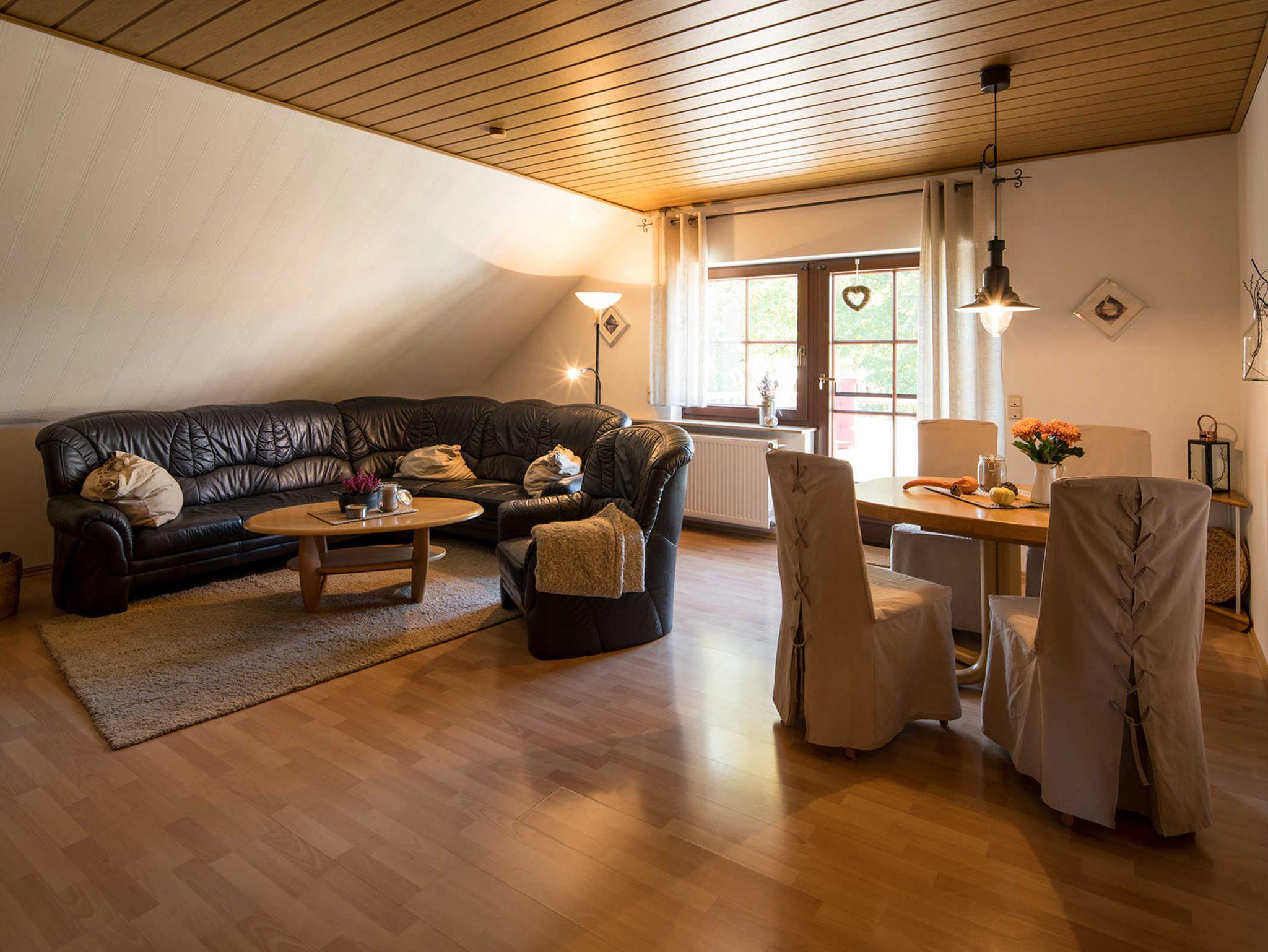 Die umfangreich und modern renovierte Ferienwohnung liegt im Obergeschoss und ist ca. 90 m² groß. Ein großzügiger mit Markise ausgestatteter Balkon auf der Sonnenseite lädt zu einem wunderbaren Ausblick in eine herrliche Landschaft ein, um den Sonnenuntergang am Horizont zu genießen. Sie bietet reichlich Raum für 1 bis 4 Personen durch ein großes, gemütliches Wohnzimmer mit Essecke und zwei wohligen Schlafzimmern. Außerdem verfügt sie über eine komplett eingerichtete Küche mit Sitzmöglichkeit und ein helles, behagliches Badezimmer mit Dusche zum Erfrischen und Badewanne zum Entspannen. Ein Stellplatz für PKW`s neben dem Haus und eine abschließbare Fahrradunterstellmöglichkeit sind selbstverständlich. Ebenso steht ein Carport für das Unterstellen von Motorrädern zur Verfügung.