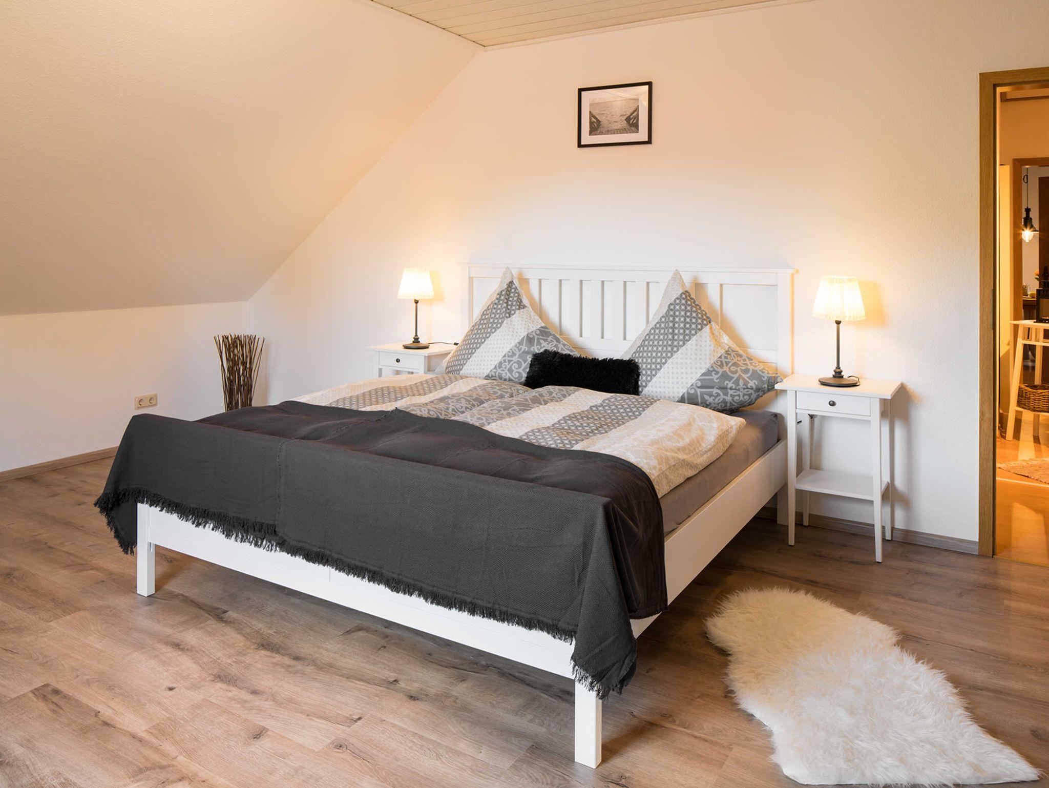 Schlafen können Sie in einem hellen, wohligen Schlafzimmer mit einem Doppelbett (180x200 cm), hier ist auch Platz für ein Babyreisebett vorhanden.