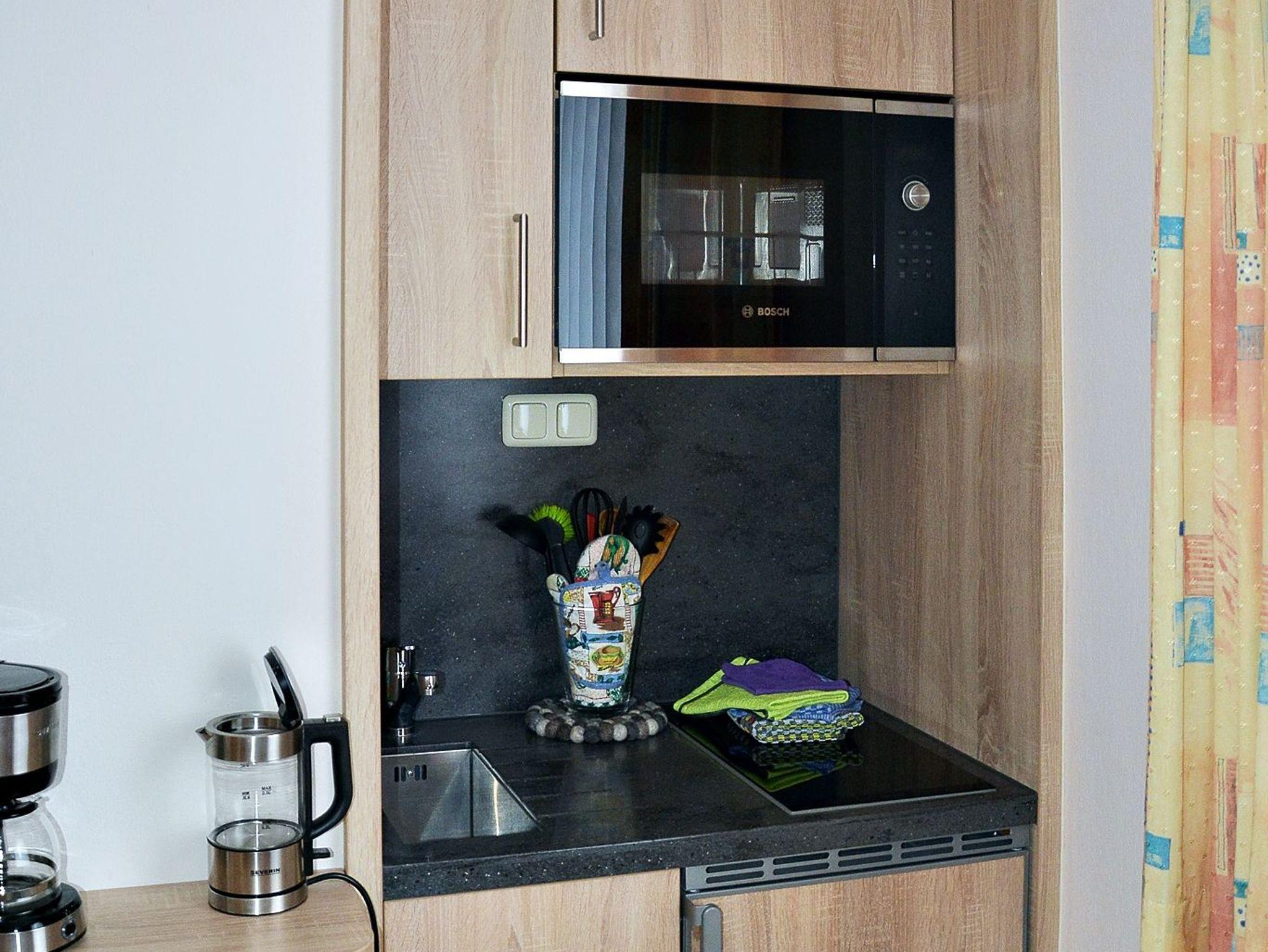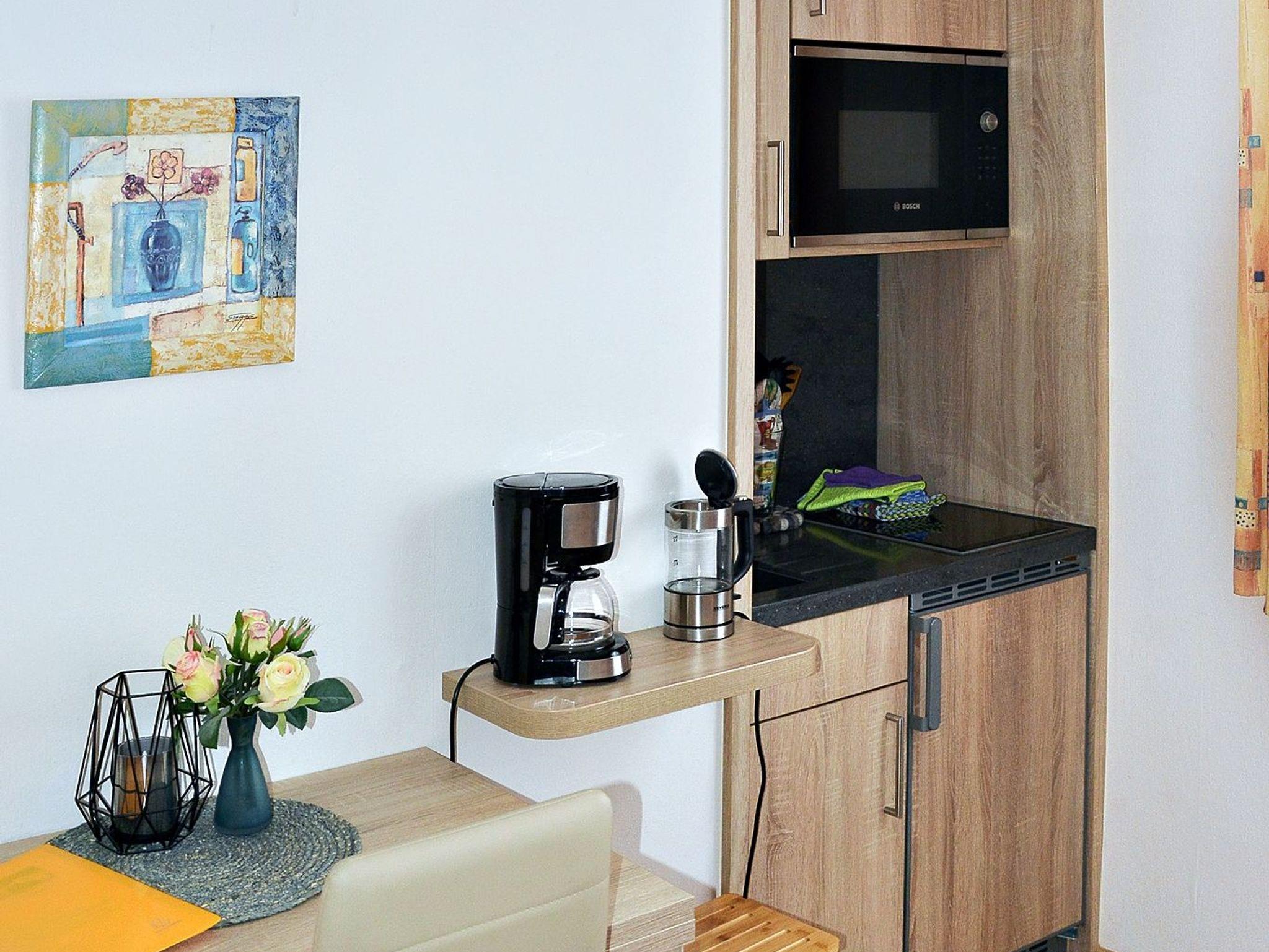 Auf ca. 20 qm finden sie ein gemütlich eingerichtetes App. mit einem kleinen Flur. Im Wohn-Schlafraum ist eine Miniküche, die mit Geschirr, Kühlschrank, 2 Herdplatten, Mikrowelle, Toaster, Wasserkocher und Kaffeemaschine ausgestattet ist. Ein Flach-Sat TV steht ihnen zur Verfügung. Das Bad ist mit Waschbecken, Dusche und WC und Haartrockner bestückt. Handtücher und Bettwäsche werden gestellt.