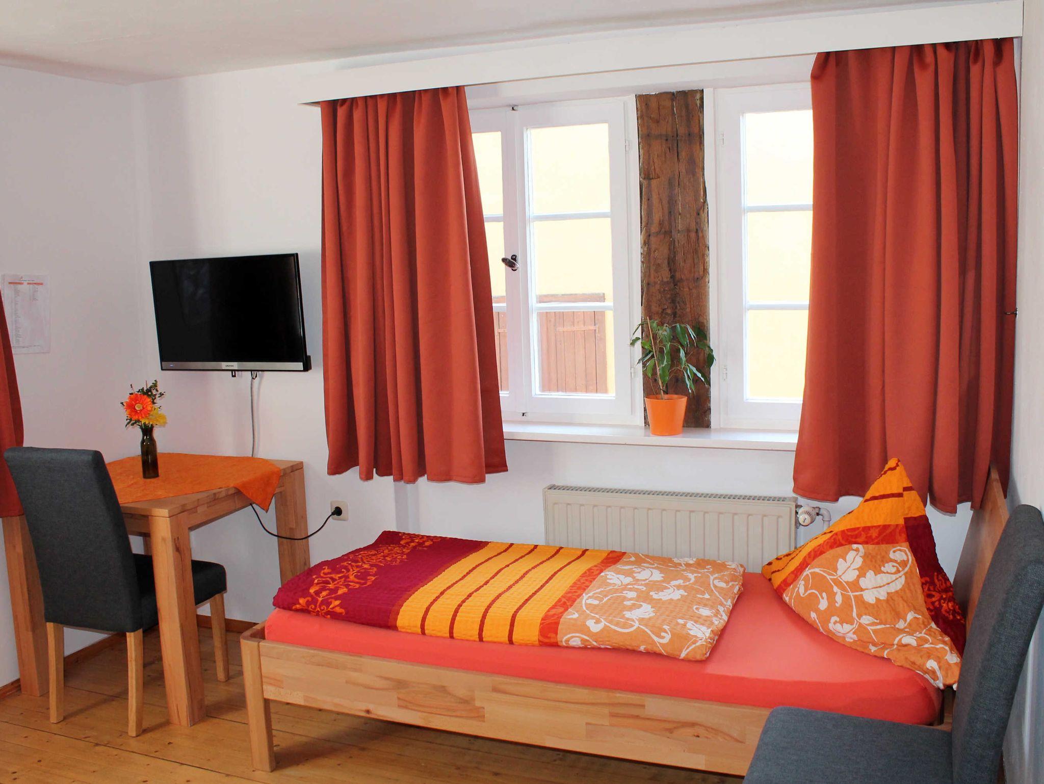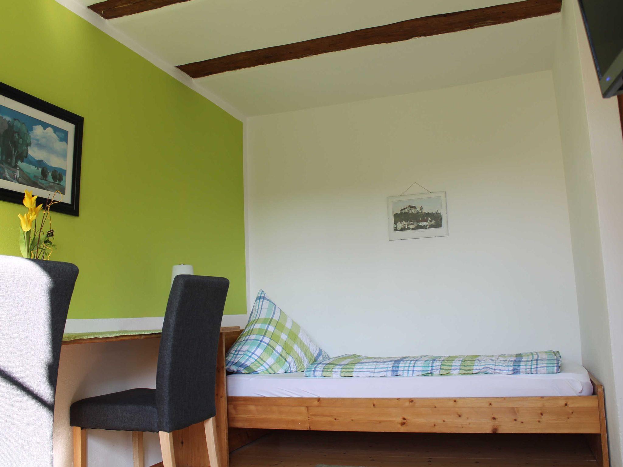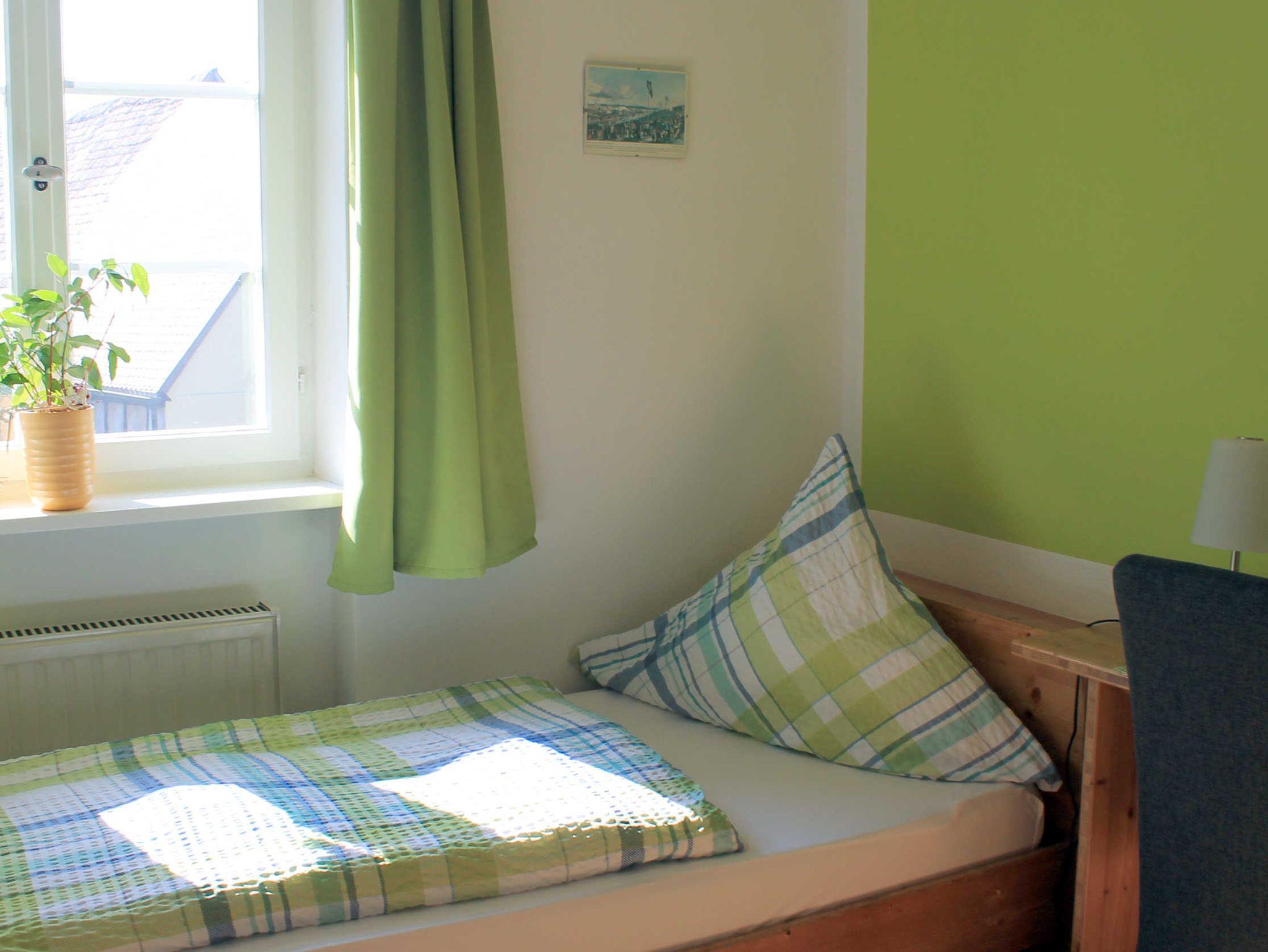 Unser Einzelzimmer verfügt über ein modernes Einzelbett, eine gemütliche Sitzecke und ein integriertes Badezimmer.