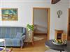 Zur Ausstattung im Wohnzimmer zählt ein 3er-Couch-Element, sowie Flachbild-TV mit Empfang über Sat-Anlage. Neu: kostenloses schnelles WLAN via Glasfaser.