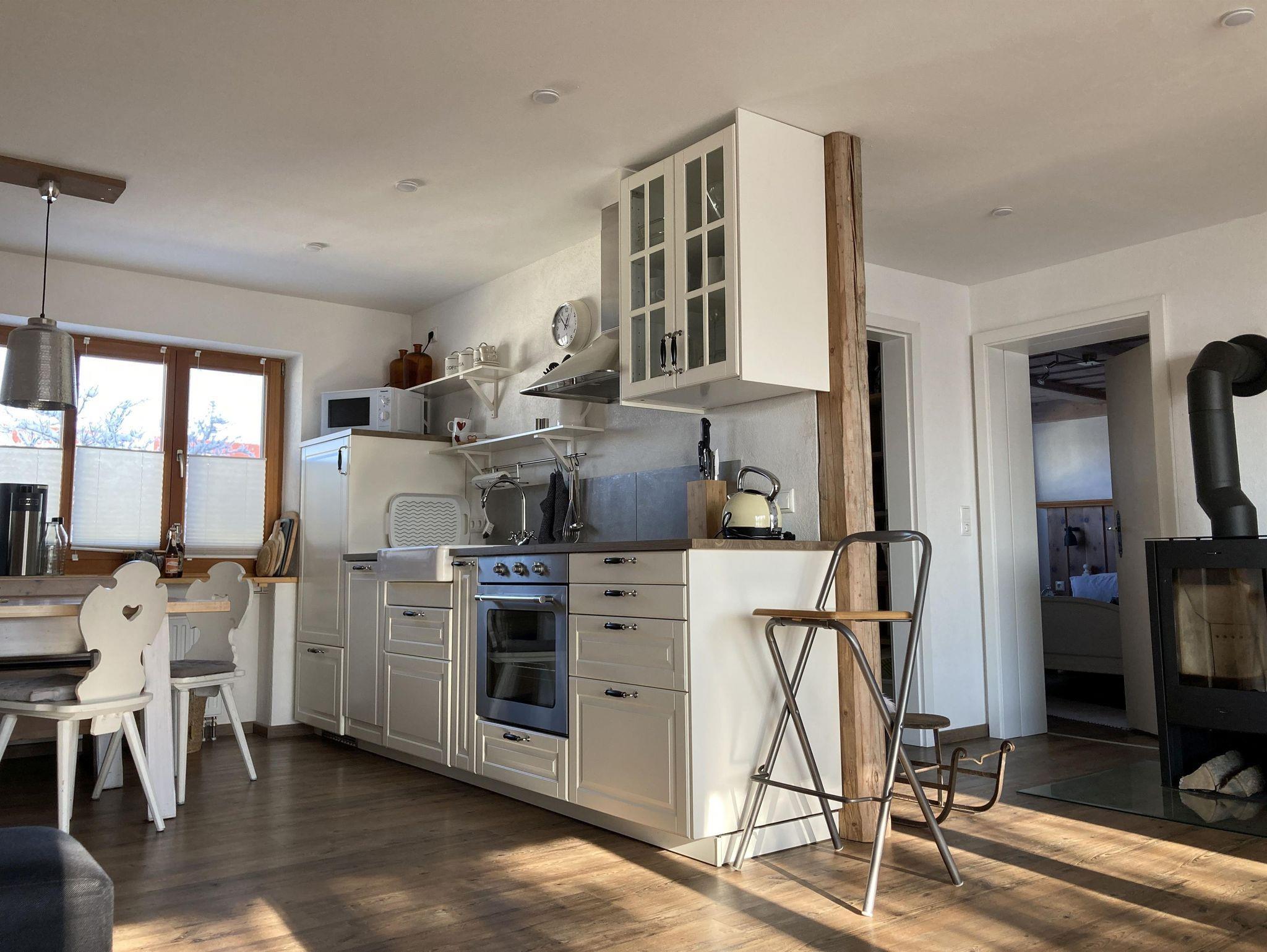 • Einbauküche, Backofen, Spülmaschine, Wassersprudler, Mikrowelle und Kühlschrank mit Gefrierfach und einer Sitzecke mit Eckbank und großem Tisch
