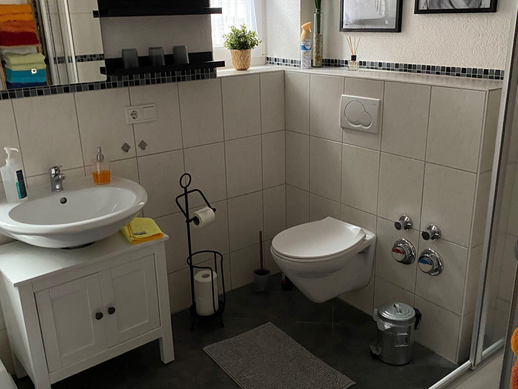 Badezimmer ist mit einer Dusche, WC und Waschbecken ausgestattet.