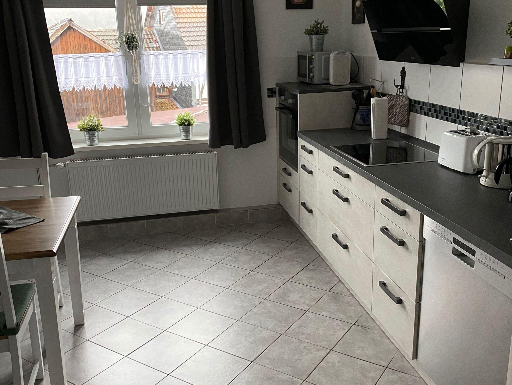 Eine große Küche. Küchenzeile mit Spülmaschine, Induktionsfeld, Backofen und Mikrowelle.
