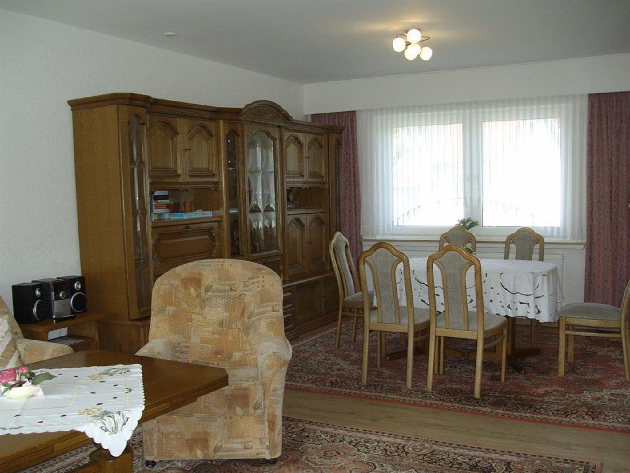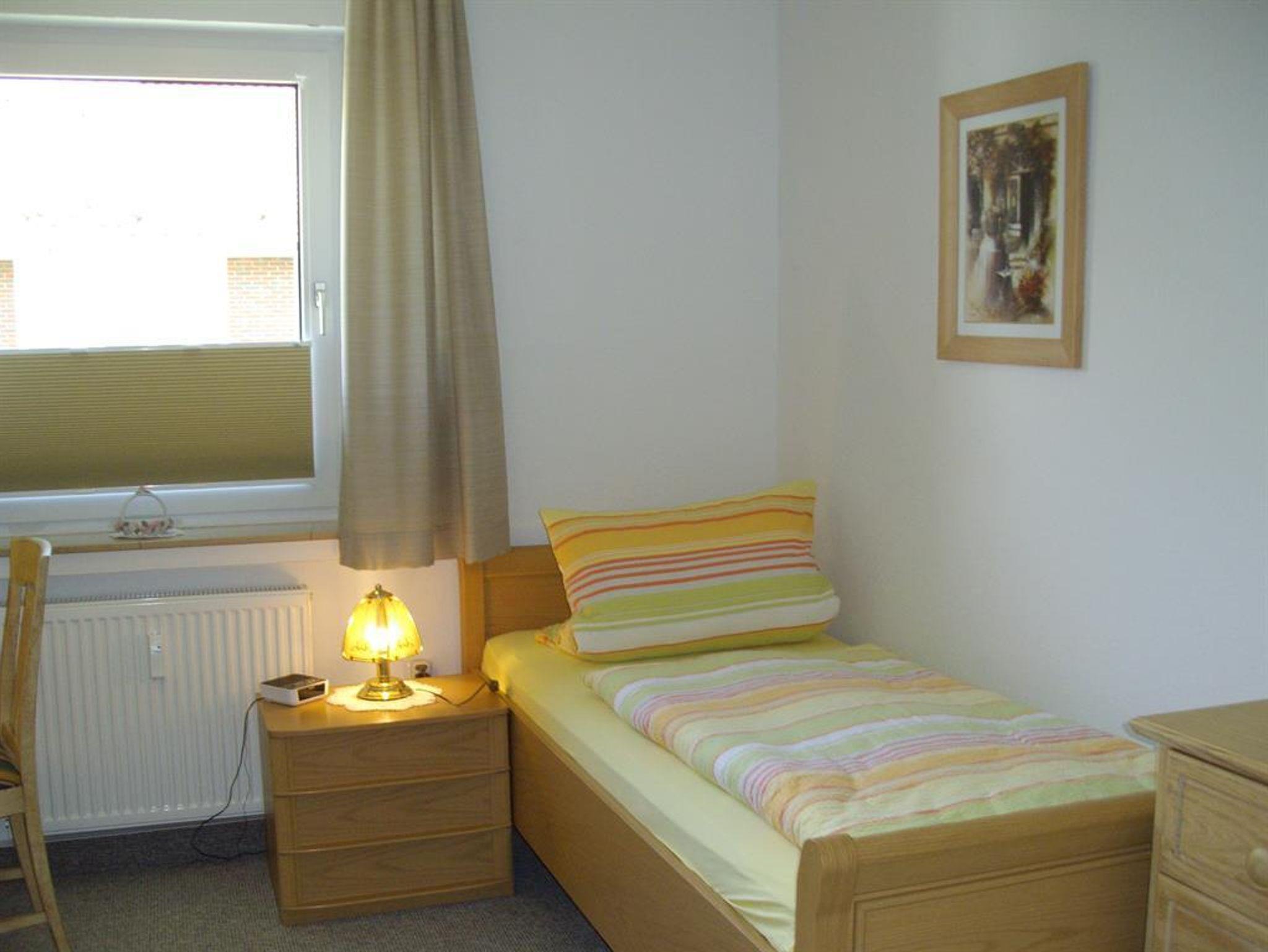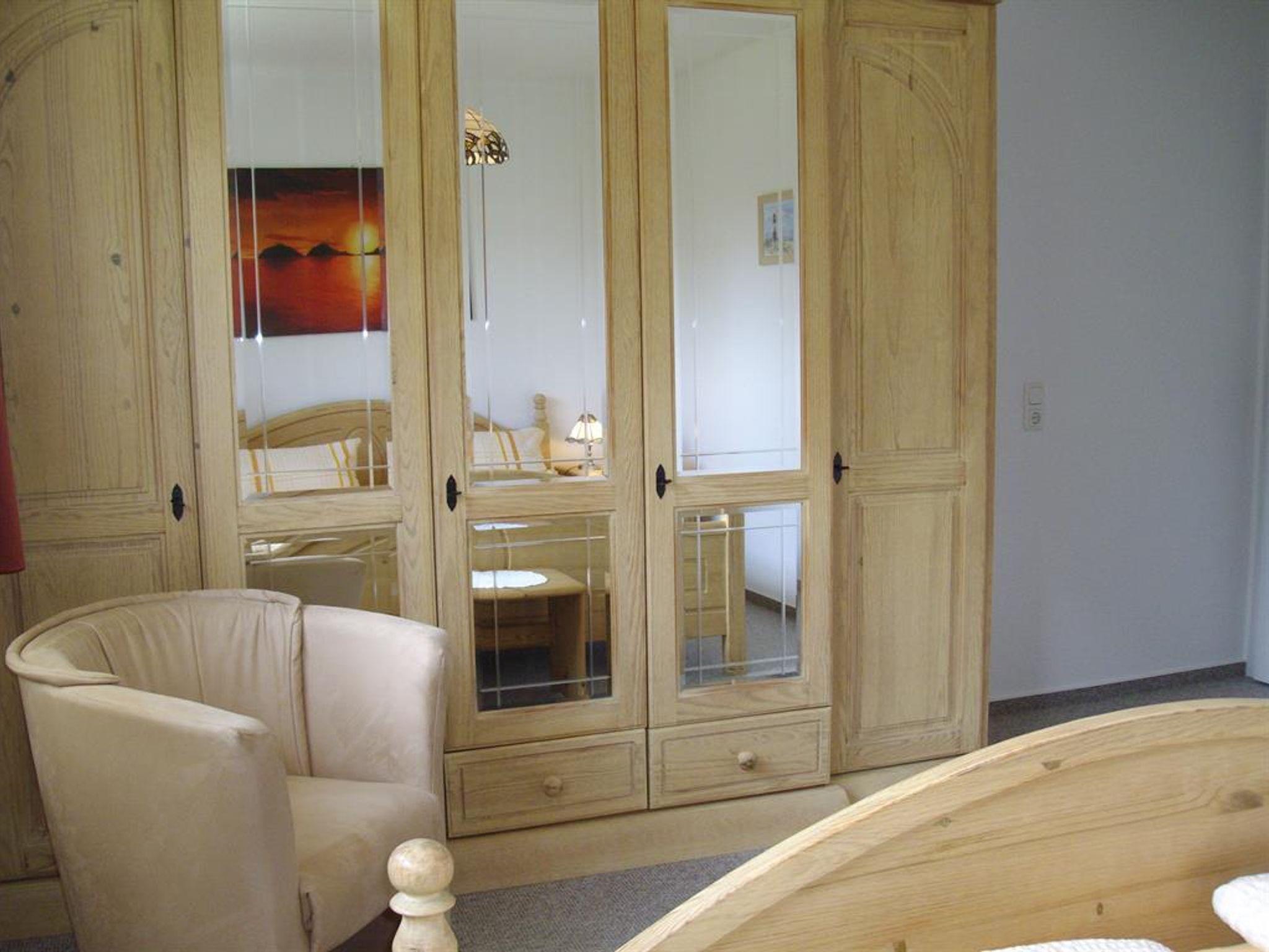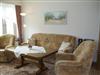 Die Ferienwohnung im Obergeschoss (82 qm) befindet sich in der 1. Etage und ist über einen separaten Eingang erreichbar. Die Wohnung hat zwei Schlafzimmer, ein Schlafzimmer mit Doppelbett und ein weiteres mit einem Einzelbett und einer ausziehbaren Schlafcouch (1 Person). Die Lattenroste in den Betten sind am Kopf- und Fußende verstellbar. Im Schlafzimmer mit Einzelbett und im Wohnzimmer ist jeweils ein Flachbild-TV mit Kabelanschluß vorhanden. Im großen Wohnzimmer (ca. 31 qm) ist neben einer Sitzecke mit fünf Sitzplätzen noch eine separate Essecke mit sechs Sitzplätzen eingerichtet. Die separate Küche ist mit einer Einbauküche ausgestattet und hat ebenfalls vier Sitzplätze. Neben dem üblichen Inventar und Geräten in einer Küche sind selbstverständlich auch ein Toaster und ein Eierkocher vorhanden. Das Badezimmer verfügt über eine Badewanne mit Dusche und WC. Vom Wohnzimmer geht es auf den großen, überdachten Balkon (ca. 11 qm), der nach Süden ausgerichtet ist. Ein eigener PKW-Stellplatz sowie ein eigener Abstellraum für Fahrräder gehören ebenfalls zu dieser Wohnung.
