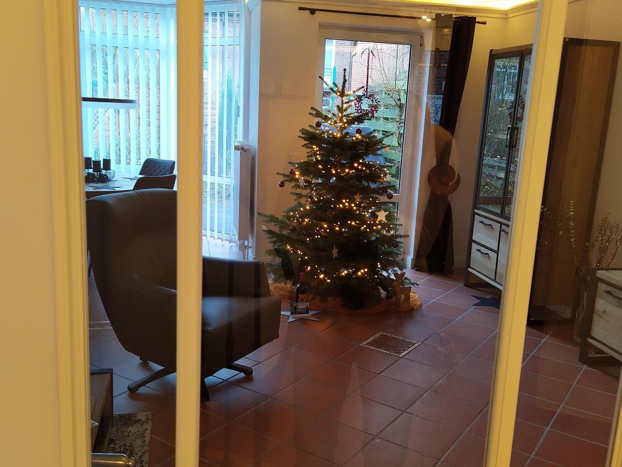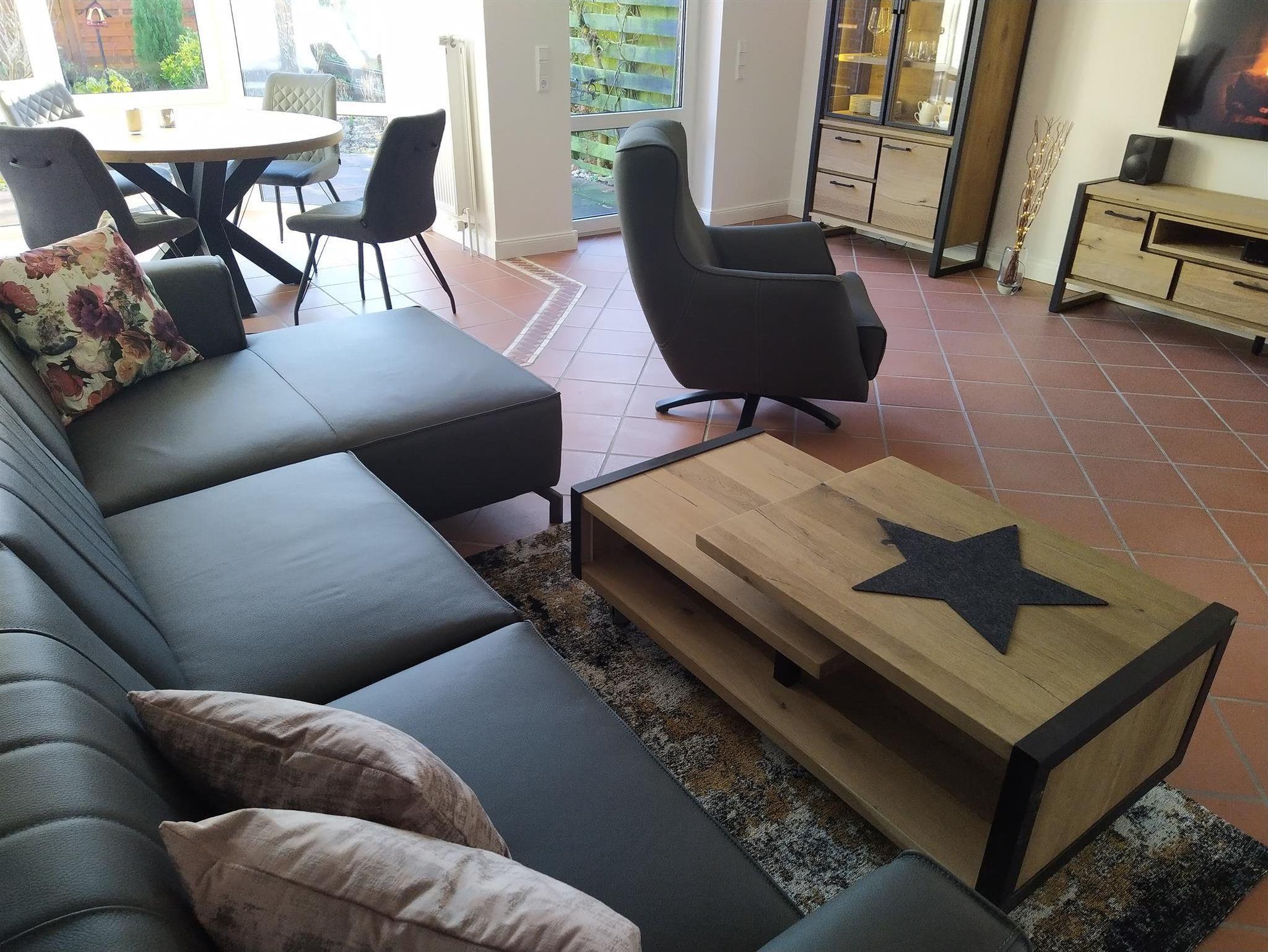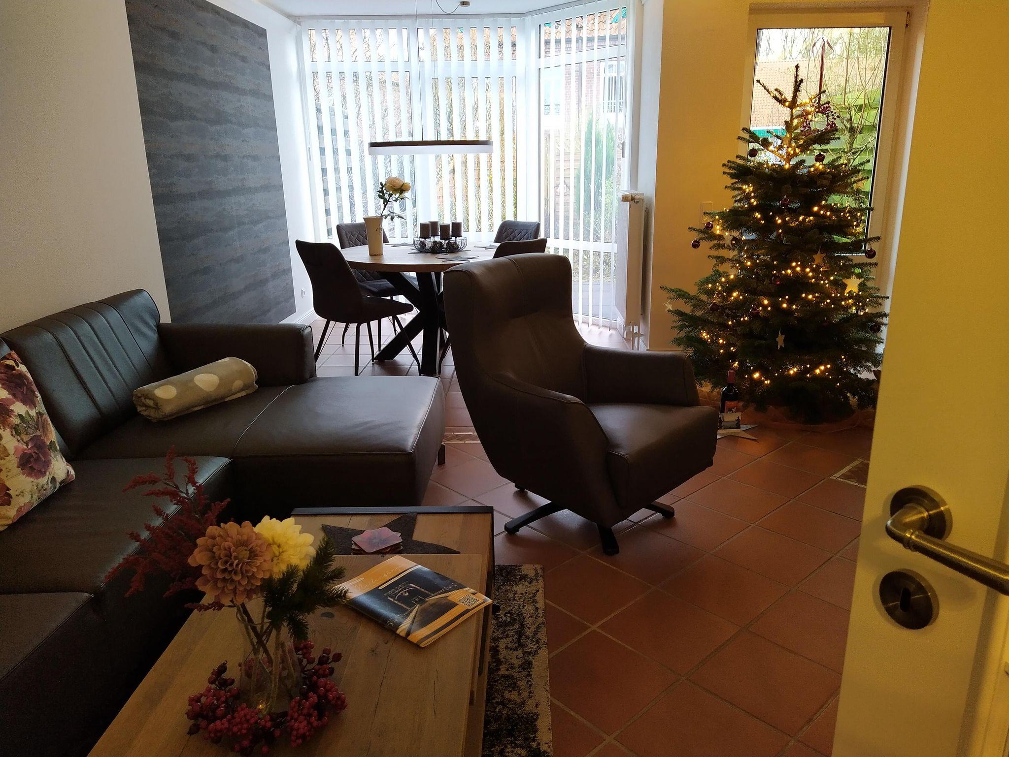 - 1 Wohn- und Esszimmer mit verglastem Erker und direktem Zugang zur möblierten Terrasse mit Strandkorb und zum eigenen Garten.