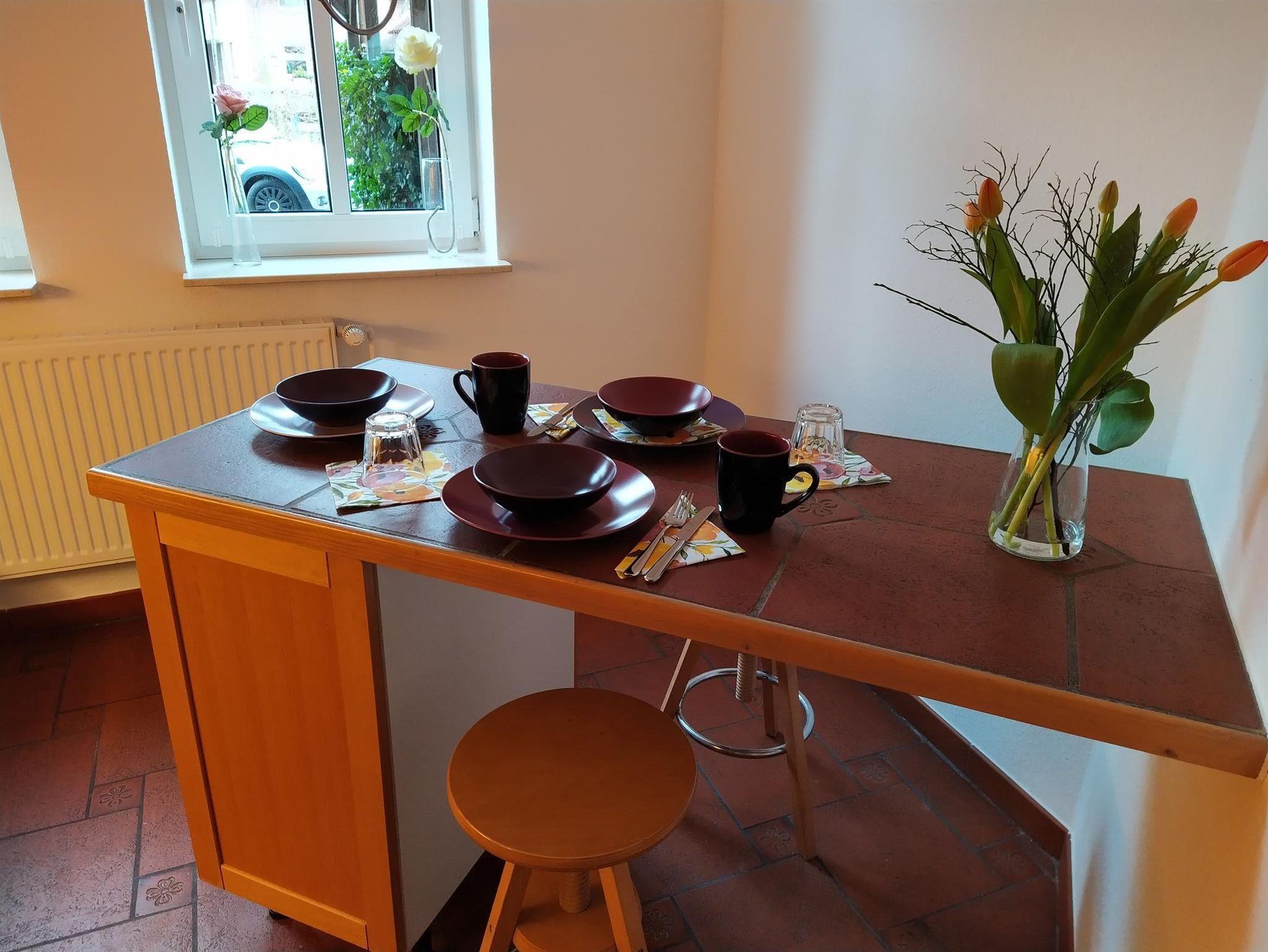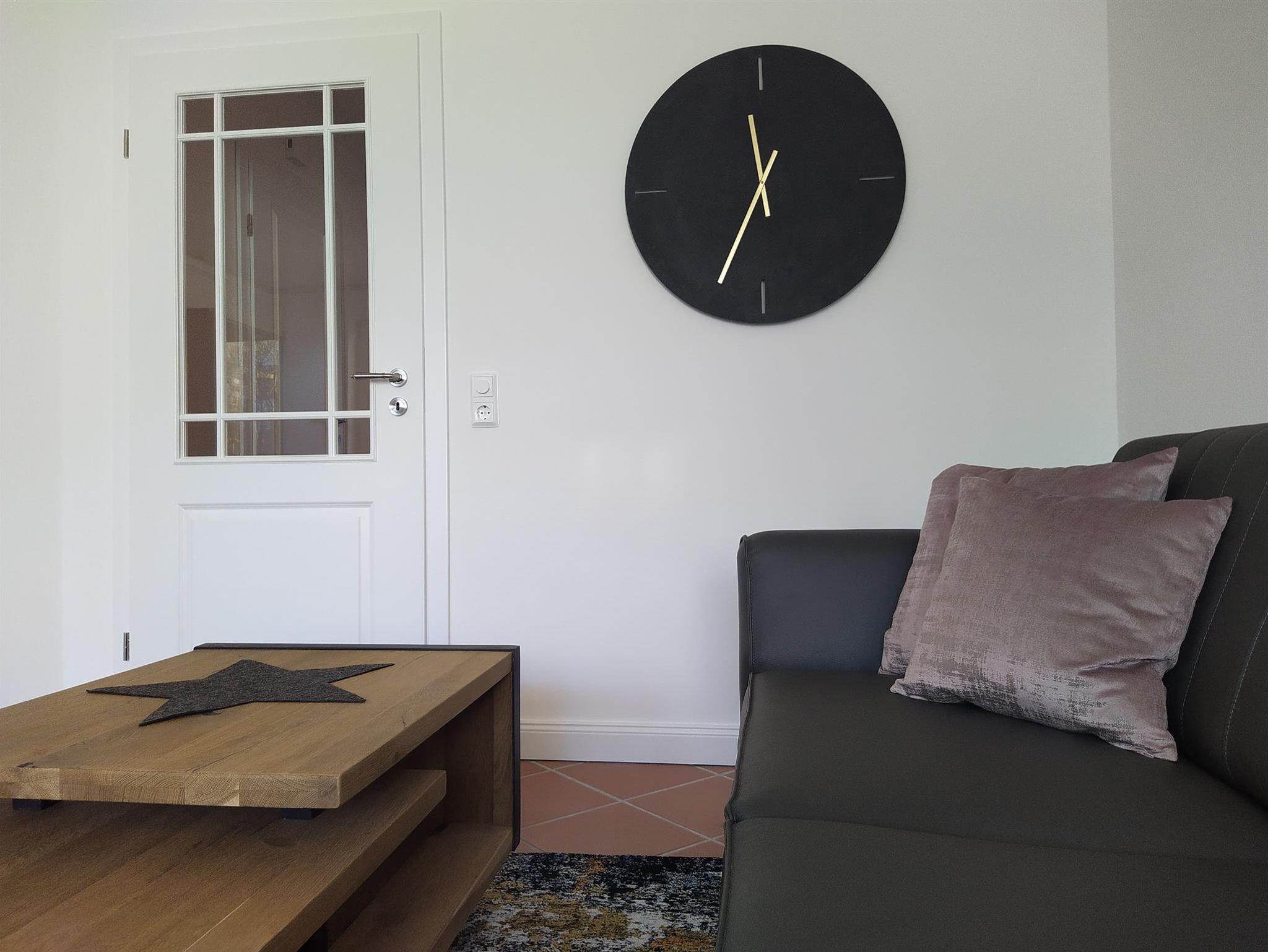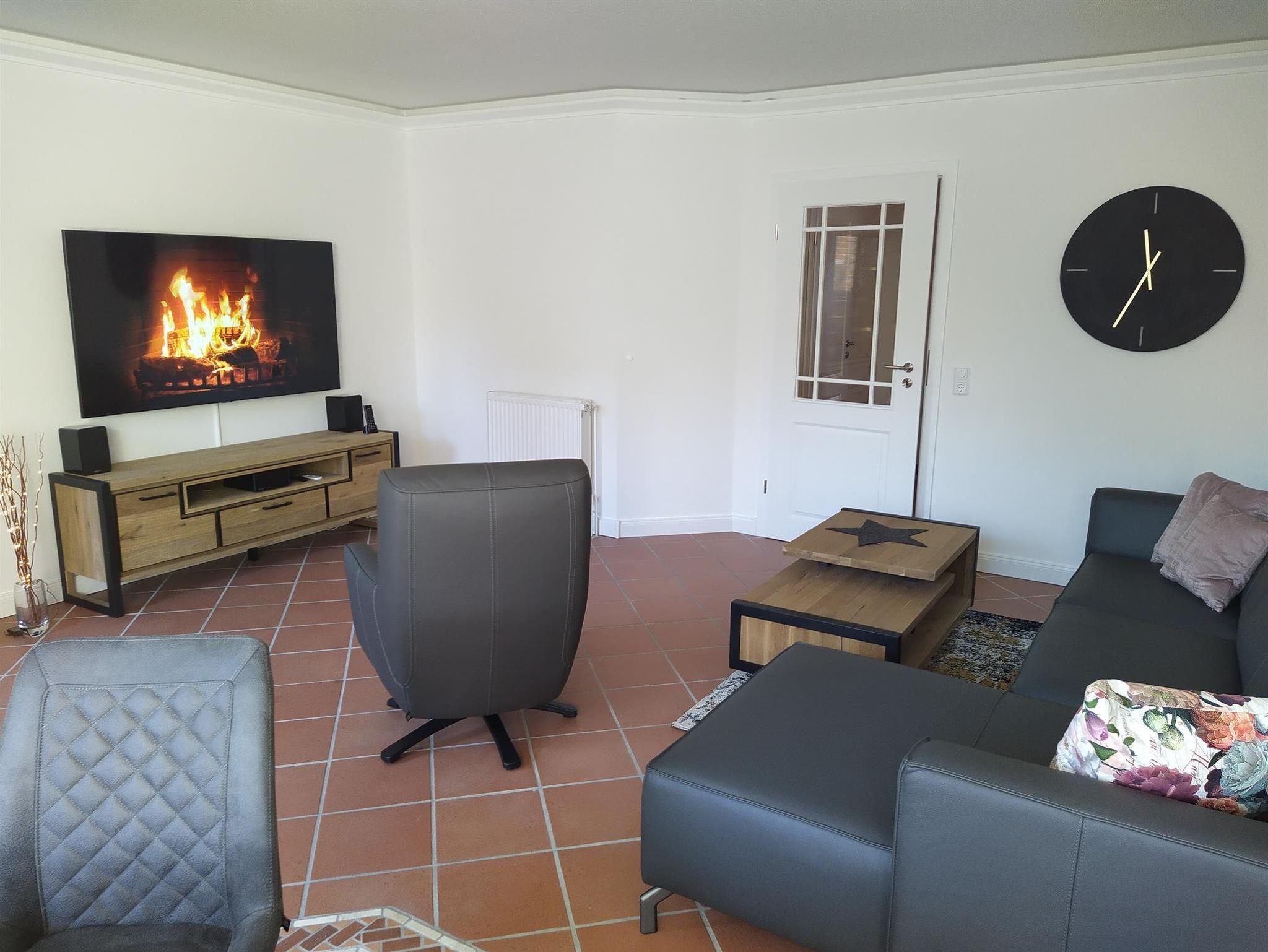 - 1 Wohn- und Esszimmer mit verglastem Erker und direktem Zugang zur möblierten Terrasse mit Strandkorb und zum eigenen Garten.