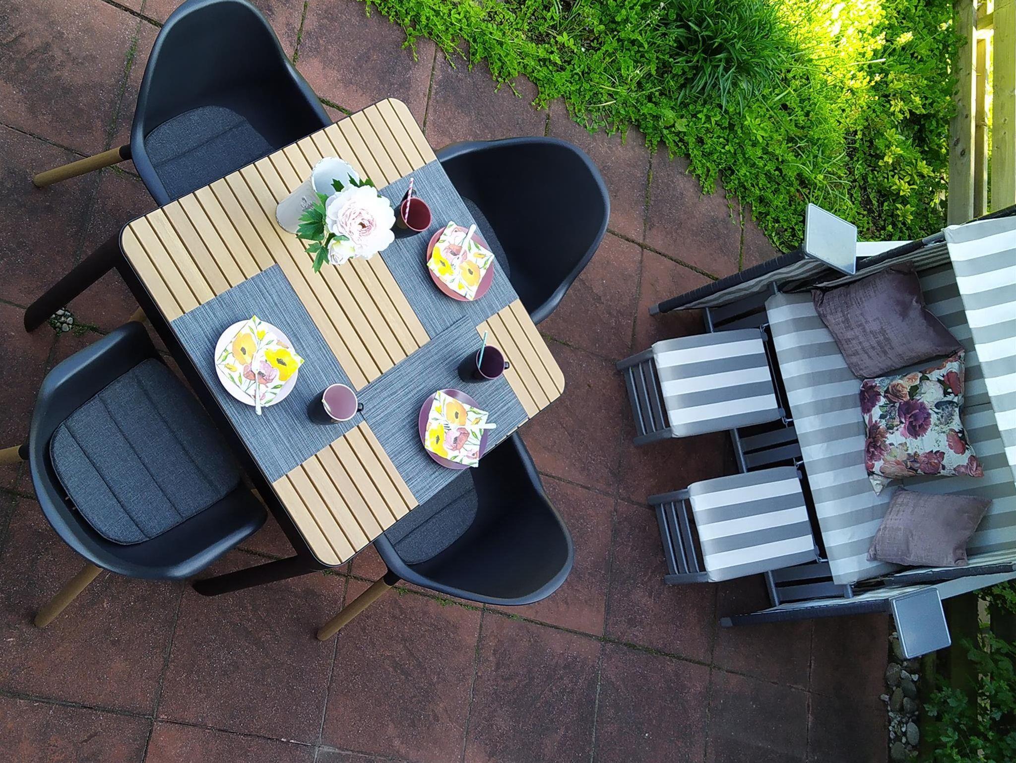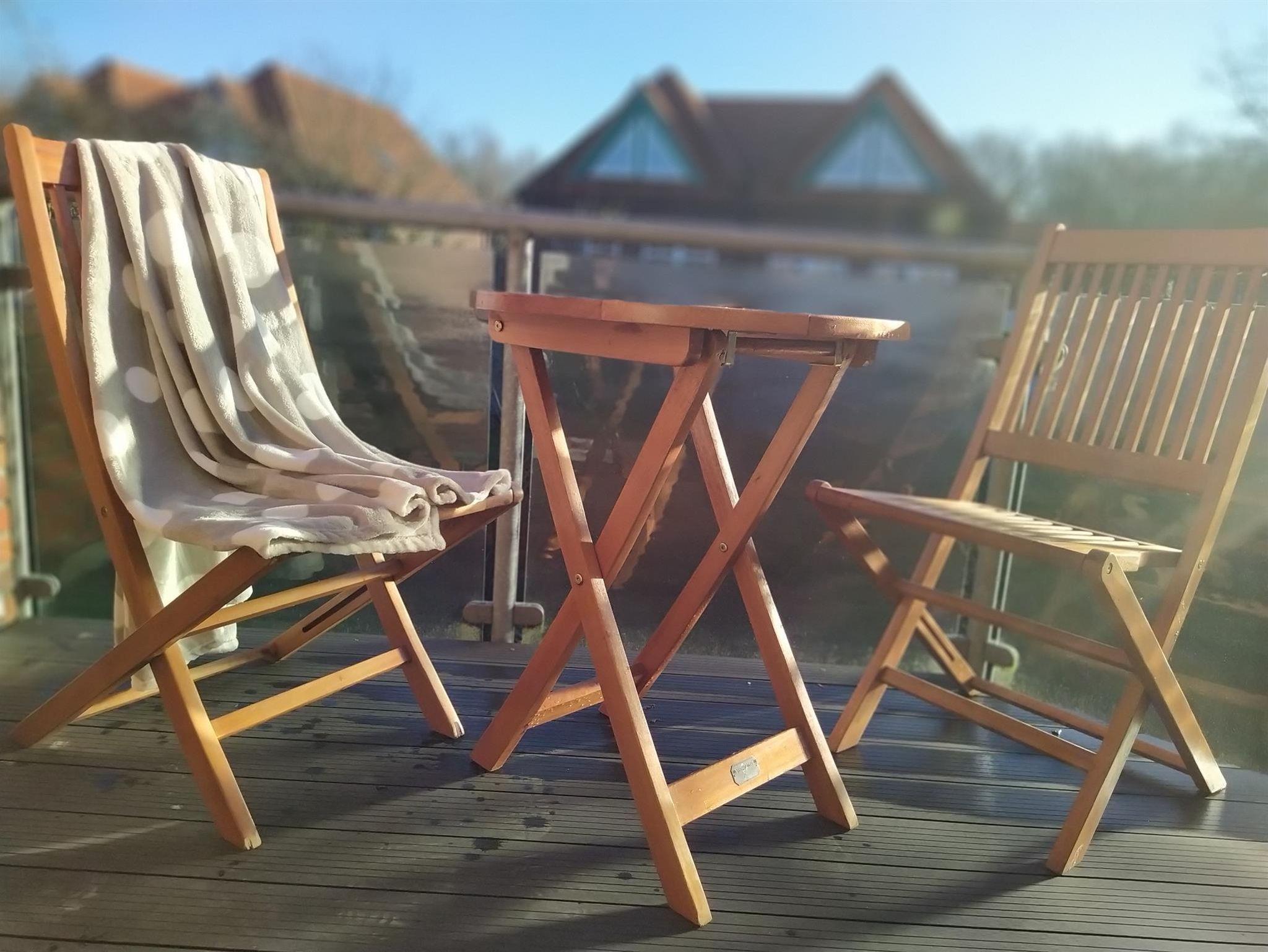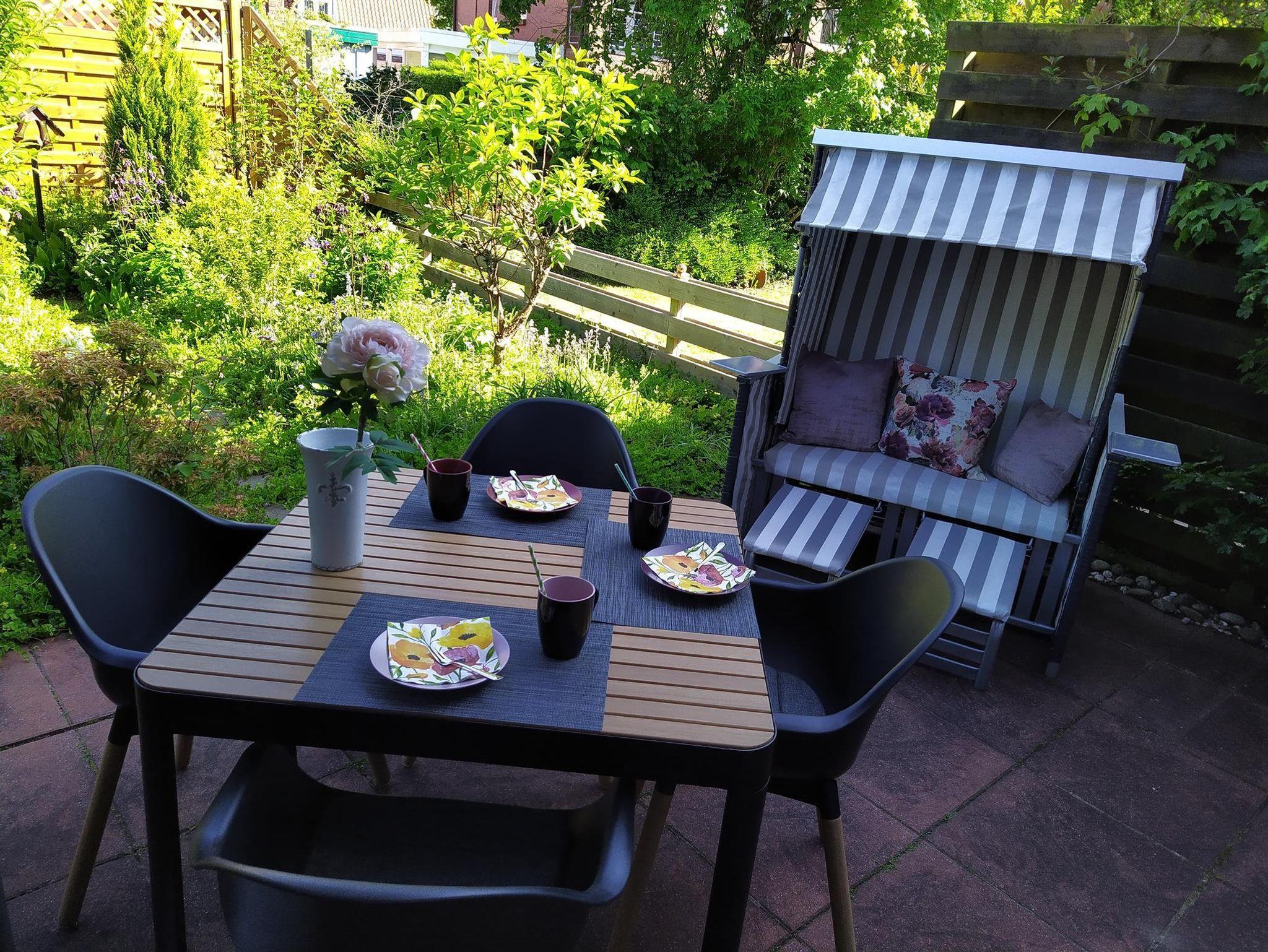 - 1 Wohn- und Esszimmer mit verglastem Erker und direktem Zugang zur möblierten Terrasse mit Strandkorb, zudem blicken Sie auf einen eigenen kleinen Garten.