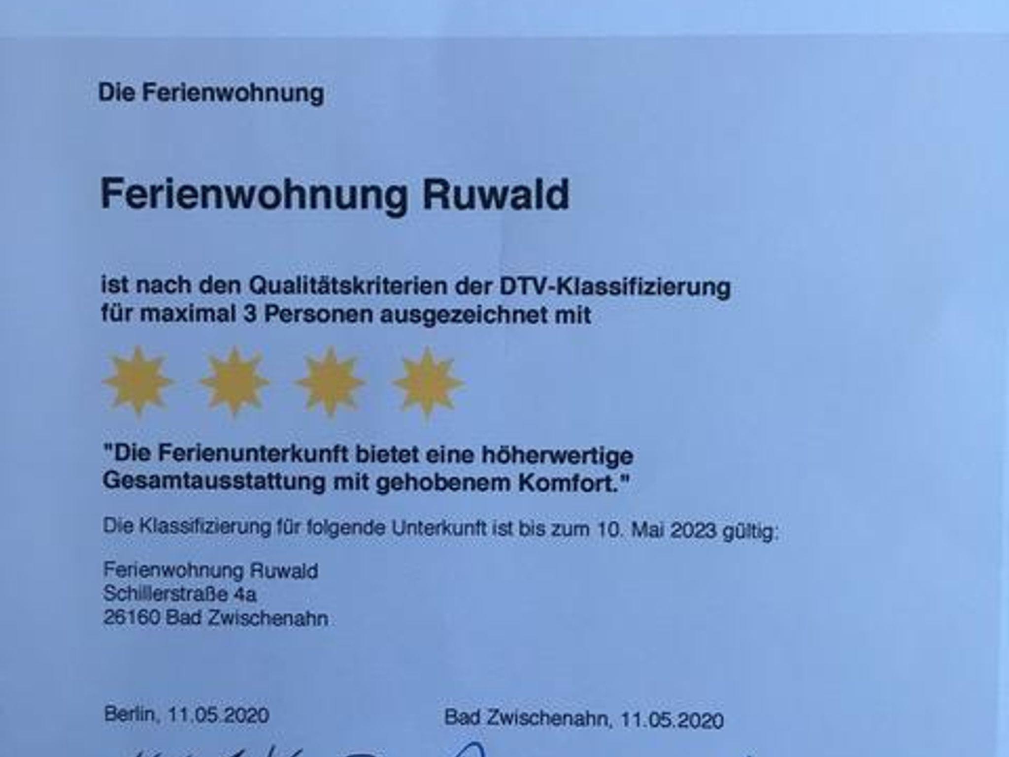 1. Die Ferienwohnung Ruwald (87qm) hat einen Garten zur Eigennutzung, einen Stellplatz für das Auto und Unterbringungsmöglichkeit der eigenen Fahrräder im Gartenhaus. Die Dusche ist ebenerdig. Zwei separate Schlafzimmer sind vorhanden. Wlan,TV und Telefon stehen zur Verfügung.Der Familienhund ist erlaubt. Die Wohnung ist mit 4 DTV Sternen für die Belegung von 3 Gästen ausgezeichnet.