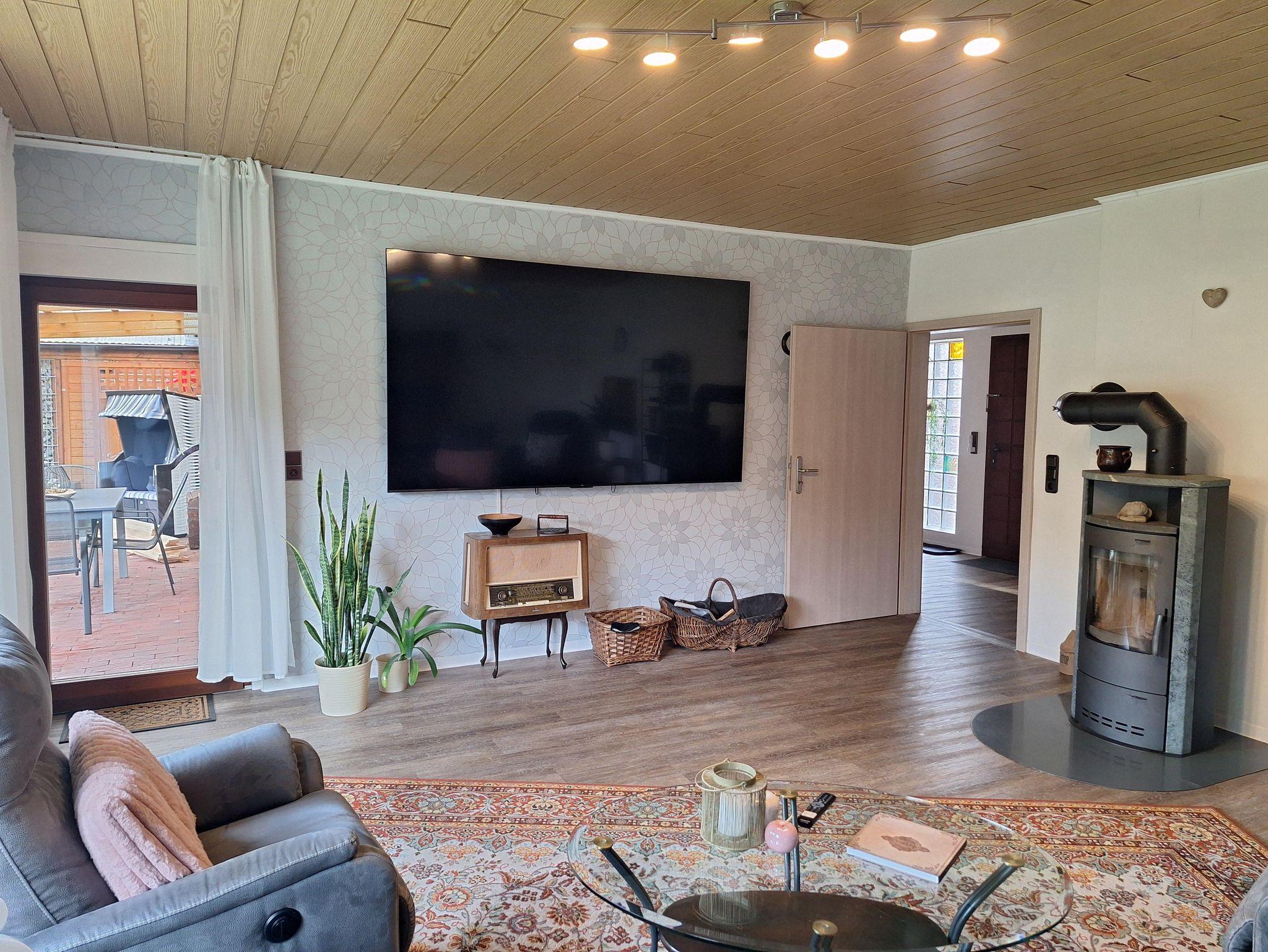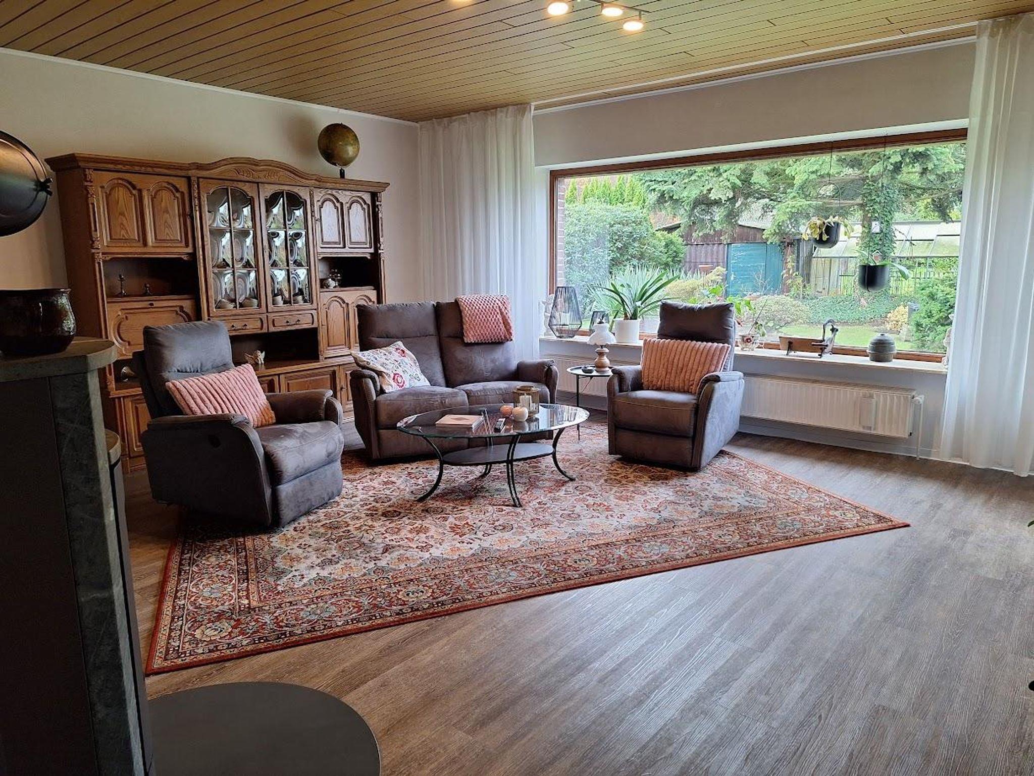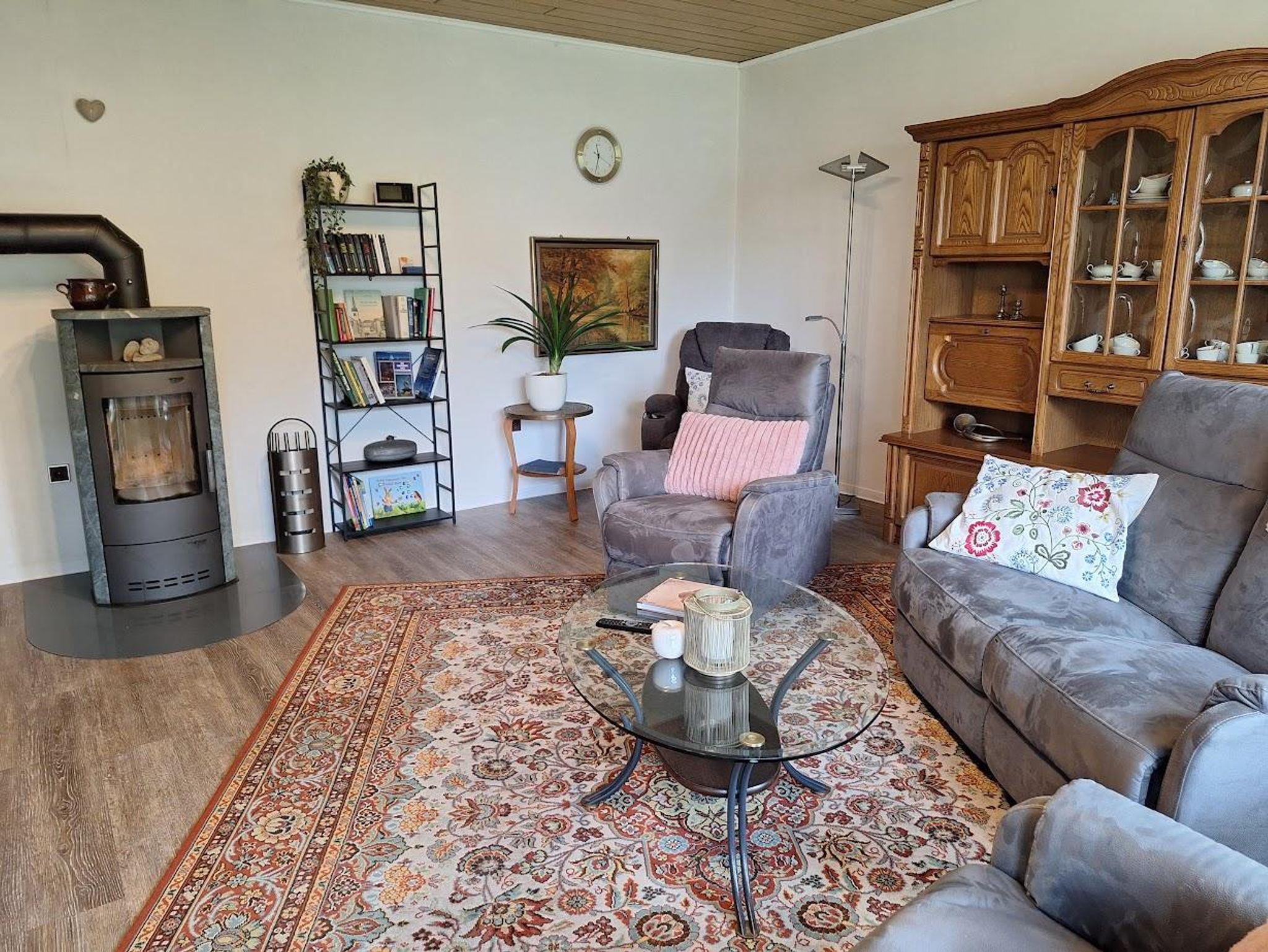 Das Wohnzimmer ist ca. 30m² groß und verfügt über ein XXL- Smart-TV. Von hieraus können Sie durch eine Tür zur Terrasse und in den Garten gelangen. In diesem Raum befindet sich auch ein Kaminofen. Im Wohnzimmer finden Sie eine Couch mit elektr. Liegefunktion, 2 Sessel und ein Massagesessel mit Aufstehhilfe. Die Wohnküche hat folgende Ausstattung: Induktionskochfeld mit 4-Kochplatten, hoch eingebauter Backofen, Dunstabzugshaube, Kühlschrank, Geschirrspüler, Kaffeemaschine mit Filter, Wasserkocher, Toaster und Mikrowelle. Am Esstisch finden 8 Personen Platz und ein Elektrokamin. Im großen Schlafzimmer ist Doppelbett (180 x 200 cm Liegefläche), 1 Stuhl, 1 Schrank sowie eine Kommode. Im kleinen Schlafzimmer sind zwei Einzelbetten (jeweils 100 x 200 cm Liegefläche) die man auch zu einem Doppelbett zusammenschieben kann und ein Schrank. Das Bad hat eine großzügige, barrierefreie Dusche mit Duschhocker, WC und Waschbecken. Zusätzlich ist ein Gäste-WC mit kleinem Handwaschbecken vorhanden.