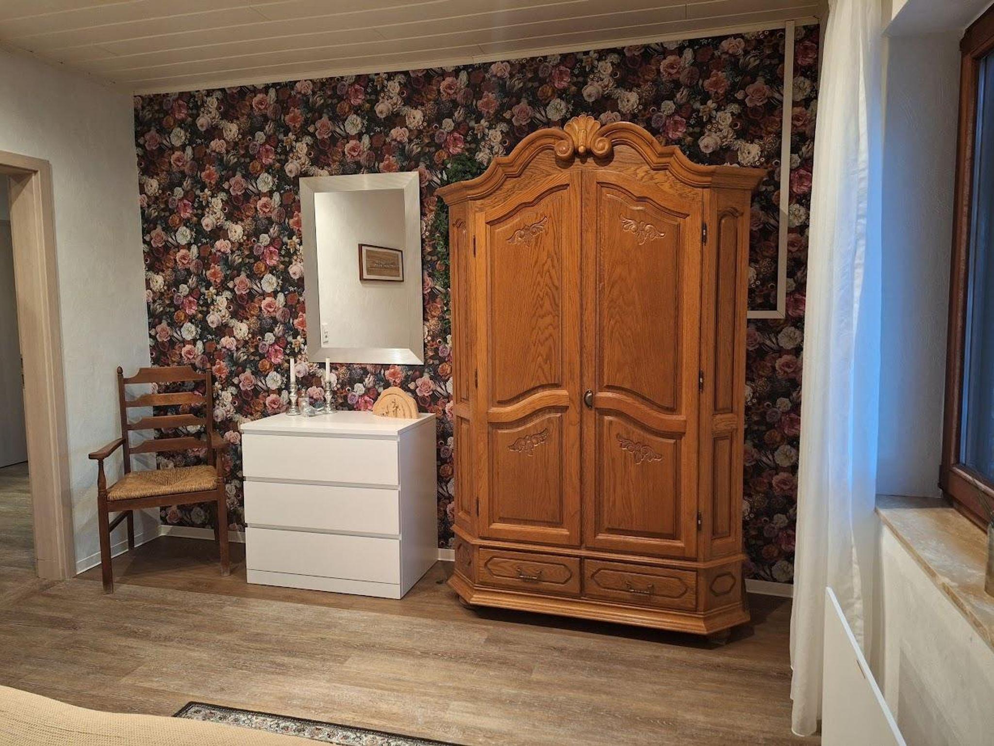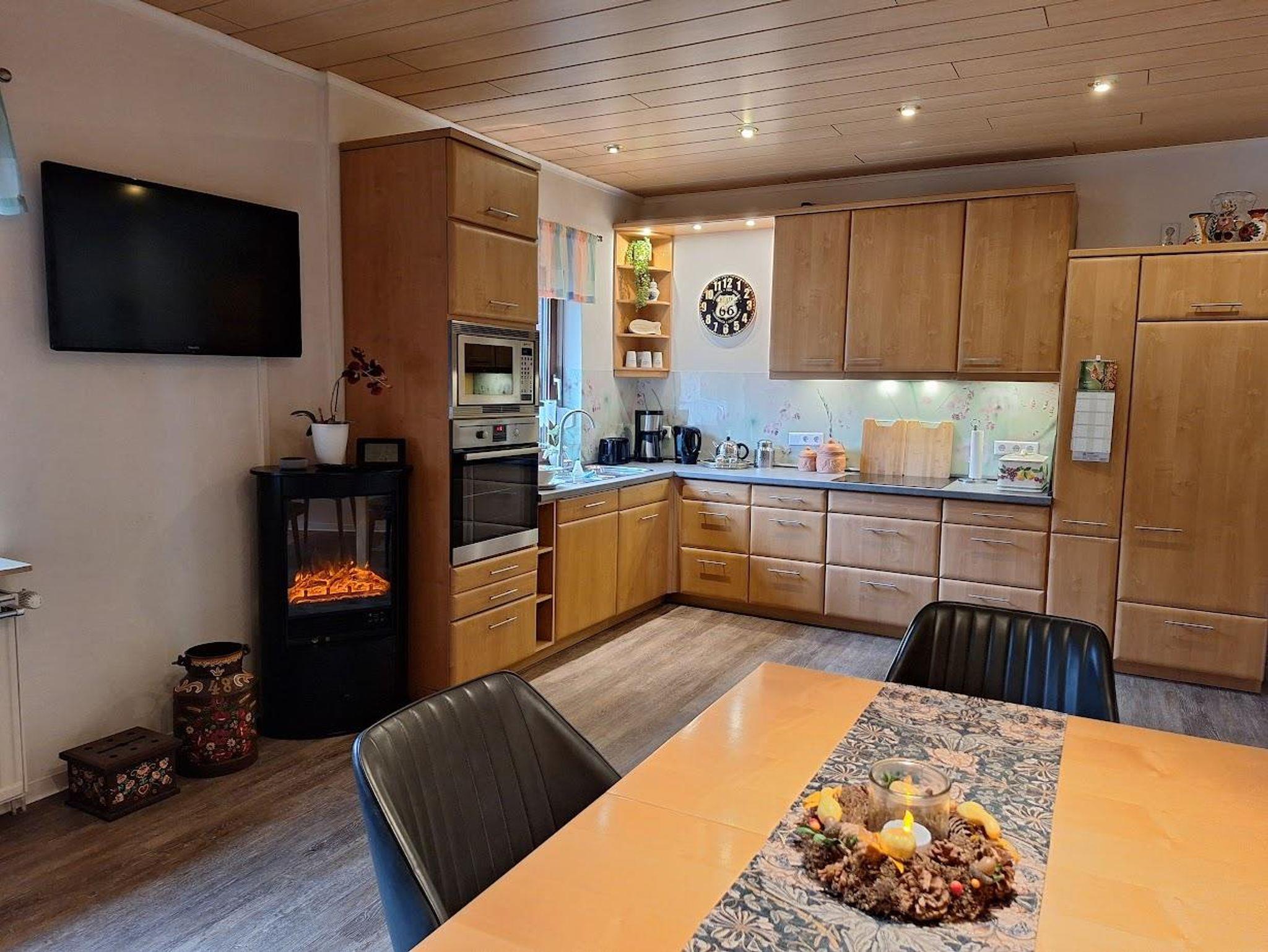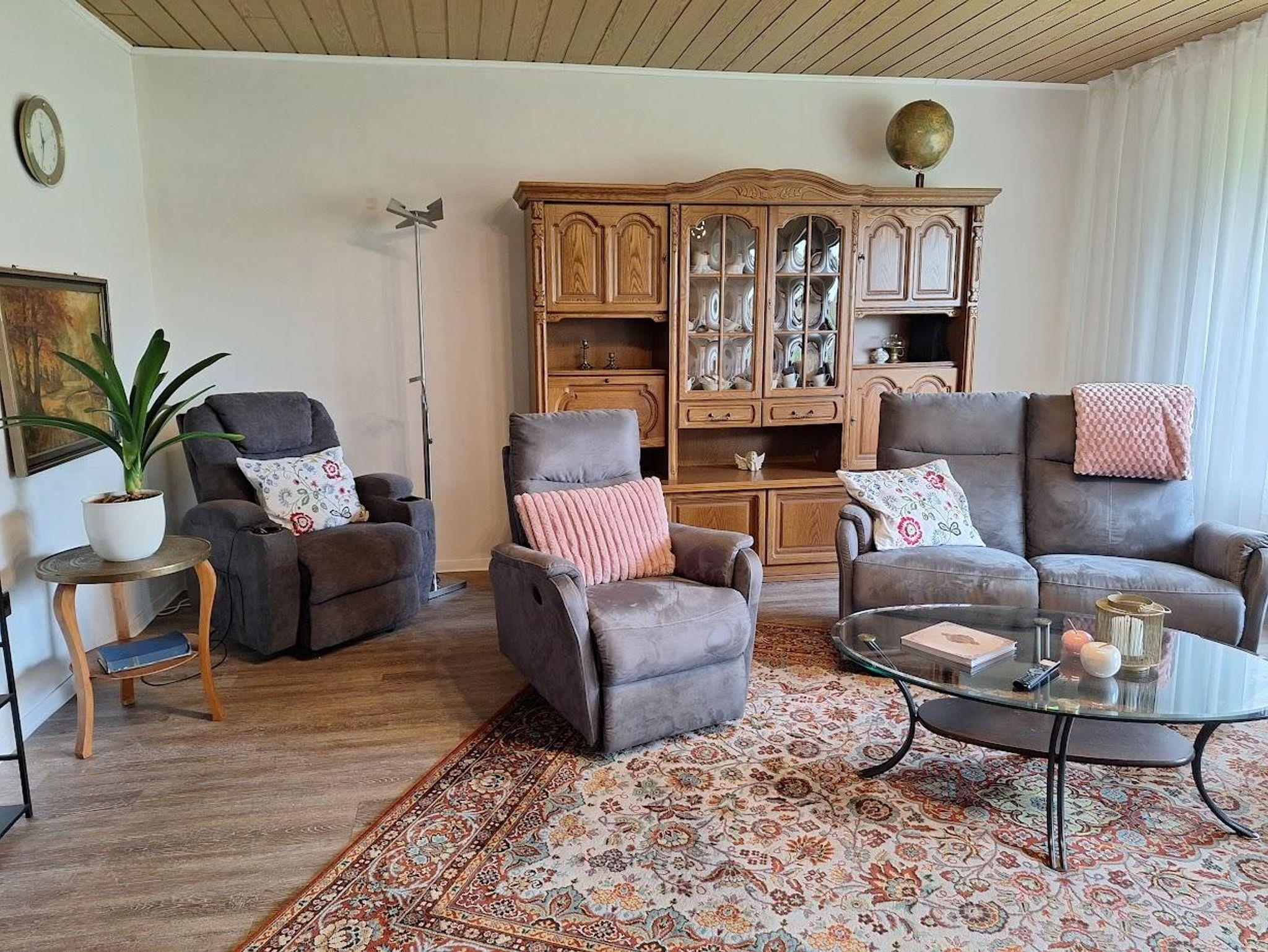 Das Wohnzimmer ist ca. 30m² groß und verfügt über ein XXL- Smart-TV. Von hieraus können Sie durch eine Tür zur Terrasse und in den Garten gelangen. In diesem Raum befindet sich auch ein Kaminofen. Im Wohnzimmer finden Sie eine Couch mit elektr. Liegefunktion, 2 Sessel und ein Massagesessel mit Aufstehhilfe. Die Wohnküche hat folgende Ausstattung: Induktionskochfeld mit 4-Kochplatten, hoch eingebauter Backofen, Dunstabzugshaube, Kühlschrank, Geschirrspüler, Kaffeemaschine mit Filter, Wasserkocher, Toaster und Mikrowelle. Am Esstisch finden 8 Personen Platz und ein Elektrokamin. Im großen Schlafzimmer ist Doppelbett (180 x 200 cm Liegefläche), 1 Stuhl, 1 Schrank sowie eine Kommode. Im kleinen Schlafzimmer sind zwei Einzelbetten (jeweils 100 x 200 cm Liegefläche) die man auch zu einem Doppelbett zusammenschieben kann und ein Schrank. Das Bad hat eine großzügige, barrierefreie Dusche mit Duschhocker, WC und Waschbecken. Zusätzlich ist ein Gäste-WC mit kleinem Handwaschbecken vorhanden.