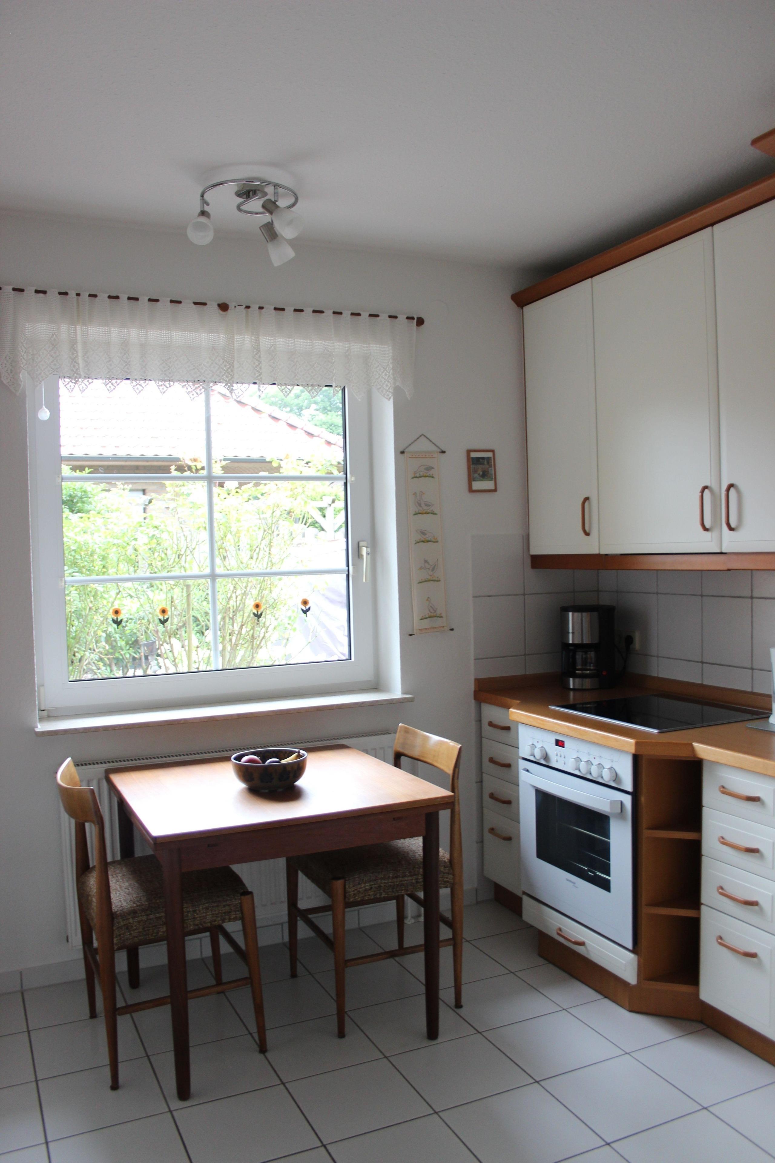 Zur Küche gehören u.a. ein Elektroherd mit Cerankochfeld, Spül- und Kaffeemaschine, Wasserkocher und Toaster und ausreichend Geschirr und Töpfe.