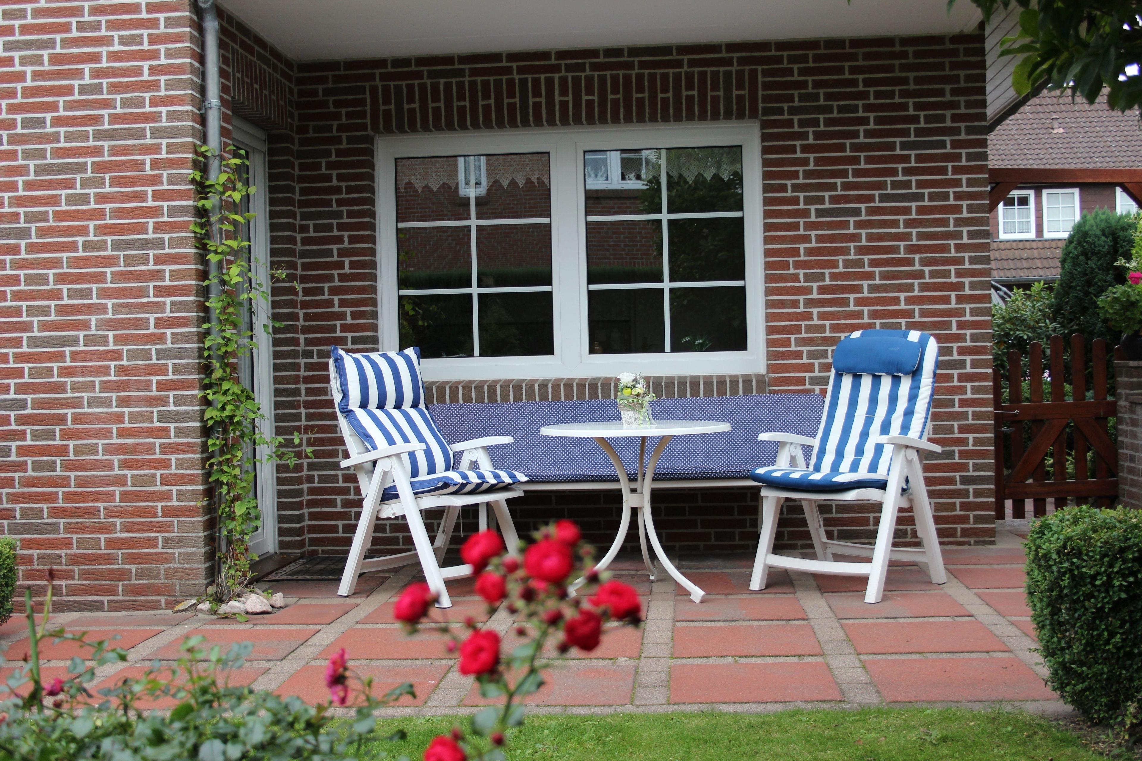 Über das Wohnzimmer erreichen Sie die Terrasse des eingezäunten Gartens mit Gartenhäuschen, indem Sie Ihre mitgebrachten Fahrräder trocken unterstellen können. Gartenmöbel und Liegen mit Auflagen finden Sie ebenfalls dort.