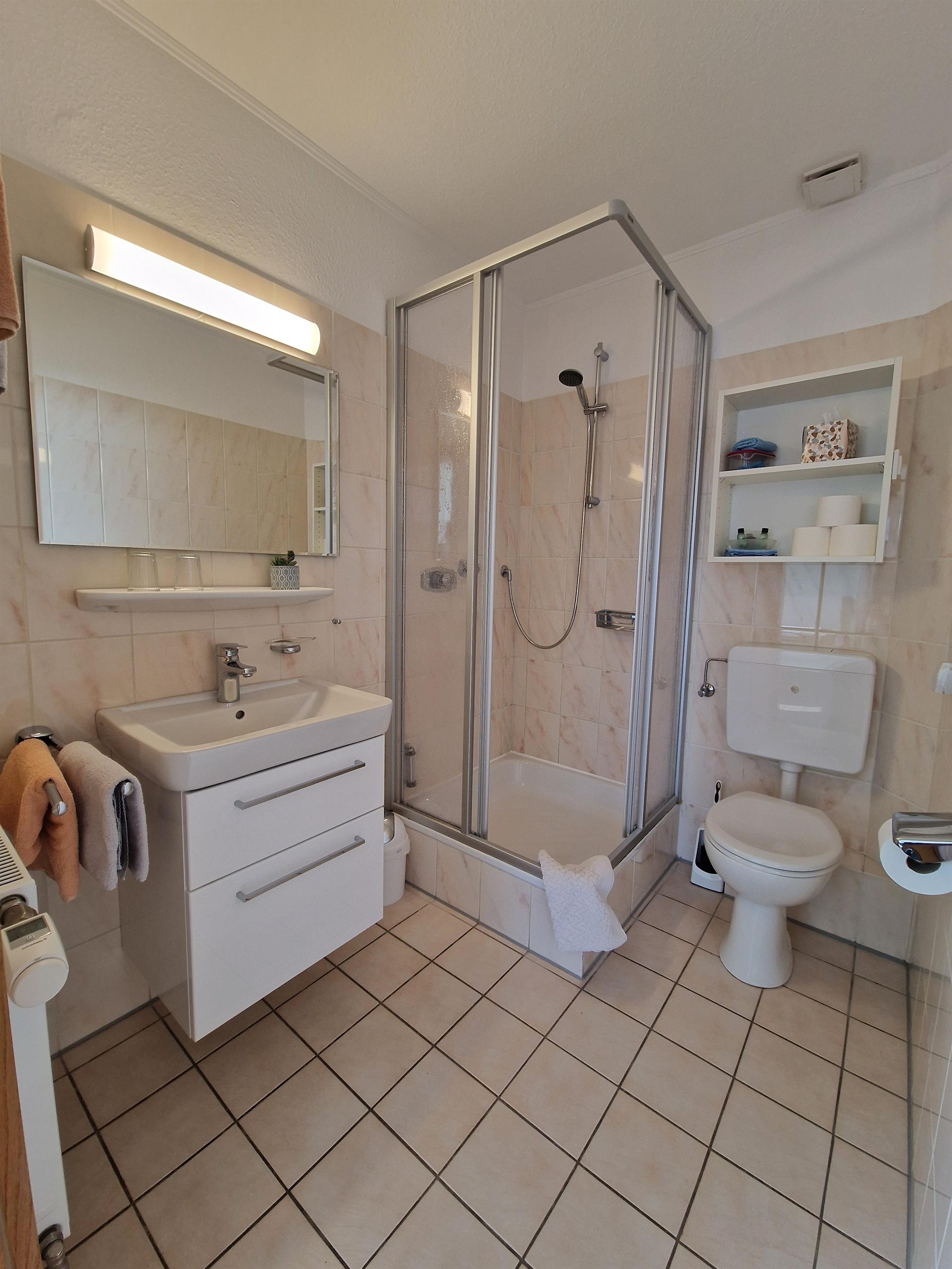 In der gut ausgestatteten Küche können Sie kleine Speisen zubereiten, um sich für Ihre Abenteuer zu stärken. Ein Bad mit Dusche rundet das Angebot unserer Ferienwohnung ab und sorgt für zusätzlichen Komfort.