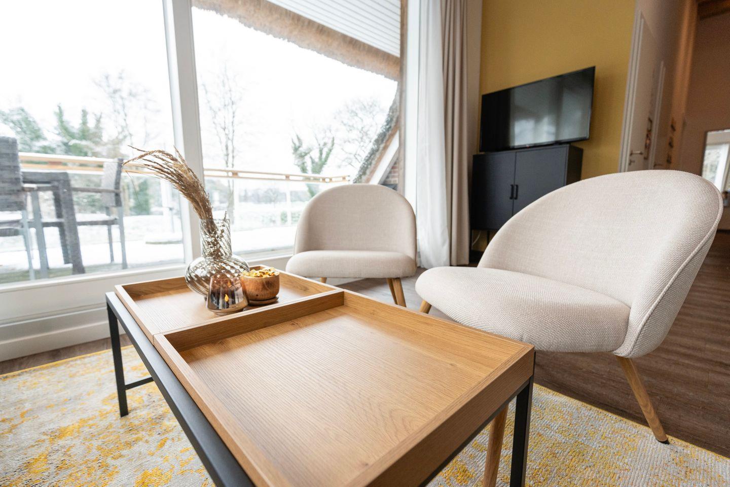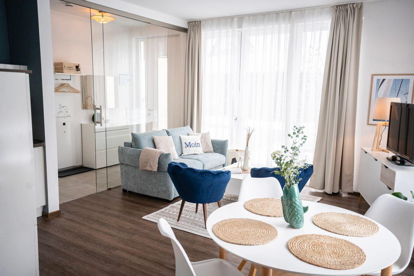 In den Wohnzimmern wartet neben einer gemütlichen Schlafcouch und einer einladenden Sitzecke mit Sofa und TV auch ein Arbeitsplatz mit Schreibtisch und schnellem WLAN auf dich – falls du doch mal ein paar Dinge erledigen musst.