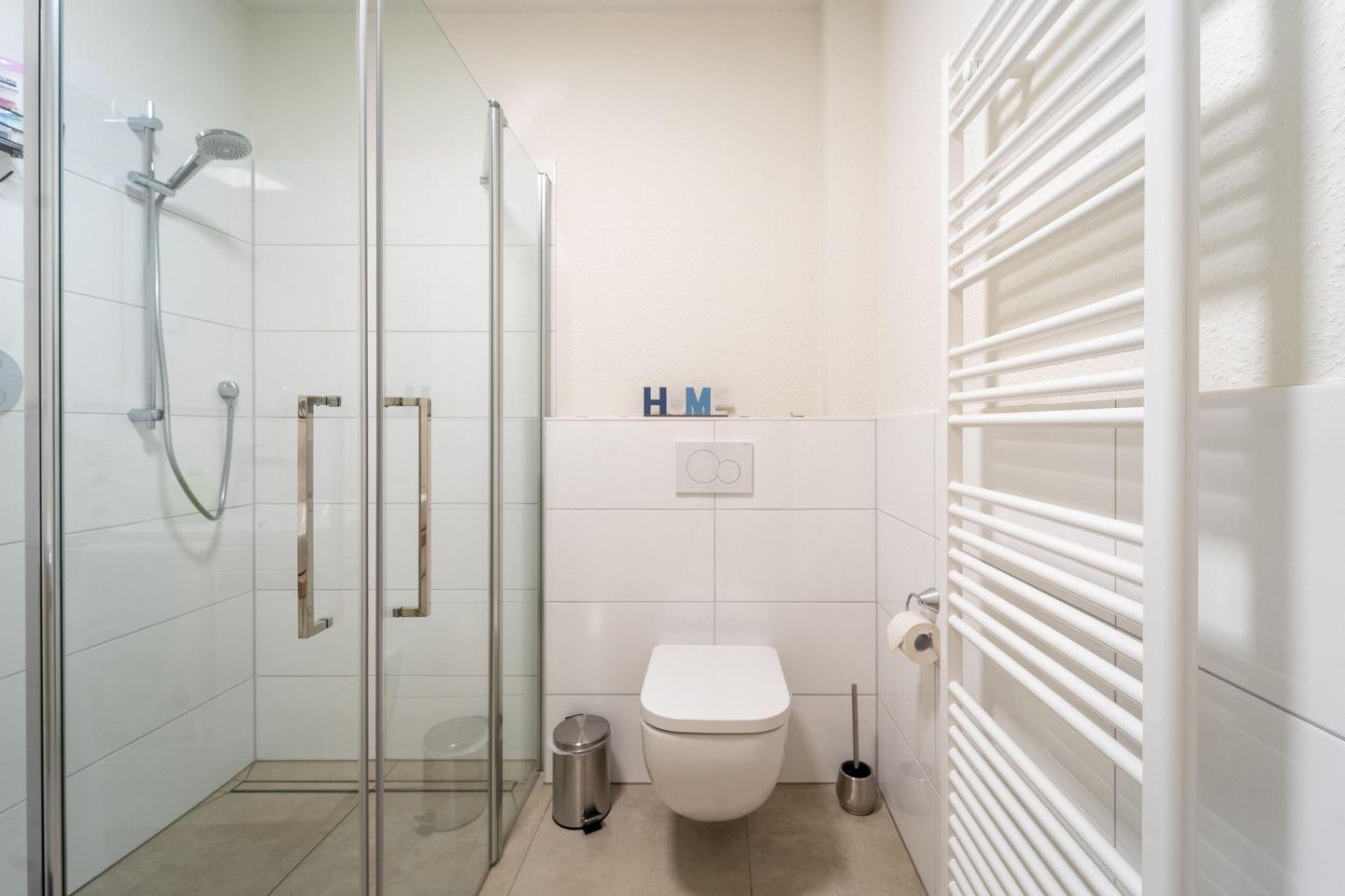 Die Ferienwohnung „Weißer Weg“ bietet auf 81 qm modernen Komfort und viel Platz für bis zu vier Personen. Der offene Wohnbereich mit großer Fensterfront und Zugang zum Balkon ist hell und freundlich gestaltet. Hier befinden sich eine gut ausgestattete Küche mit Ofen, Geschirrspüler, Herd, Kühlschrank und Gefrierschrank, ein Essbereich und ein gemütliches Wohnzimmer mit großem Smart TV. Die Wohnung verfügt über zwei Schlafzimmer – eines mit einem komfortablen Doppelbett und das andere mit zwei Einzelbetten – sowie ein modernes Badezimmer mit bodengleicher Dusche.