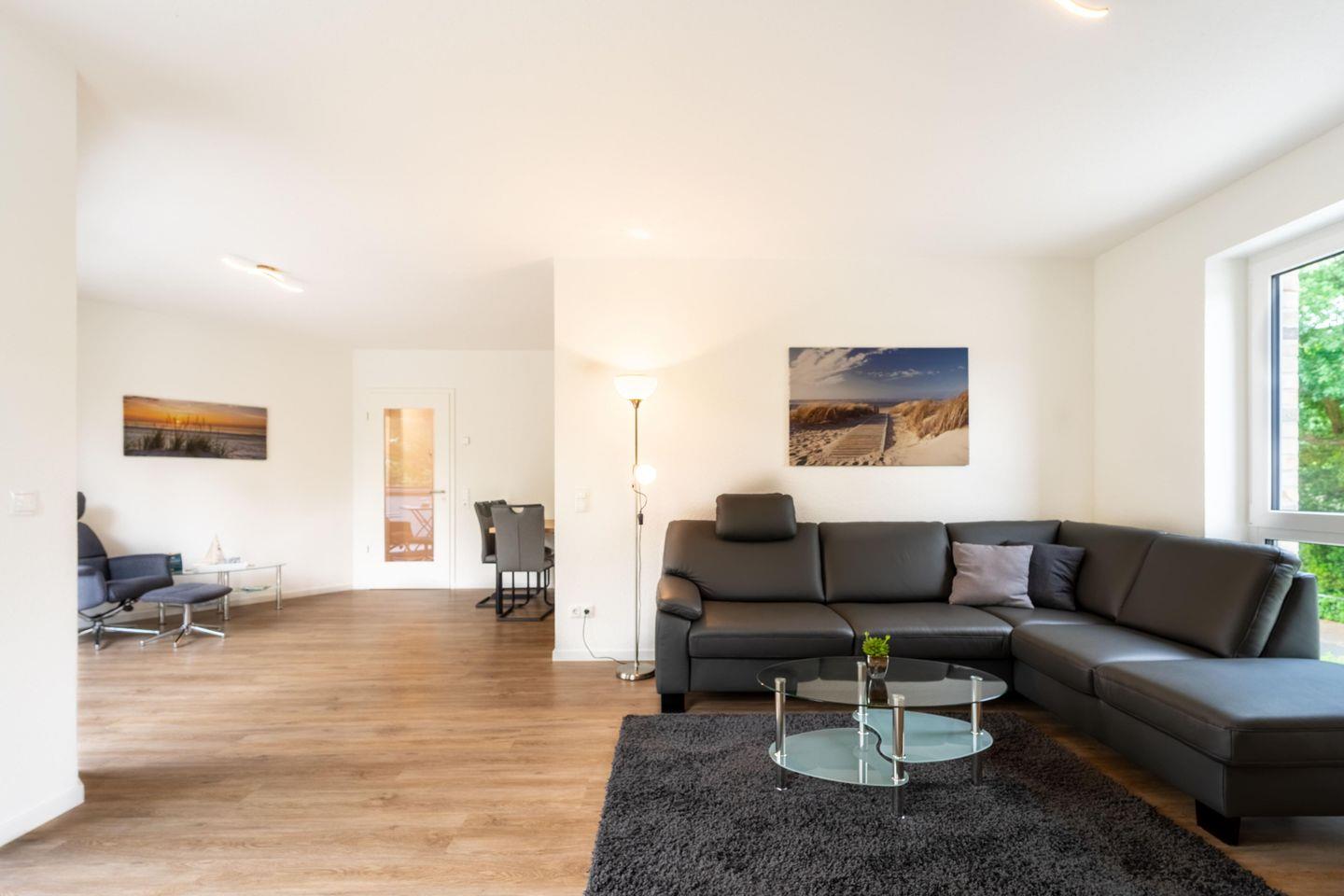 Die Ferienwohnung „Weißer Weg“ bietet auf 81 qm modernen Komfort für bis zu vier Personen. Der offene Wohnbereich mit Balkonzugang, große Fensterfront, gut ausgestatteter Küche, Essbereich und Wohnzimmer mit Smart TV ist hell und freundlich. Zwei Schlafzimmer und ein modernes Badezimmer mit bodengleicher Dusche runden das Angebot ab. Highlights sind der windgeschützte Balkon, ein Kabuff für Fahrräder und kostenfreie SUP-Boards.