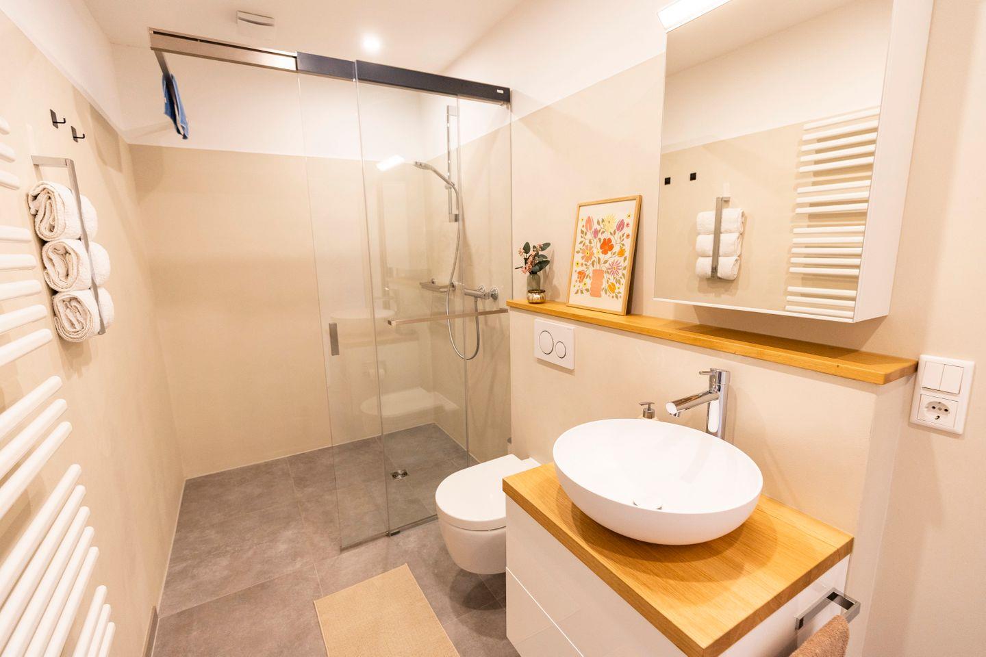 Das moderne Bad mit bodengleicher Dusche ist ebenso barrierefrei wie der Rest der Wohnung. Handtücher, Bettwäsche und Pflegeprodukte stellen wir dir natürlich zur Verfügung.