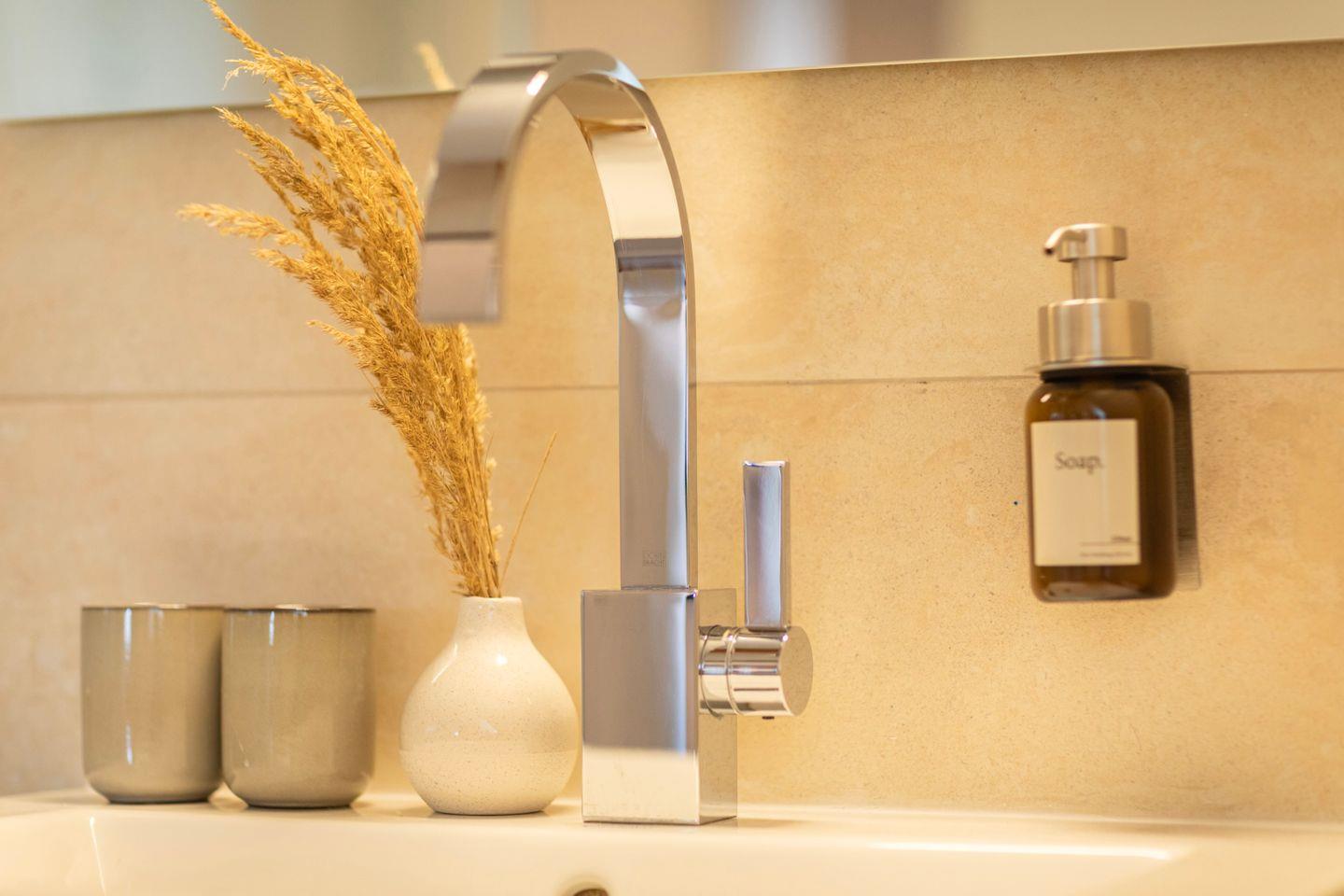Beginne Deinen Tag mit leckerem Kaffee und genieße all die Annehmlichkeiten dieses Apartments, einschließlich der großen Terrasse mit exklusivem Seeblick, großzügigen Sitzbereichen für 4 Personen, einem Grill und Zugang zur Sauna auf der Anlage. Die Wohnung ist inspiriert vom Element Wasser, was sich in einem ruhigen und erfrischenden Interior-Design widerspiegelt.