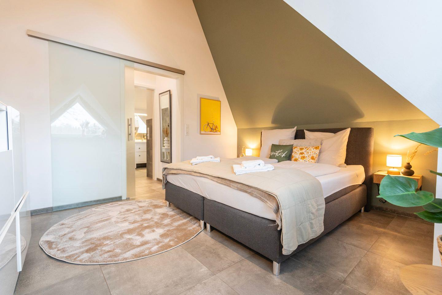 Das erste Schlafzimmer bietet ein gemütliches 1,80m Doppelbett. Im zweiten Schlafzimmer findest du ein bequemes queensize Bett. Im Wohnzimmer befindet sich ebenfalls noch eine Schlafcouch. Hier erlebst Du, ideal für Familienbesuche, einen großen und bequemen Sitzbereich mit Sofa und TV. Zusätzlich gibt es einen Arbeitsplatz mit Schreibtisch und schnellem Internet, perfekt für produktive Stunden oder als Homeoffice.