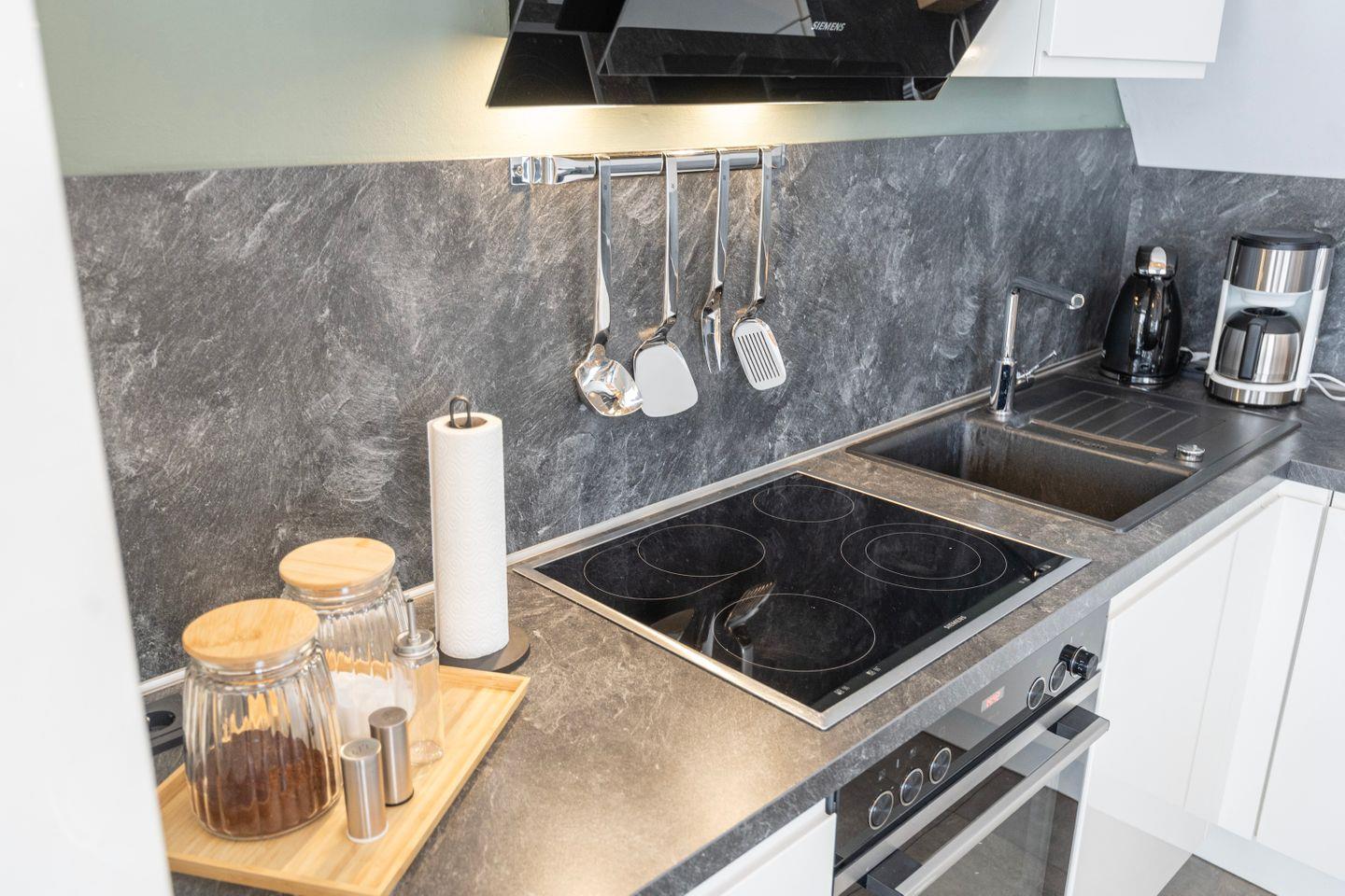 Die Küche ist voll ausgestattet mit Herd, Kühlschrank, Backofen, Spülmaschine, Mikrowelle und allem, was Du zum Kochen brauchst. Zusätzlich steht eine Waschmaschine zur Verfügung.