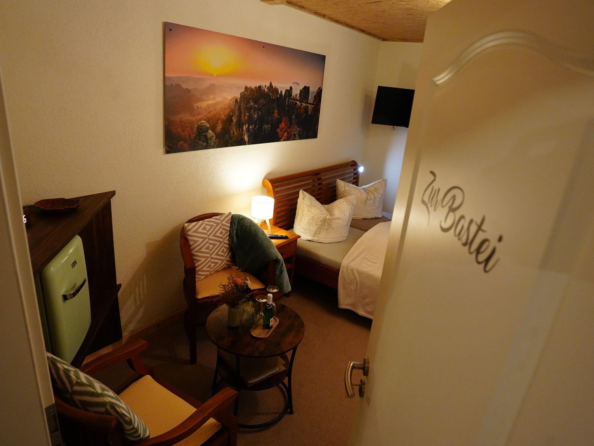 Das Zimmer Bastei ist mit einem Doppelbett und einer kleinen Sitzecke sowie Dusche und WC eingerichtet.