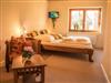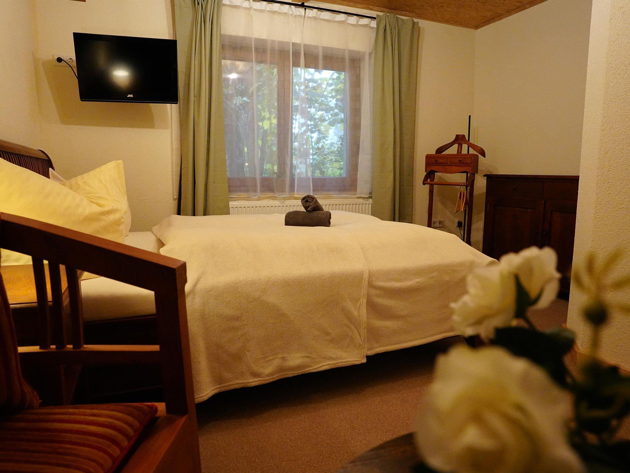 Das Zimmer Königstein ist mit einem Doppelbett und einer kleinen Sitzecke sowie Dusche und WC eingerichtet.