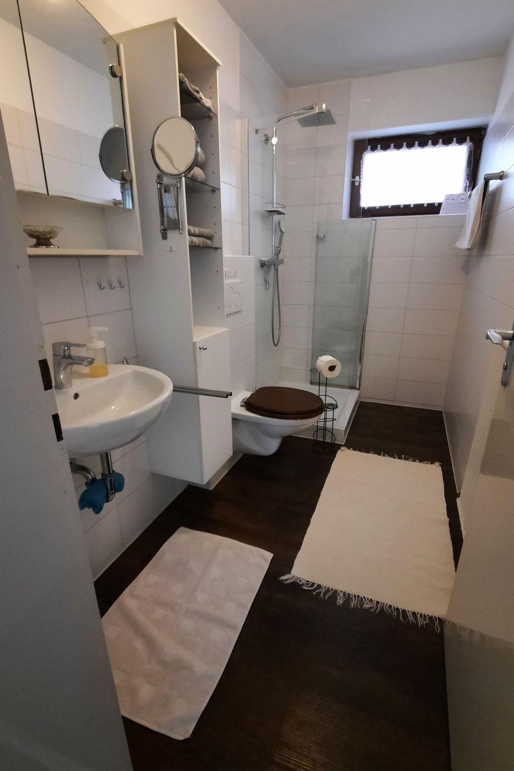 The bathroom has a shower, a WC and a washbasin, a spacious linen cupboard, a mirror cabinet, a hairdryer and make-up mirror. Towels and hand sanitiser are provided.