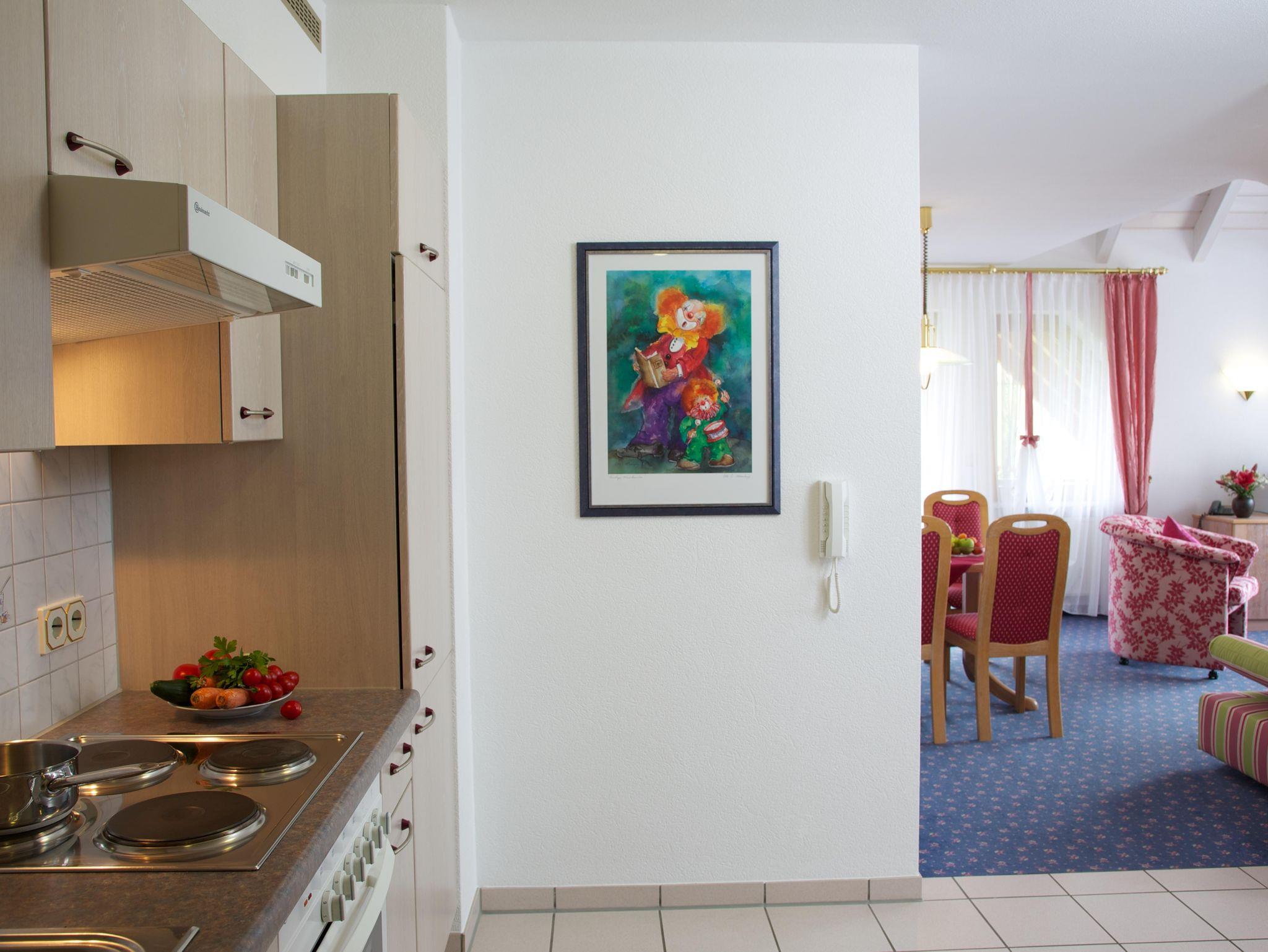 Wohnung Typ A im Landhaus, Südseite, 2 Personen mit getrenntem Wohn- und Schlafraum 55 qm, DU/WC, Föhn, Küchenzeile, Spülmaschine, Balkon, Kabel-TV, Radio, Safe und Direktwahltelefon.