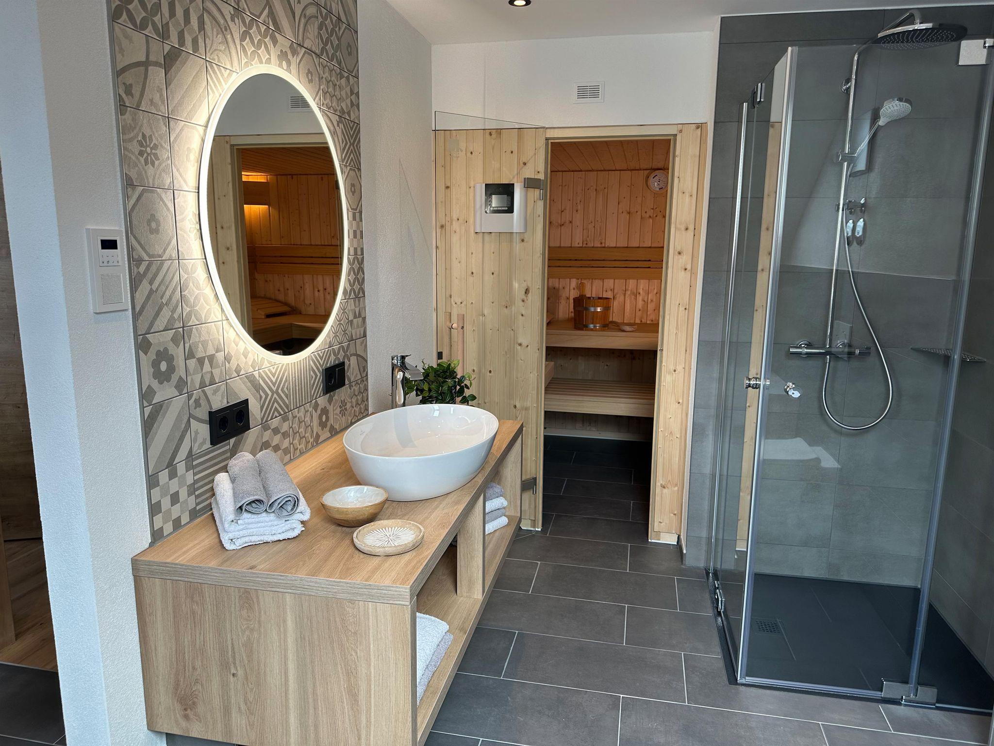Die 118 m² große Wohnung mit Fußbodenheizung ist modern und mit Wohlfühlcharakter eingerichtet. Das EG ist barrierefrei und besteht aus einem Wohn-Esszimmer mit Kaminofen, einer komplett ausgestatteten Küche, einem Bad und einem Schlafzimmer mit einem Doppelbett 180x200cm mit TV. Zwei Einzelzimmer, ein Schlafzimmer mit einem Bett 160x200 cm mit TV und ein Badezimmer mit Sauna befinden sich im DG.