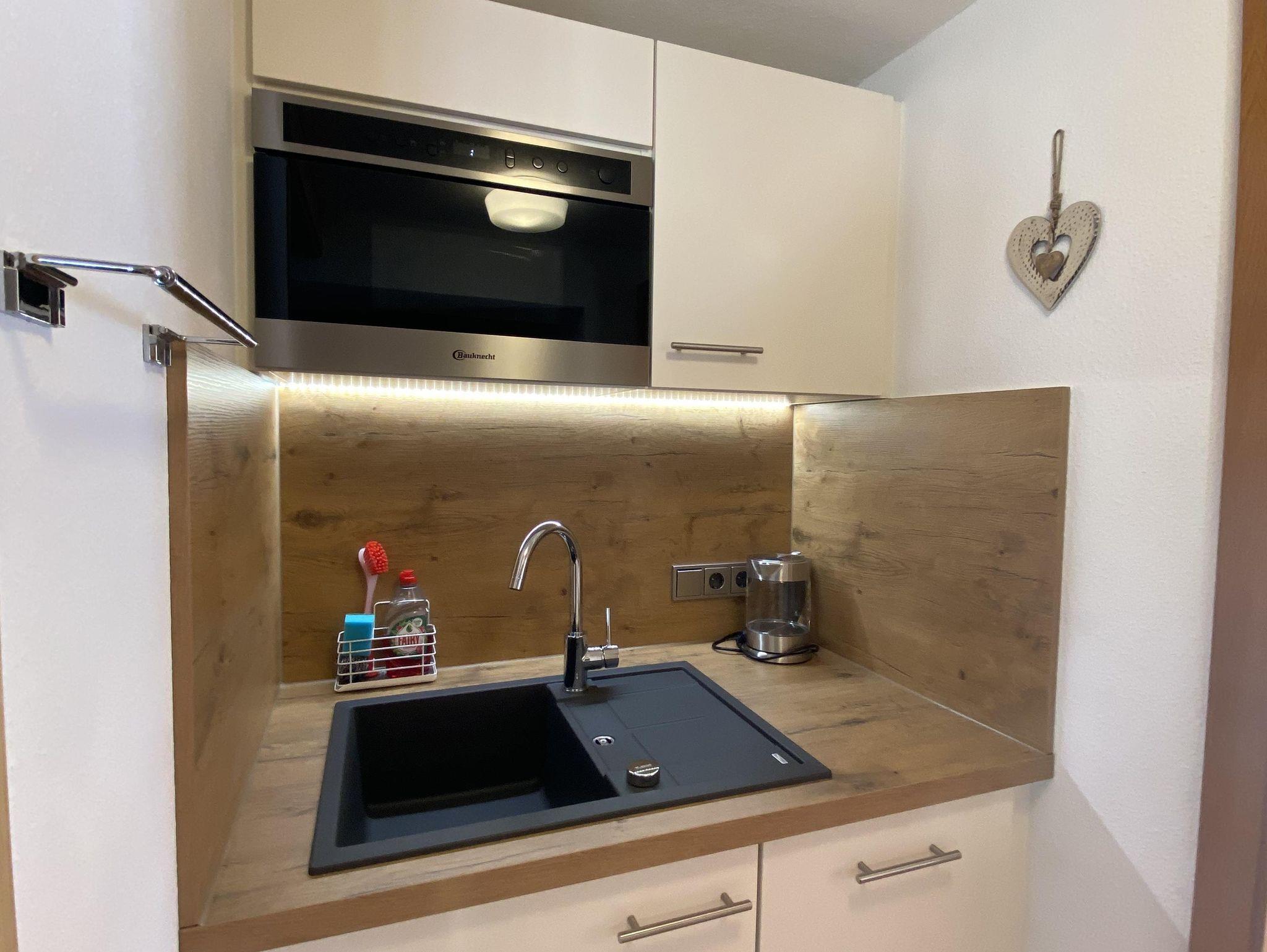 2-Zimmer-Ferienwohnung mit möbliertem Balkon, Sonnenschirm, Schlafzimmer mit lichtundurchlässigen Vorhängen, Morgensonne im Schlafzimmer, gut ausgestattete Küche mit Vierplatten Ceranfeld, Spülmaschine, Kühlschrank mit ***Gefrierfach, Mikrowelle mit Grillfunktion, Wasserkocher, Toaster, Senseo Kaffeepadmaschine, Bad mit Dusche/WC, Essecke mit Eckbank, Couch, SAT-TV, Radio/CD Anlage, kostenloses WLAN