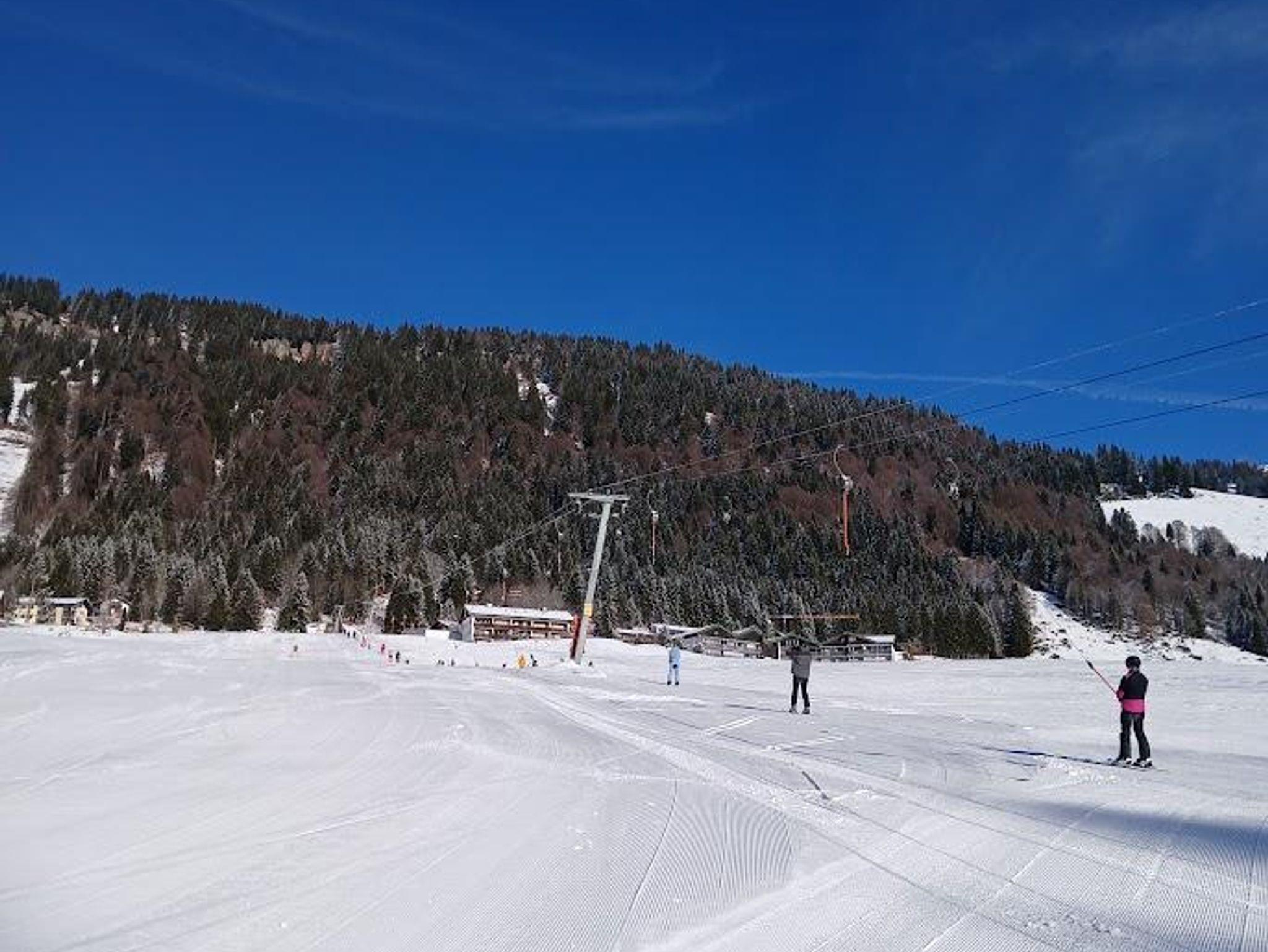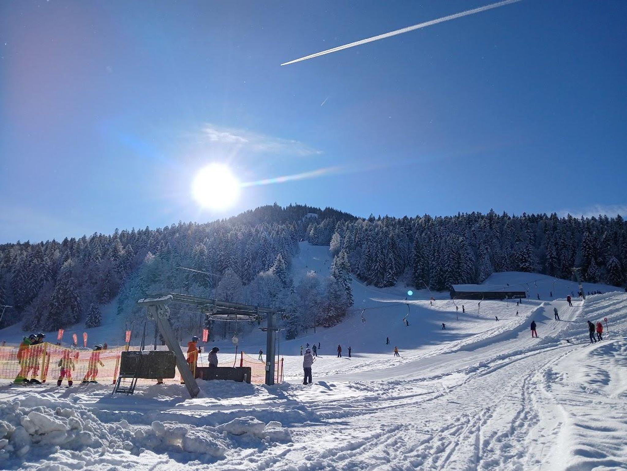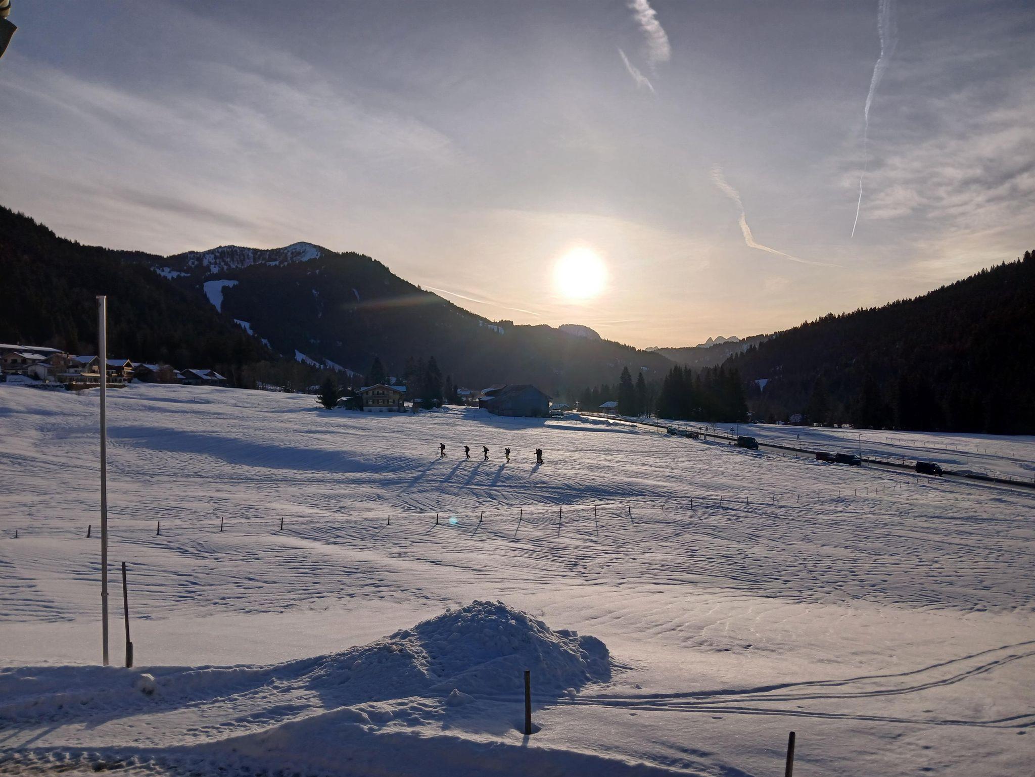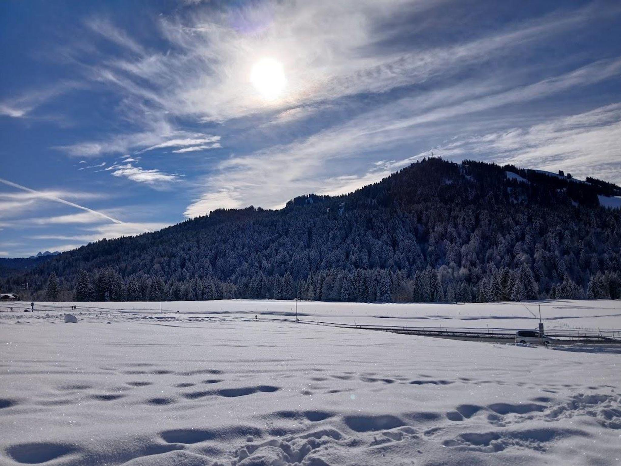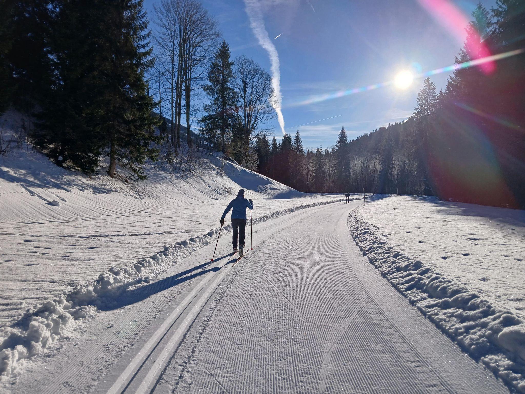 Helle, freundlich gestaltete Ferienwohnung mit gemütlicher Raumaufteilung und viel Platz zum Entspannen. Große Fenster laden ein, die warmen Sonnenstrahlen und das beeindruckende Winterpanorama mit Blick auf die Berge und die Langlaufloipe zu genießen.
