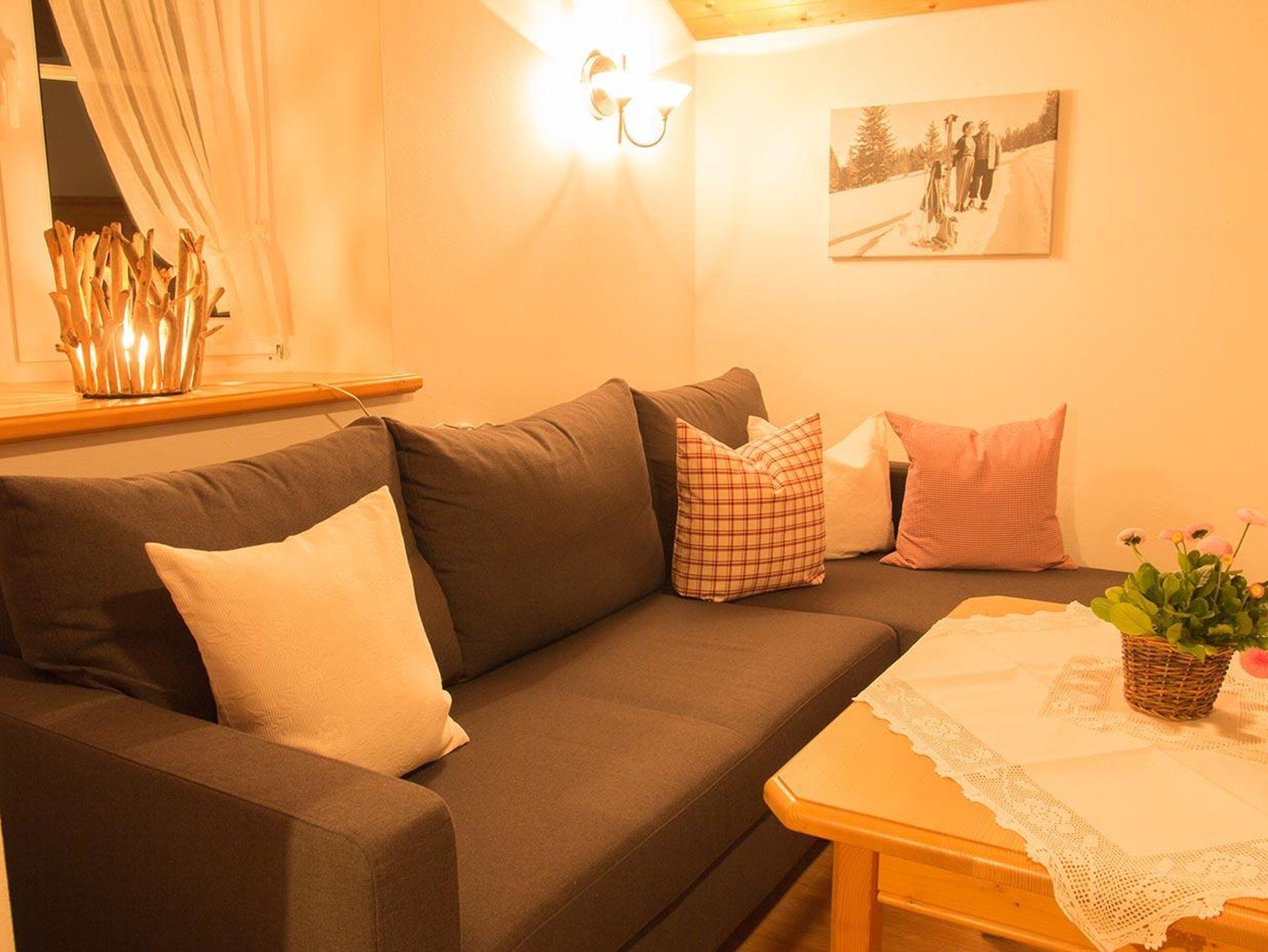 52 m², für 1 - 2 Personen, Schlafzimmer mit Doppelbett (Kinderbett kann dazugestellt werden), Wohnraum mit Kachelofen und Ofenbank, gemütliche Couchgarnitur Essecke, sehr gut ausgestattete Küchenzeile (Ceranfeld, Kühlschrank mit ***Gefrierfach, Backofen, Mikrowelle, Spülmaschine), LED-TV, Radio-CD, Ostbalkon mit Möblierung.