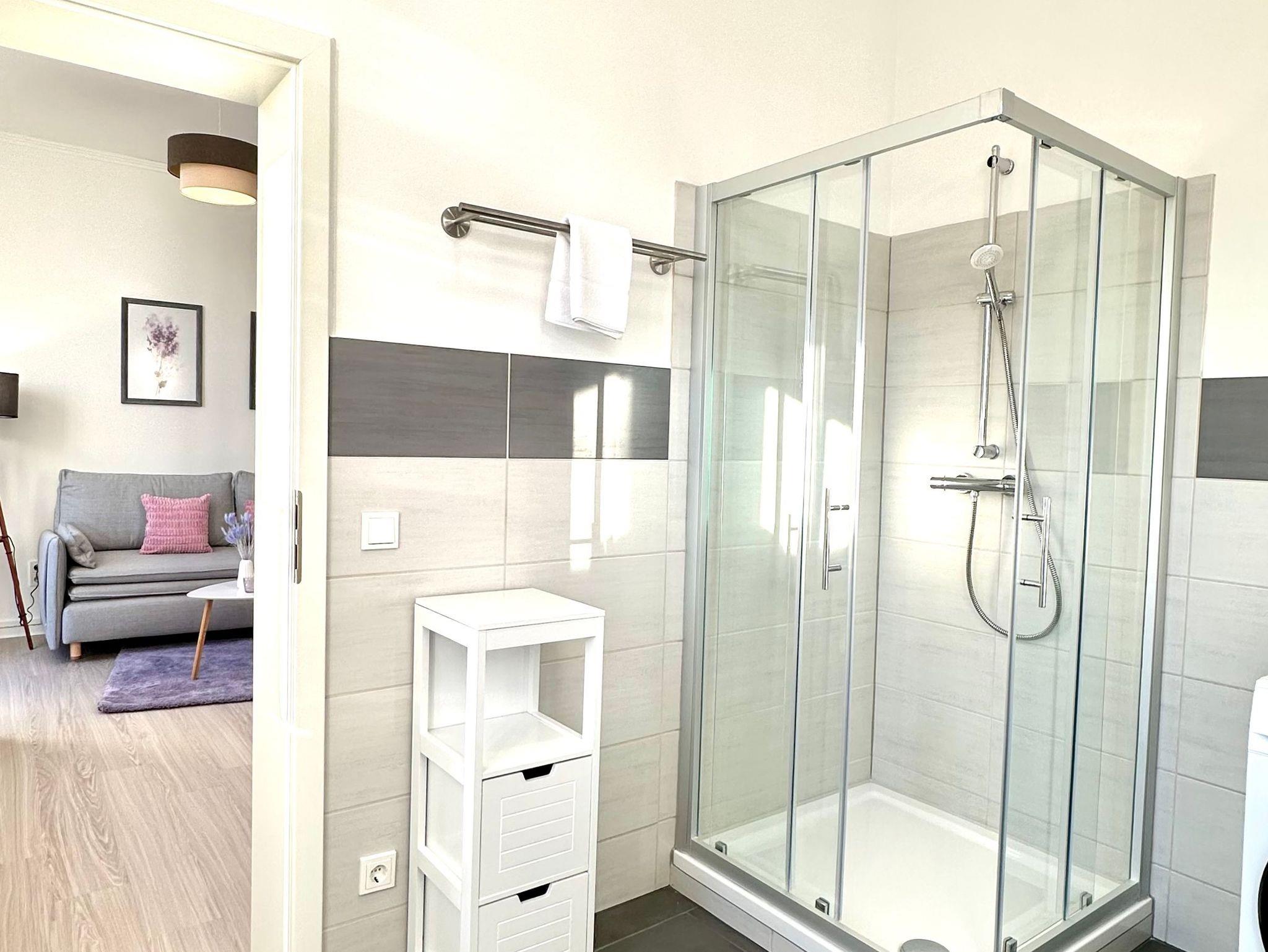 Das geschmackvolle Badezimmer ist mit einer Duschkabine, Haartrockner, einer Waschmaschine und Handseife sowie WC-Papier ausgestattet.
