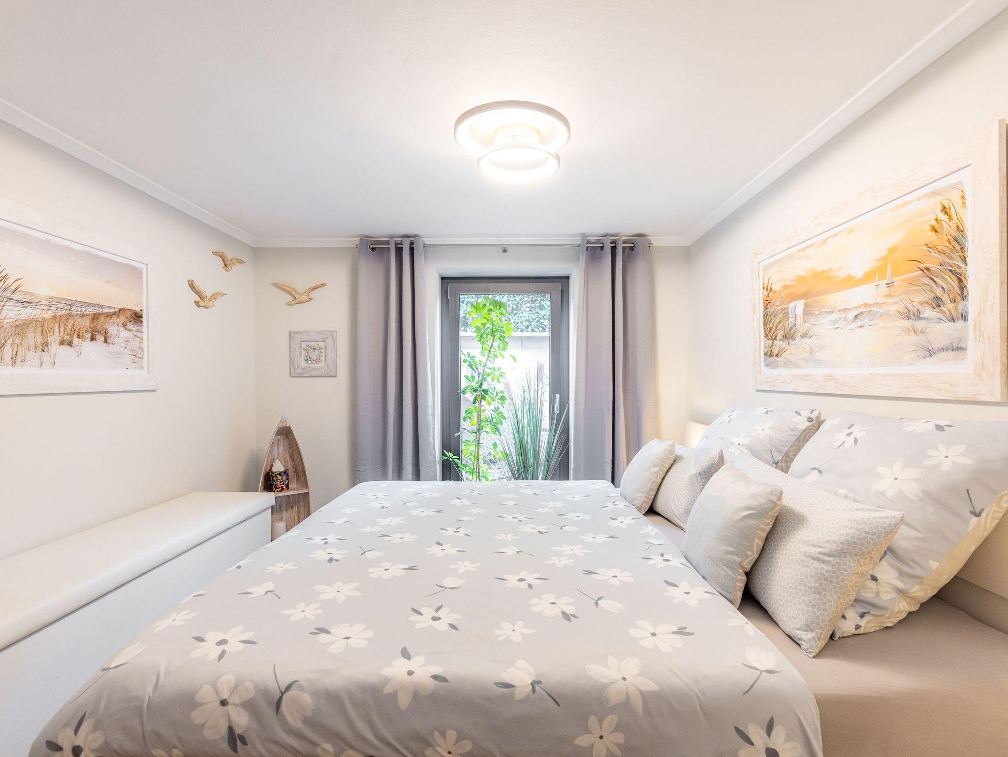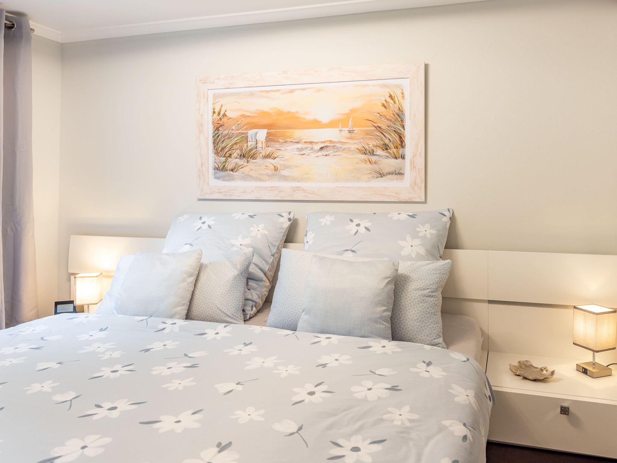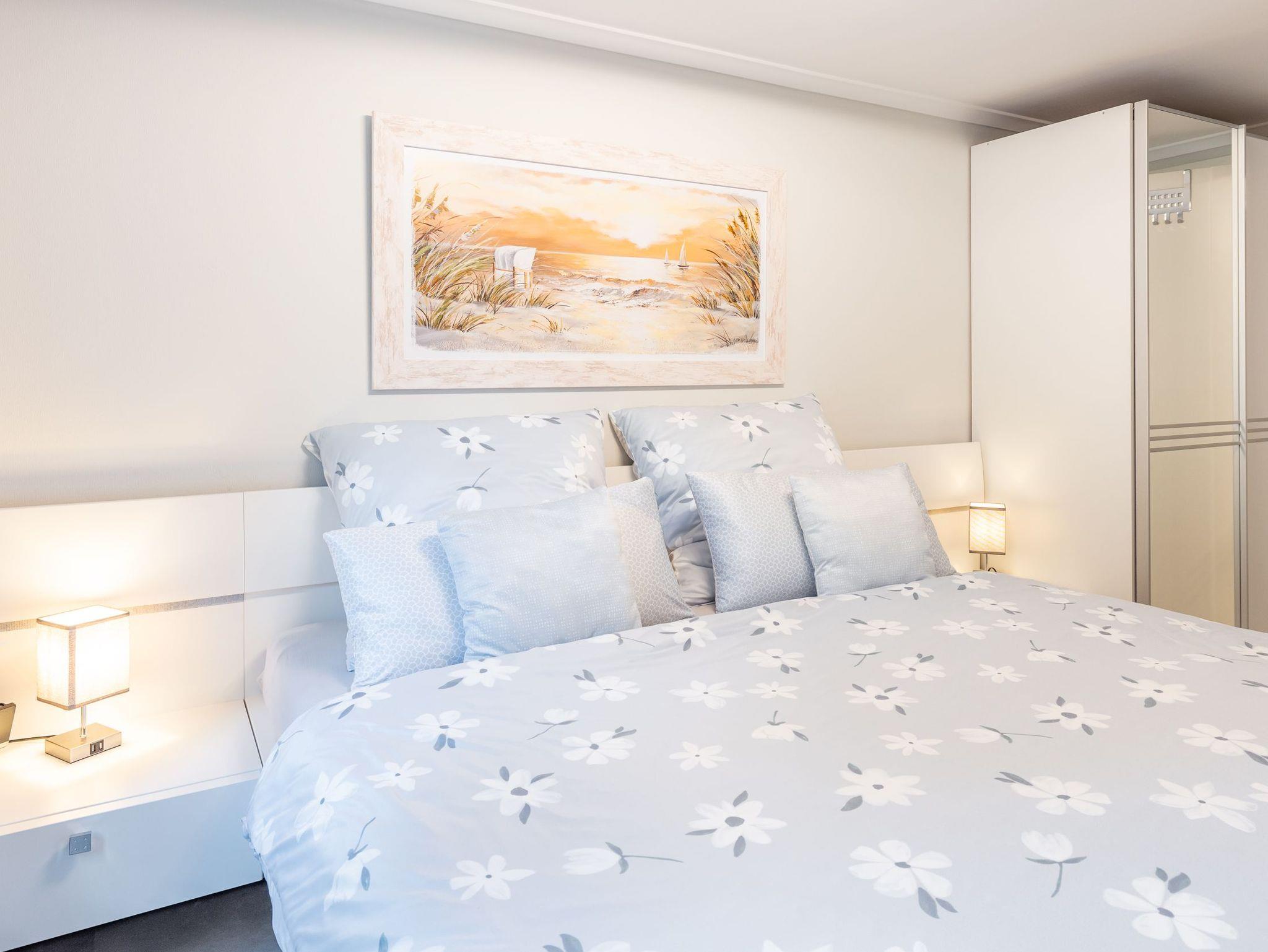 Die 3-Raum-Ferienwohnung ist sehr hochwertig, modern und hell mit Vinylboden und Fußbodenheizung ausgestattet. Die Betten, 1 Doppelbett (1.80x2.00m, mit Lattenrost) und 1 Kojenbett (0.90x2.00m, mit Schubladen) sind mit Bettdecken in Komfortgröße ausgestattet. Optional steht für das Kojenbett ein Rausfallschutz zur Verfügung.