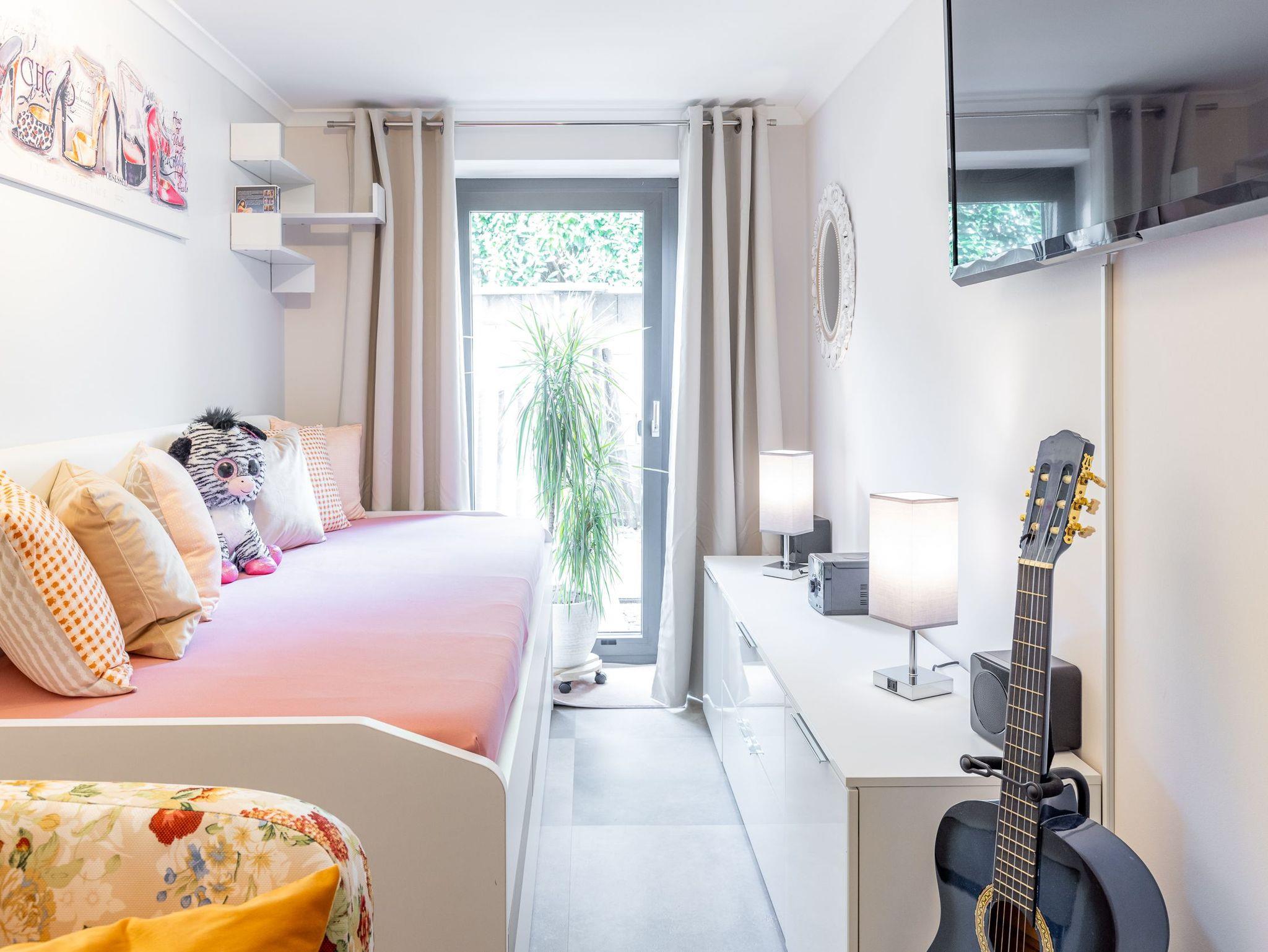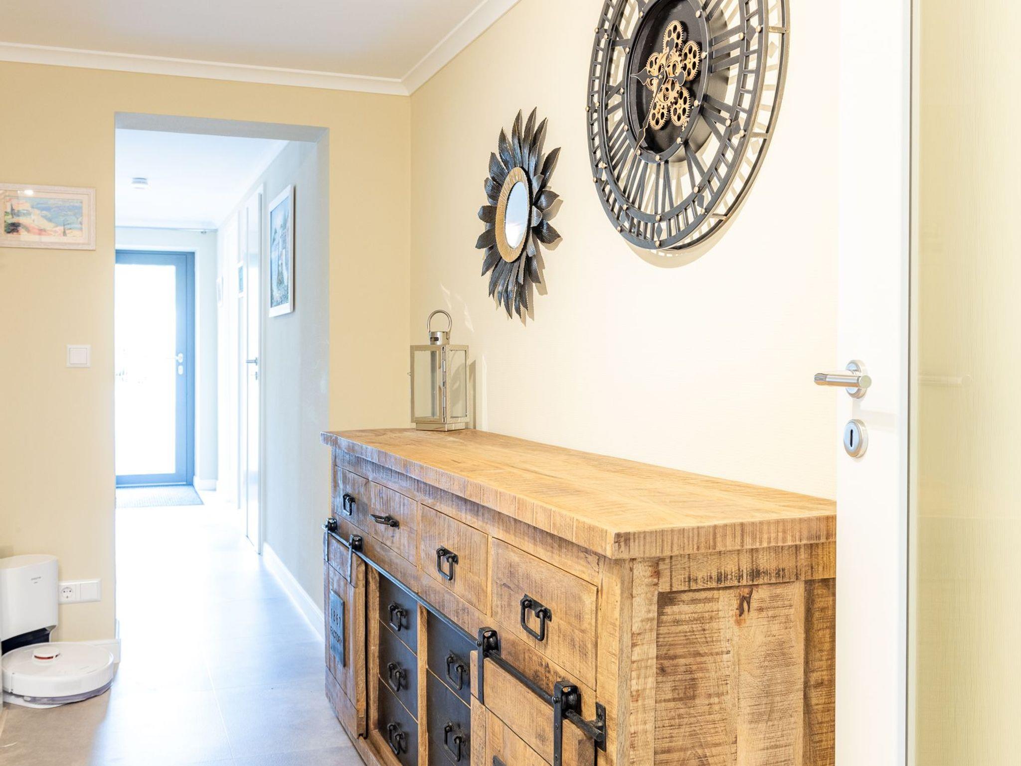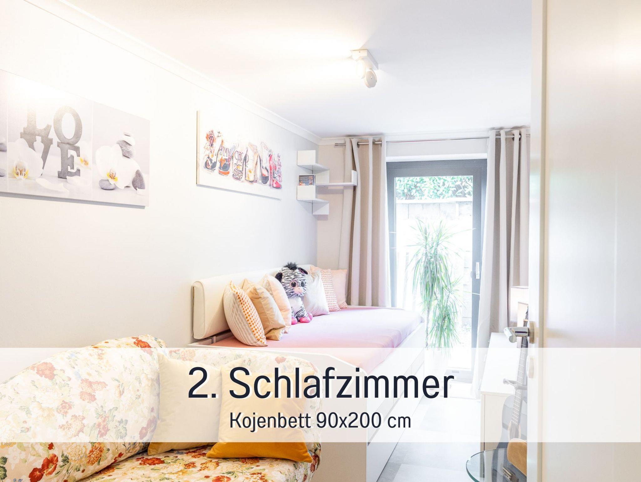 Die 3-Raum-Ferienwohnung ist sehr hochwertig, modern und hell mit Vinylboden und Fußbodenheizung ausgestattet. Die Betten, 1 Doppelbett (1.80x2.00m, mit Lattenrost) und 1 Kojenbett (0.90x2.00m, mit Schubladen) sind mit Bettdecken in Komfortgröße ausgestattet. Optional steht für das Kojenbett ein Rausfallschutz zur Verfügung.