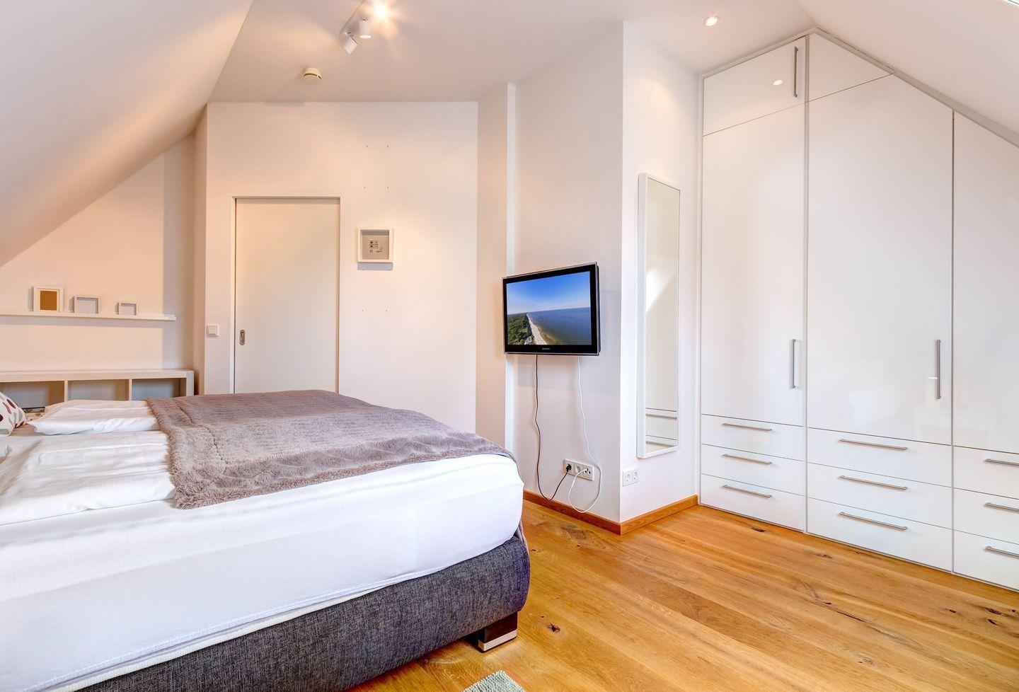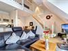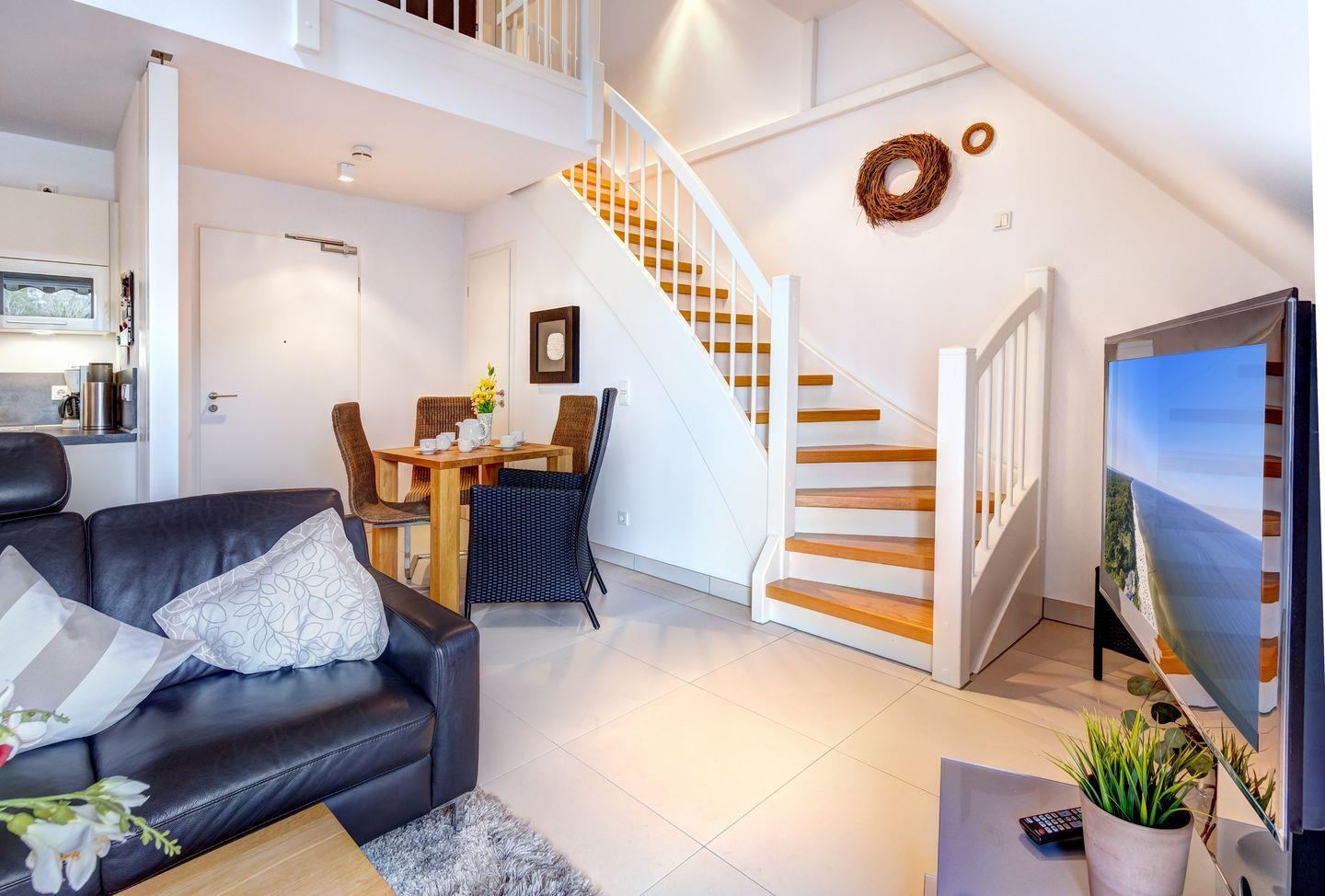 Diese 62 Quadratmeter große Wohnung bietet Ihnen ein einzigartiges Wohnambiente. Der Wohn-Essbereich erstreckt sich bis zum offenen Giebel und öffnet sich zu einem Balkon mit malerischem Blick auf das Achterwasser. Ein gemütliches Schlafzimmer mit einem komfortablen Box-Spring-Doppelbett und eine Galerie mit einer Schlafcouch bietet Platz für bis zu 4 Personen mit Kleinkind.