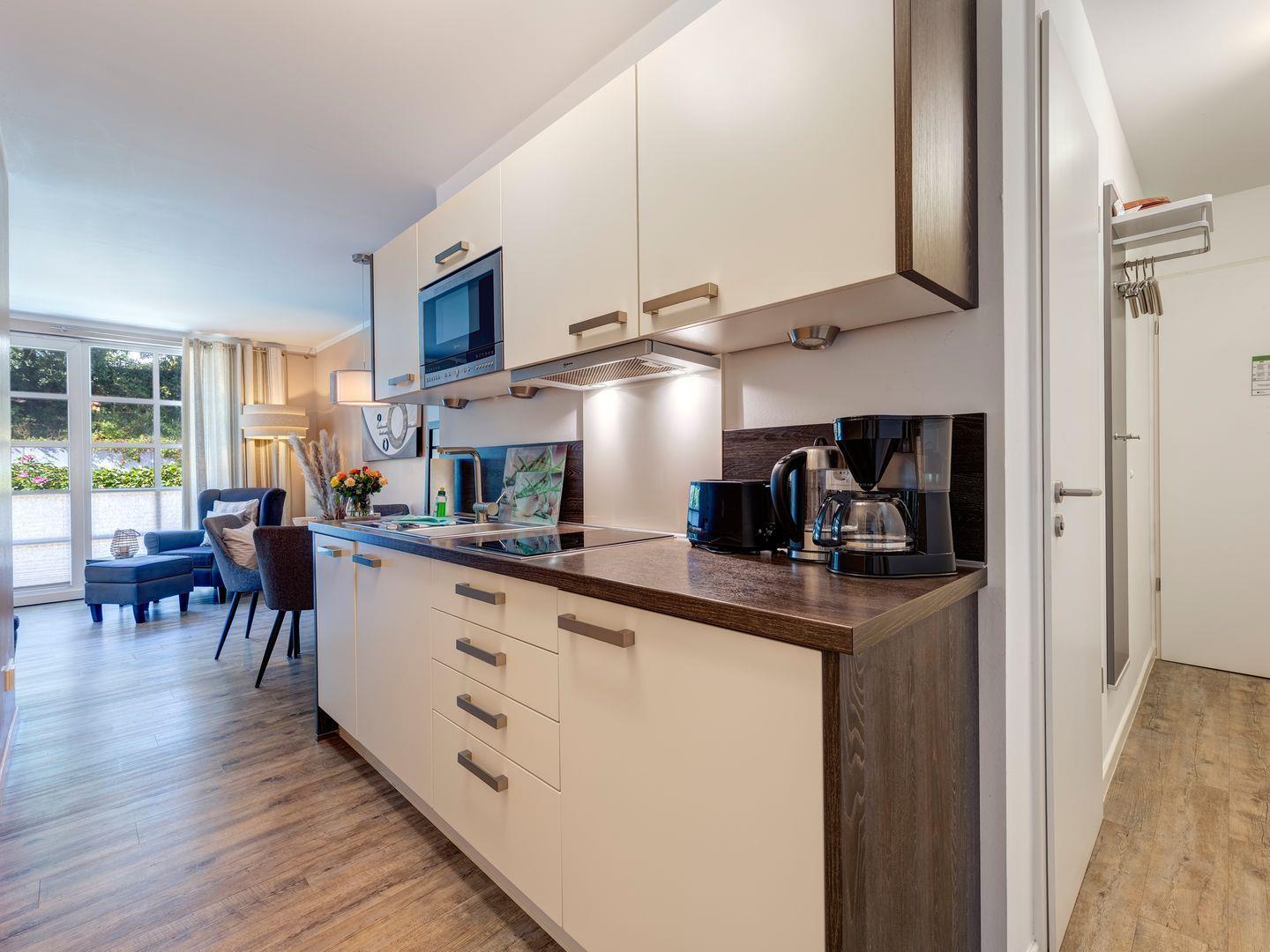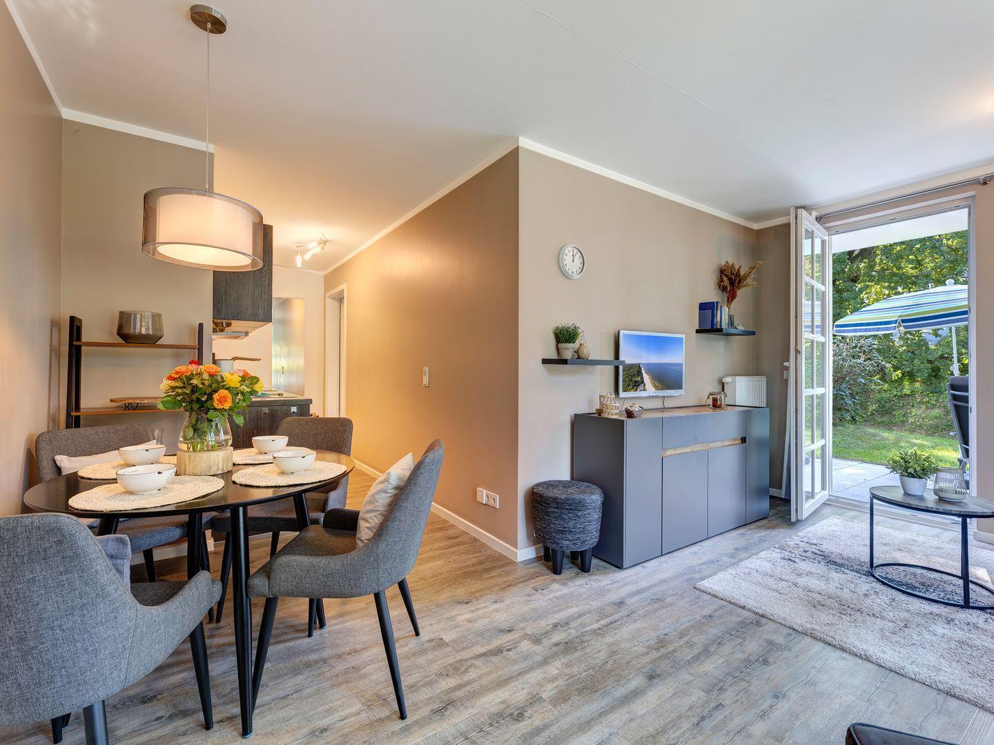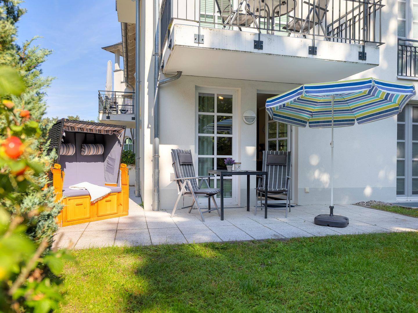 Die 47 qm große Wohnung bietet Ihnen Ruhe und Erholung in einer großzügigen, lichtdurchfluteten Wohnatmosphäre. Der großzügige Wohnbereich lädt zum Verweilen ein und öffnet sich zu einer sonnigen Terrasse. Genießen Sie Ihre Urlaubszeit geschützt unter einer Überdachung im eigenen Strandkorb an der frischen Luft. Hier können Sie die Seele baumeln lassen und die malerische Umgebung in vollen Zügen genießen.