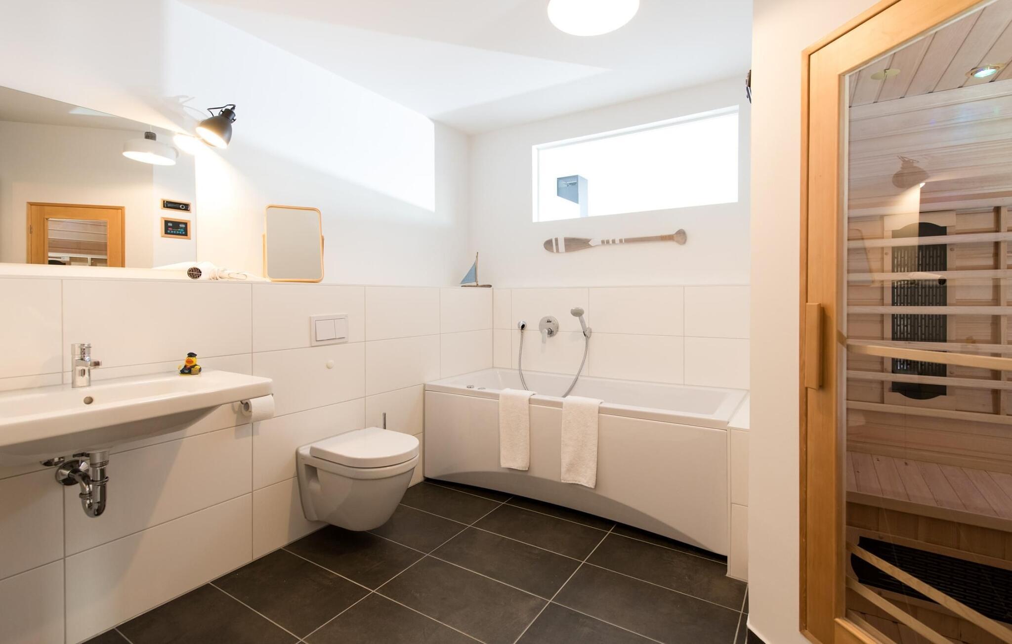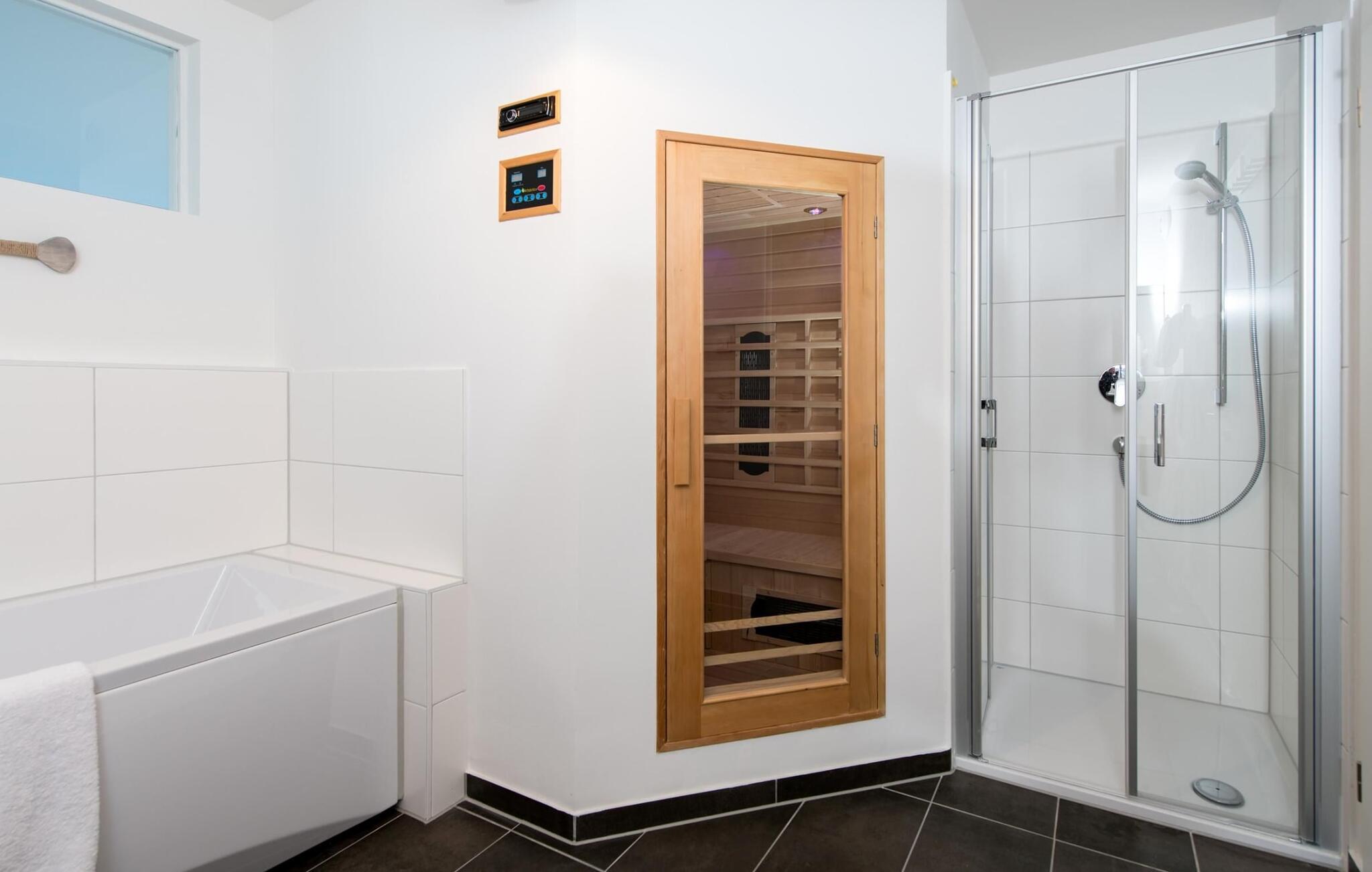 Wellness elskere vil få for pengene, infrarød varmekabine med hi-fi lydsystem og LED farvelysterapi samt et afslapningsspabad inviterer jer til at slappe af efter en gåtur på stranden. Der er også et brusebad på gulvniveau.