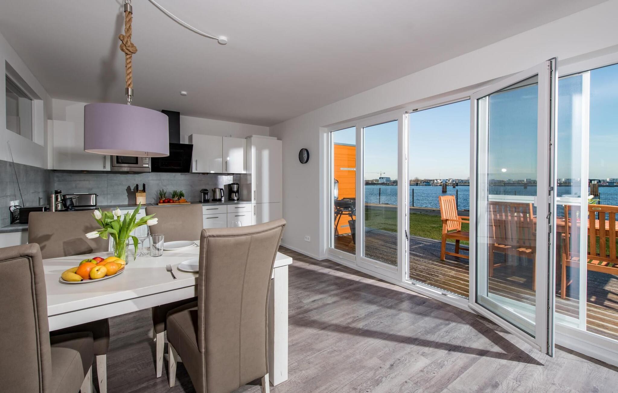 Fantastisk udsigt åbner op fra opholdsstuen og på den tilstødende terrasse med udsigt over lystbådehavnen. Havnebiografen sørger for underholdning under en hyggelig grillaften eller en romantisk middag i levende lys med en billedskøn solnedgang.