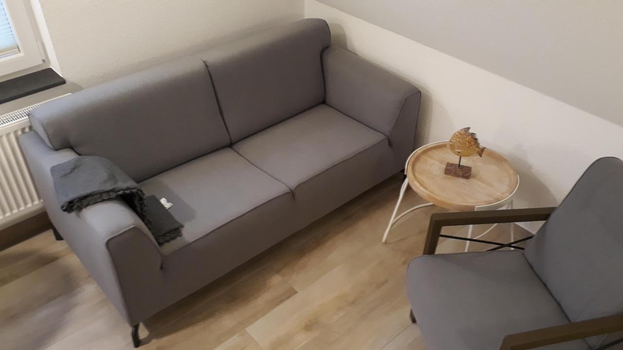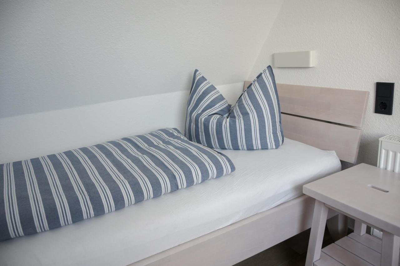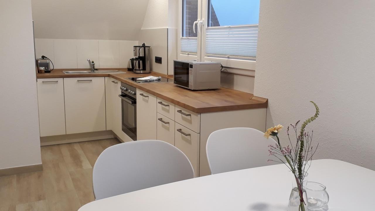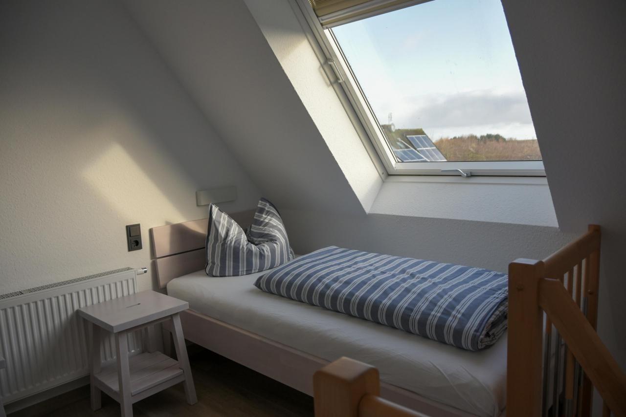Einrichtung und Ausstattung sind vergleichbar mit der Wohnung "Sonne" in diesem Haus. Renovierte Maisonettewohnung für 2-4 Personen, 1. Obergeschoss Wohn- und Essbereich mit Küchenzeile, Schlafzimmer, Badezimmer, Treppe vom Wohnbereich ins Dachgeschoss, dort befindet sich das 2. Schlafzimmer mit Meerblick. Im schönen Ostdorf gelegen, am Rande der Dünenlandschaft.