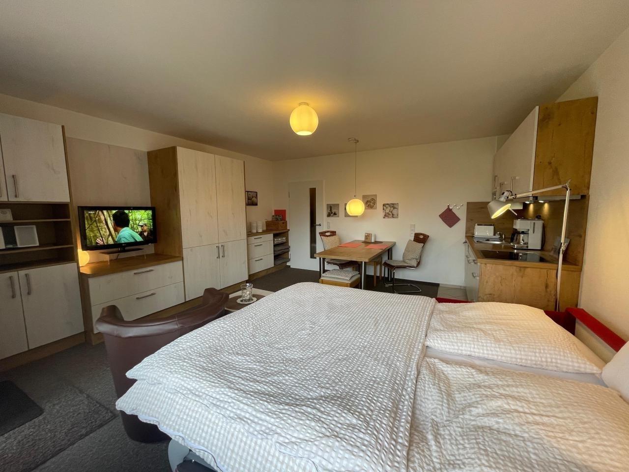 Gemütlich+liebevoll eingerichteter Wohn-Schlafraum m.Doppelschlafcouch (Liegefl.160x200cm,Gitterr.,Kaltschaumm.) Flach-TV, Hifi-Anlage/CD/Bluetooth, Küche-Ceranfeld, Kaffeem., Mikrow., Geschirrspüler, ****Kühlschrank, Duschbad+Fön, Flur-Gardrobe.