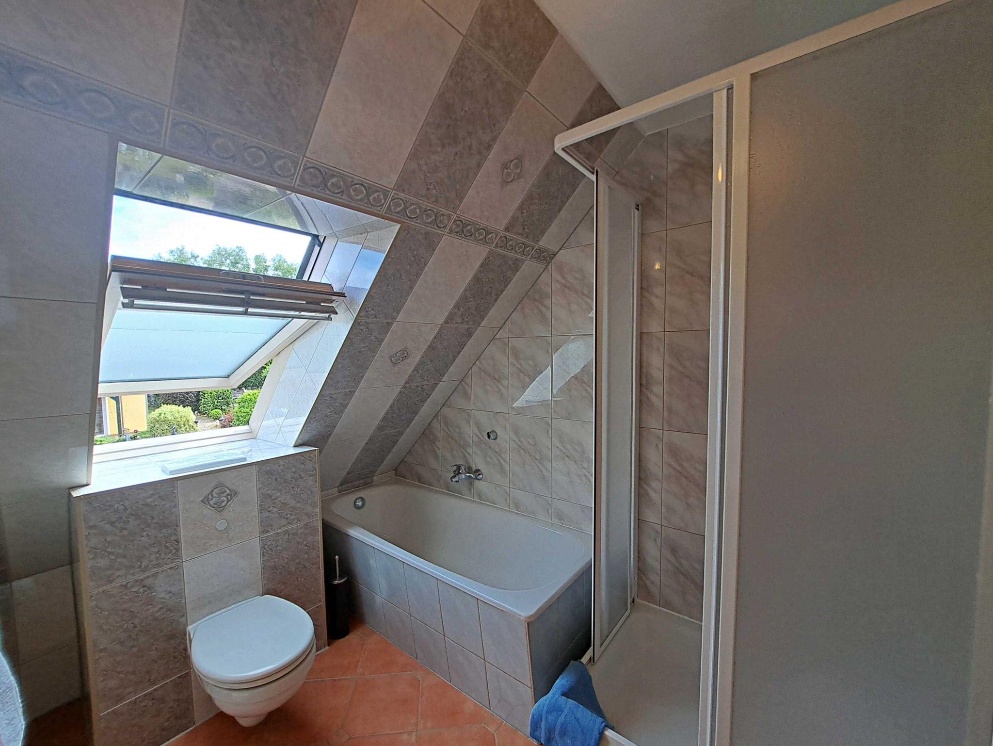 Das Tageslicht-Bad bietet sowohl eine Dusche als auch eine Badewanne und WC, ideal zum Entspannen nach einem erlebnisreichen Tag.