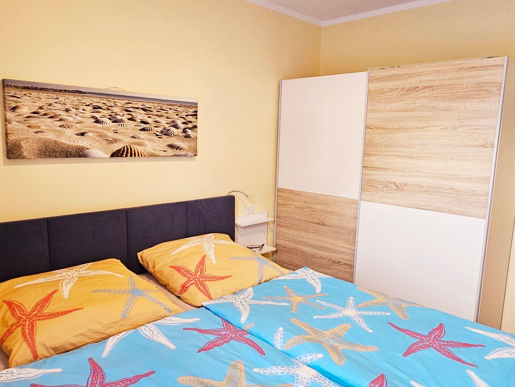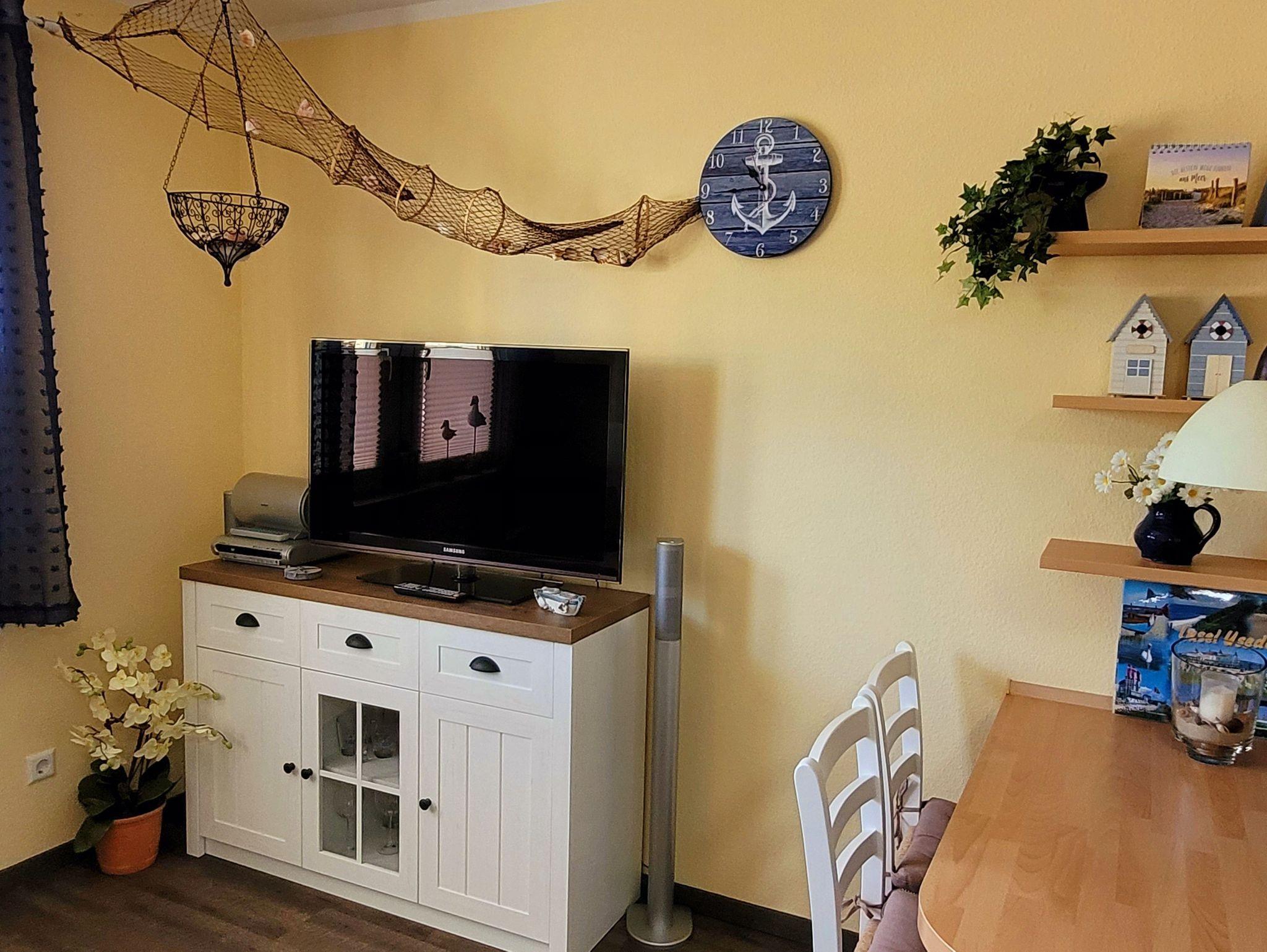 Die gemütliche maritime Ferienwohnung ist 32 qm und liegt im Erdgeschoß. Der kombinierte Wohnraum verfügt über eine gemütliche Couch, Couchtisch, Kabel-TV, Radio mit CD-Player, DVD-Player sowie eine Küchenzeile mit 4 Platten-Induktionsherd, Backofen, Spüle, Kühlschrank mit Gefrierfach, Kaffeemaschine, Toaster, Wasserkocher, Mikrowelle und einen Esstisch mit 3 Stühlen.