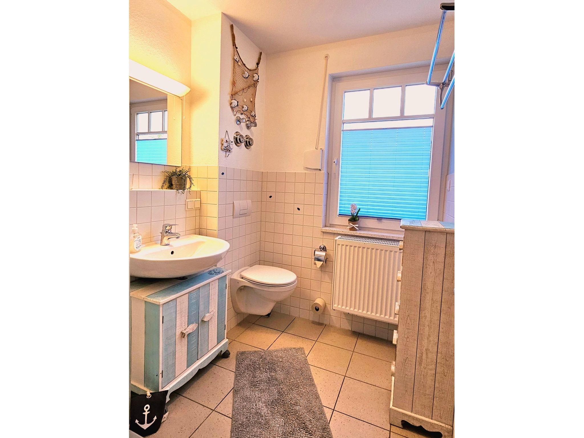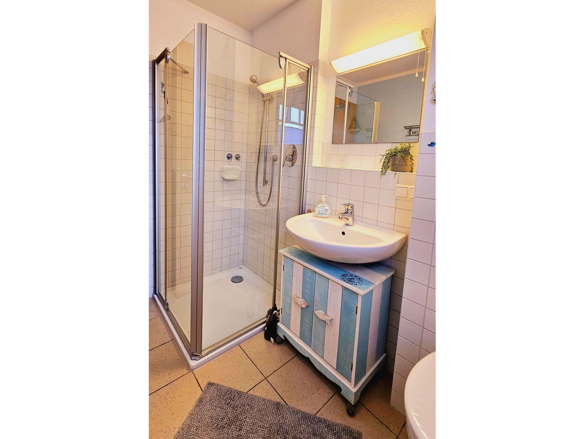Im modernisierten Badezimmer gibt es eine bodentiefe Dusche WC, Haar Fön sowie einen Kosmetikspiegel.
