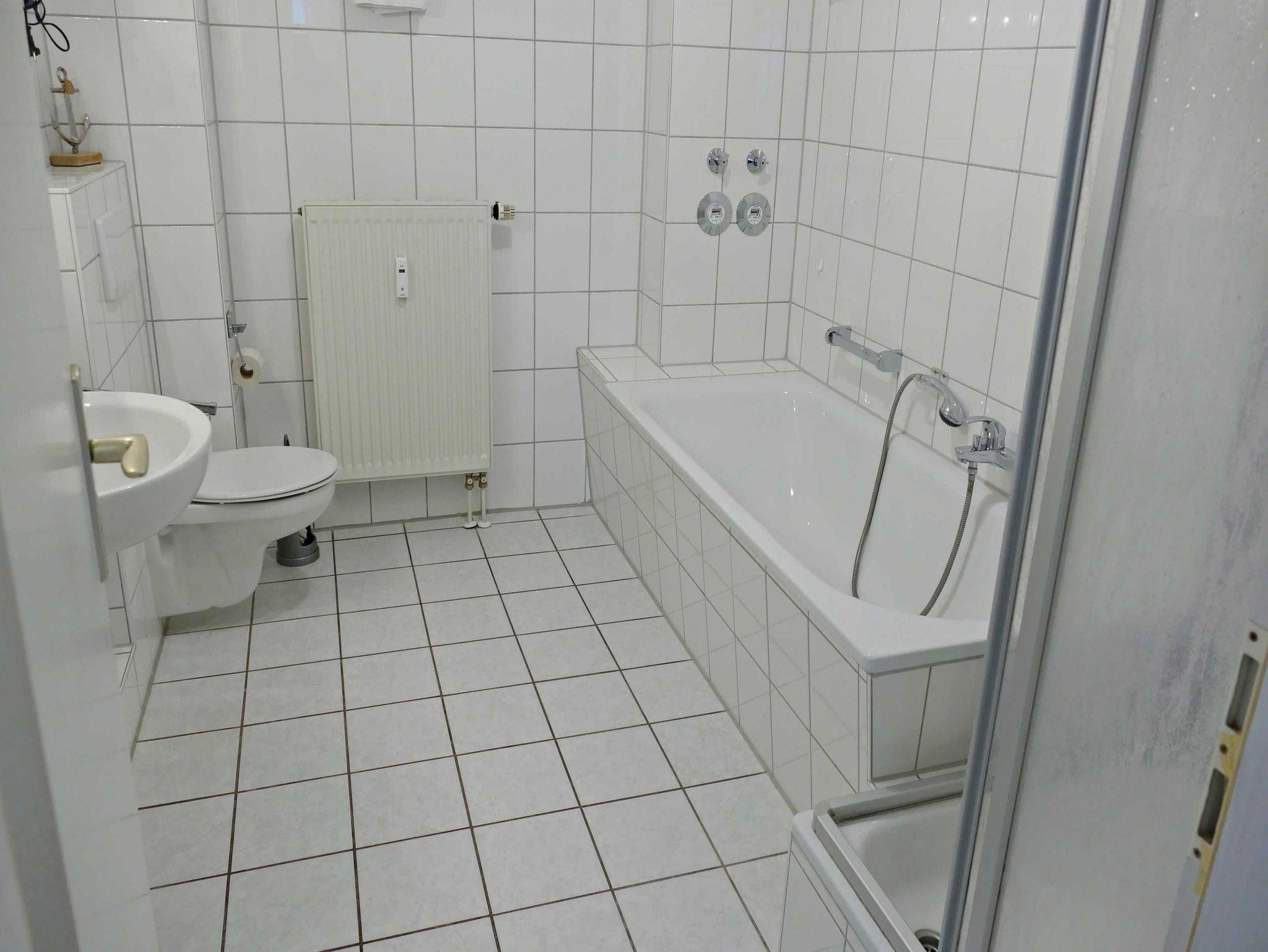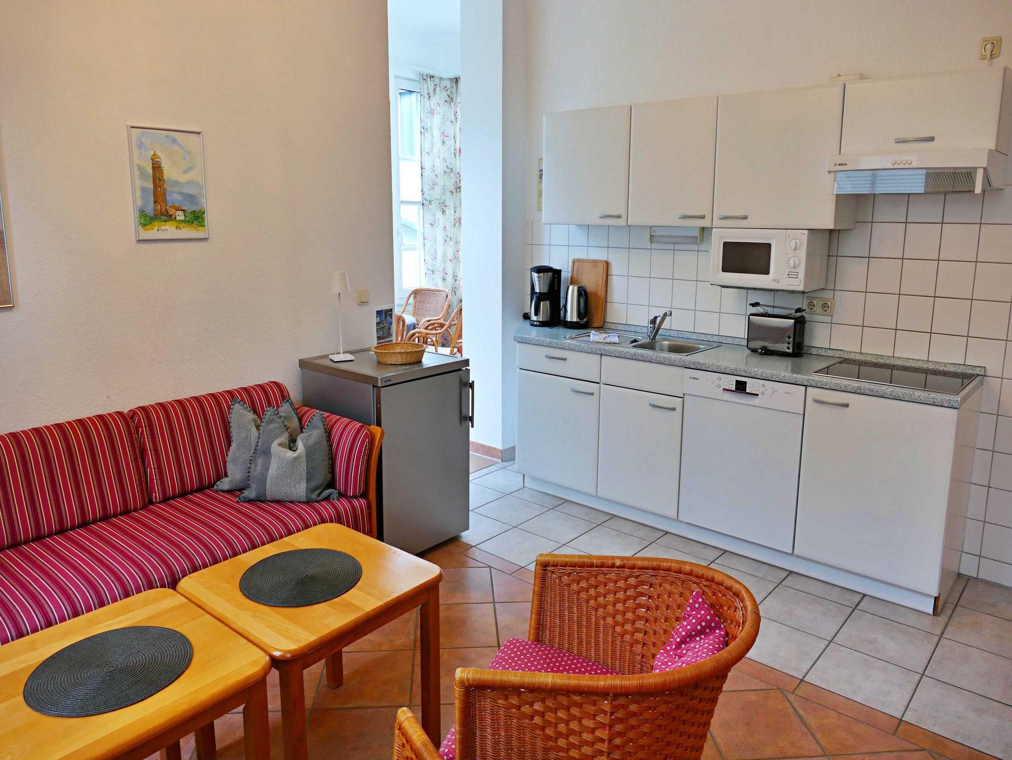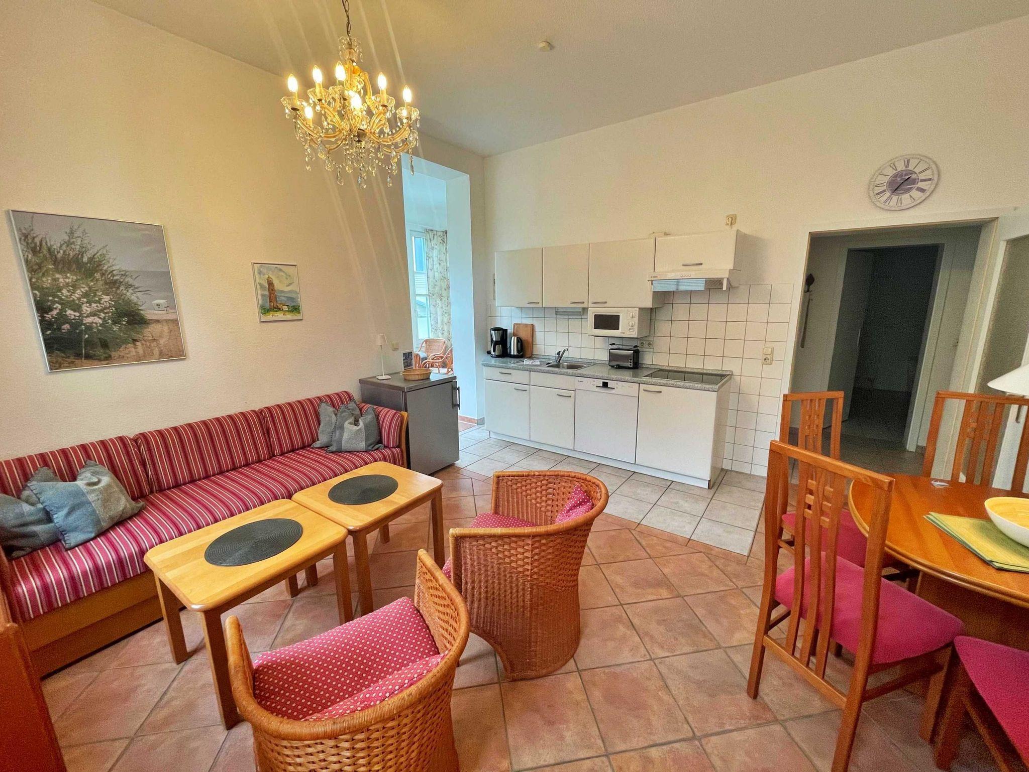 Hell, charmant und stilvoll - diese 46 qm große Ferienwohnung in der 1. Etage ist der ideale Rückzugsort für einen entspannten Urlaub für bis zu 4 Personen. Im hellen Wohnzimmer befinden sich neben einer bequemen Couch, auch zwei Sessel mit Couchtisch sowie ein Esstisch mit 4 Stühlen, der genügend Platz bietet. Die Couch (1,40 x 2,00 m) kann als Aufbettungsmöglichkeit für zwei weitere Personen genutzt werden. Vom Wohnzimmer gelangen Sie in die Veranda, welche über eine gemütliche Sitzecke verfügt - perfekt für den ersten Kaffee am Morgen oder um den erlebnisreichen Tag bei einem Glas Wein ausklingen zu lassen. Die offene Küchenzeile mit Ceran-Kochfeld, Spülmaschine, Mikrowelle, Wasserkocher und Kaffeemaschine bietet alles, was man braucht für entspannte Frühstücke oder das kleine Abendessen. Das Schlafzimmer verfügt über ein Doppelbett, Kleiderschrank und ist mit Laminatfußboden ausgelegt. Das Bad mit Badewanne, Dusche und WC rundet das Wohlfühlangebot. Natürlich ist kostenfreies WLAN inklusive. Ihren Pkw können Sie in der Tiefgarage parken und Ihre eigenen Räder ganz praktisch im Fahrradkeller unterstellen. Im Keller befinden sich zudem Waschmaschinen und Trockner, die gegen eine Gebühr nutzbar sind.