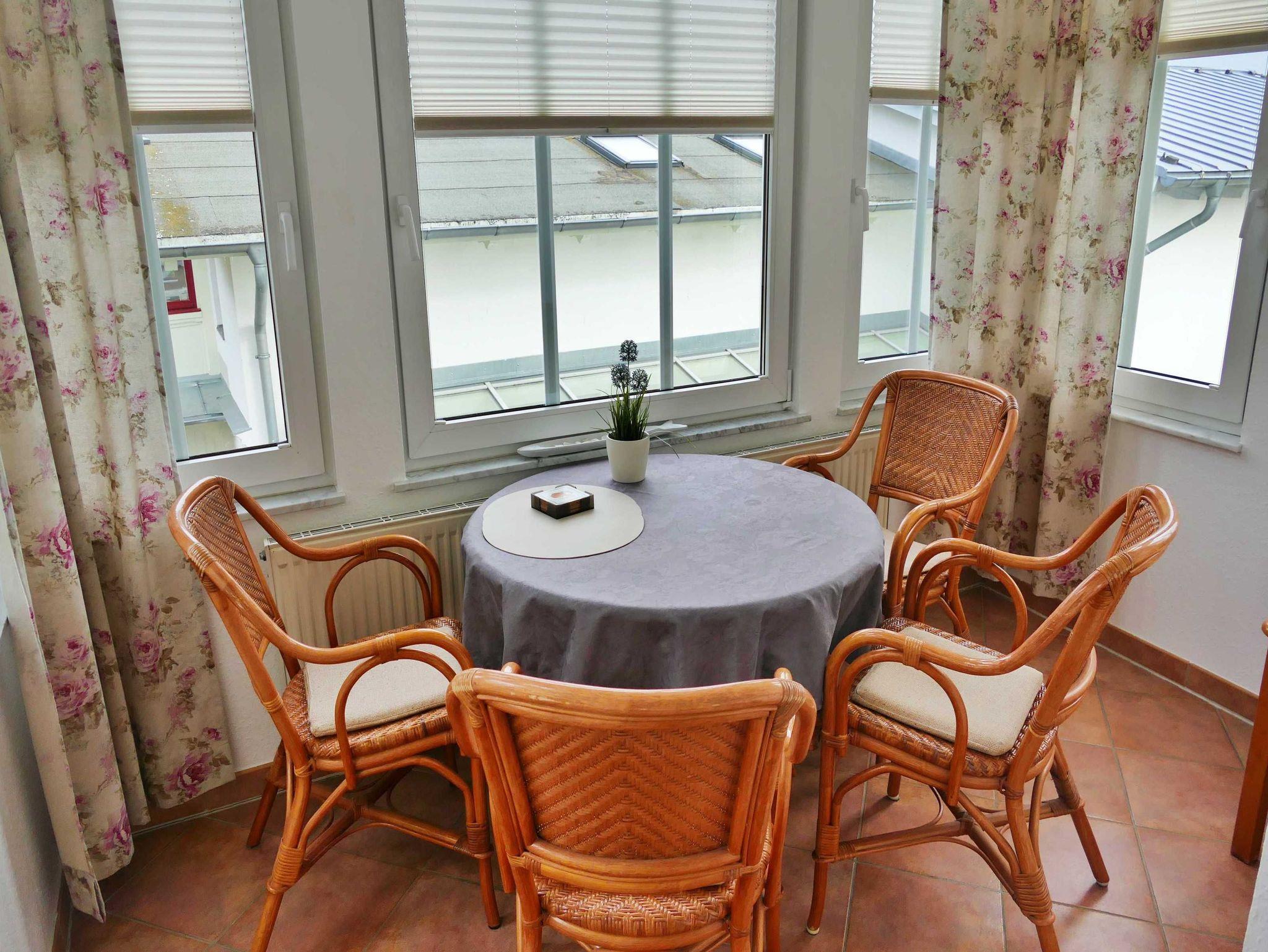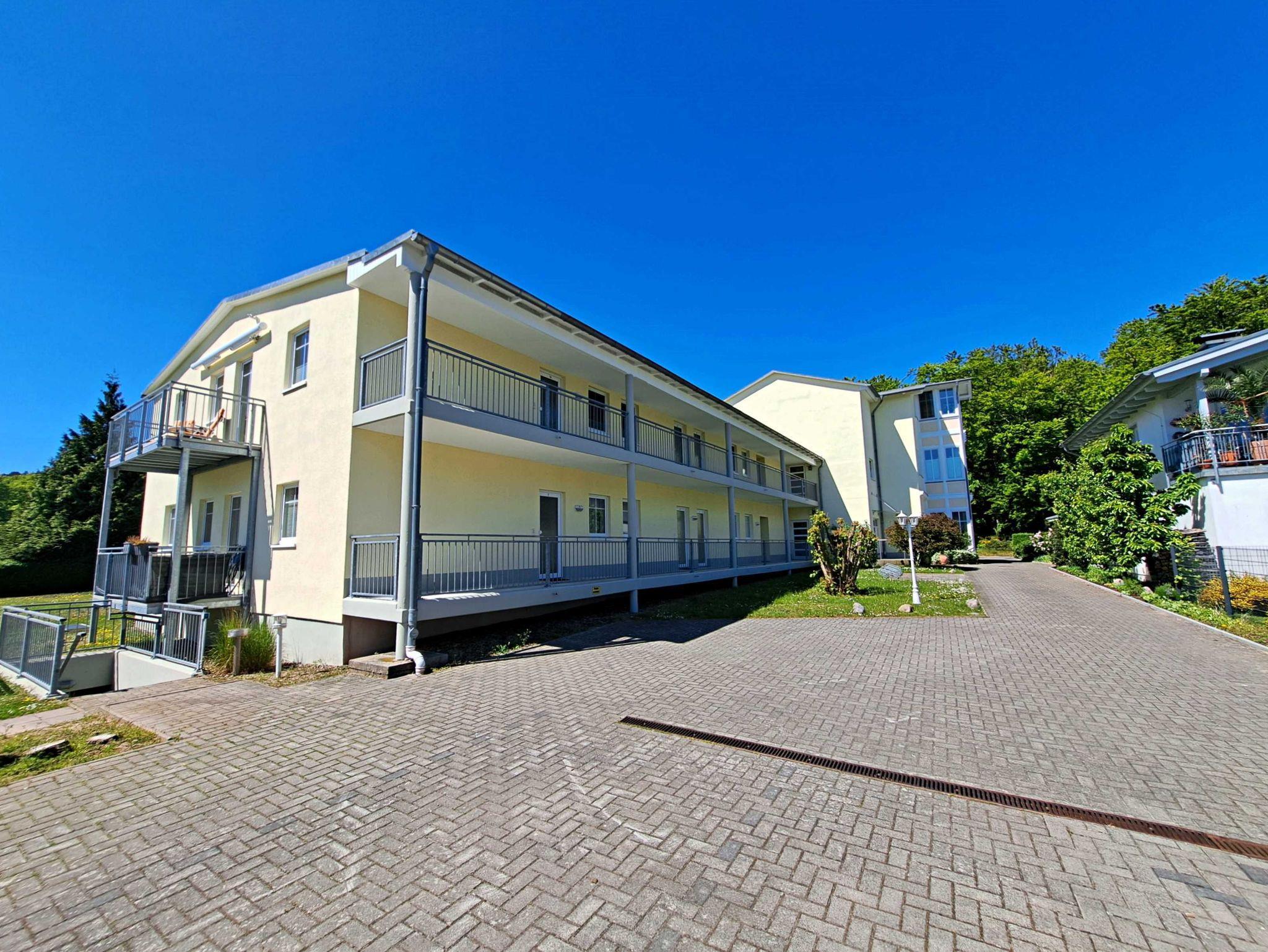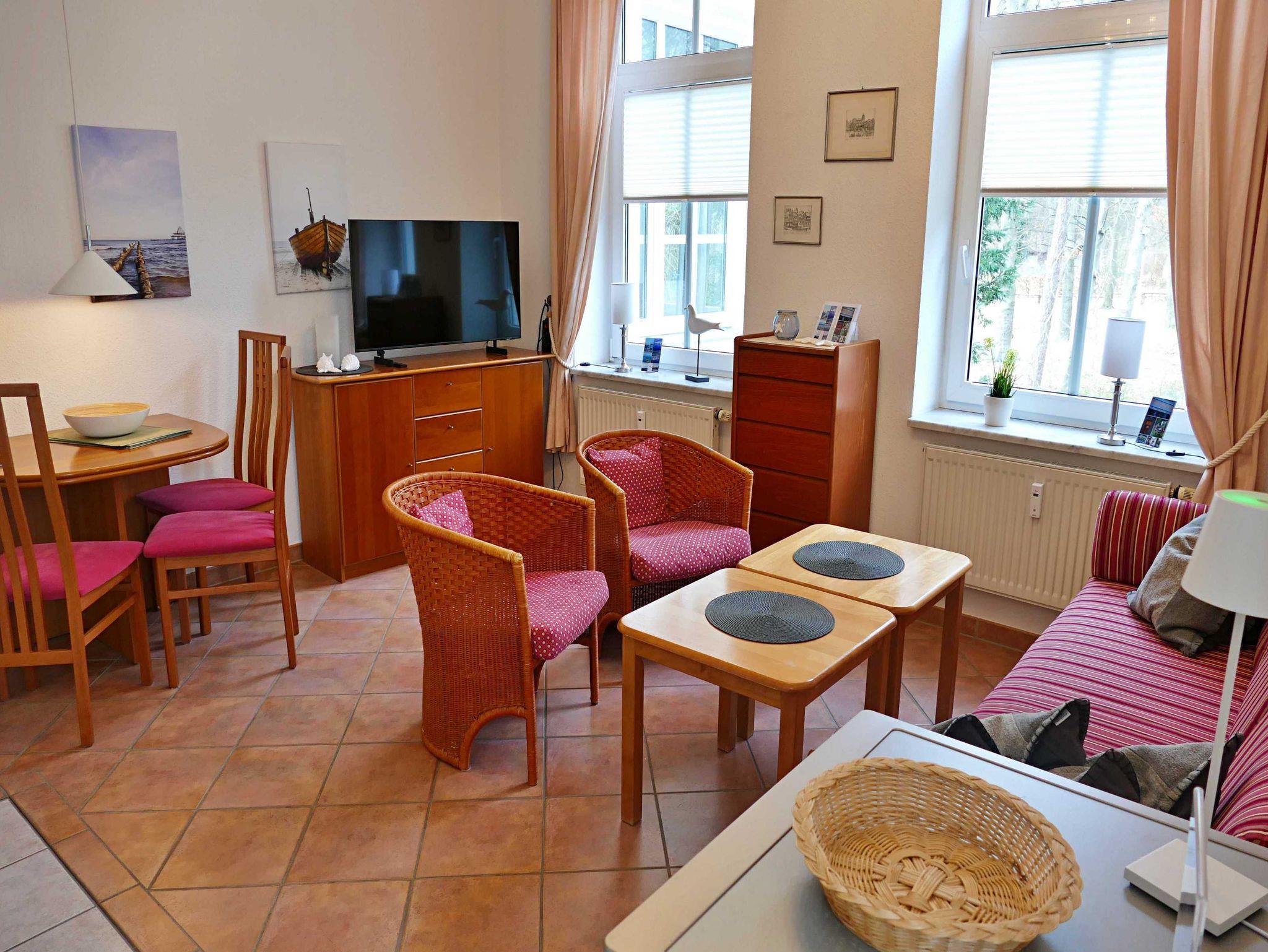 Hell, charmant und stilvoll - diese 46 qm große Ferienwohnung in der 1. Etage ist der ideale Rückzugsort für einen entspannten Urlaub für bis zu 4 Personen. Im hellen Wohnzimmer befinden sich neben einer bequemen Couch, auch zwei Sessel mit Couchtisch sowie ein Esstisch mit 4 Stühlen, der genügend Platz bietet. Die Couch (1,40 x 2,00 m) kann als Aufbettungsmöglichkeit für zwei weitere Personen genutzt werden. Vom Wohnzimmer gelangen Sie in die Veranda, welche über eine gemütliche Sitzecke verfügt - perfekt für den ersten Kaffee am Morgen oder um den erlebnisreichen Tag bei einem Glas Wein ausklingen zu lassen. Die offene Küchenzeile mit Ceran-Kochfeld, Spülmaschine, Mikrowelle, Wasserkocher und Kaffeemaschine bietet alles, was man braucht für entspannte Frühstücke oder das kleine Abendessen. Das Schlafzimmer verfügt über ein Doppelbett, Kleiderschrank und ist mit Laminatfußboden ausgelegt. Das Bad mit Badewanne, Dusche und WC rundet das Wohlfühlangebot. Natürlich ist kostenfreies WLAN inklusive. Ihren Pkw können Sie in der Tiefgarage parken und Ihre eigenen Räder ganz praktisch im Fahrradkeller unterstellen. Im Keller befinden sich zudem Waschmaschinen und Trockner, die gegen eine Gebühr nutzbar sind.