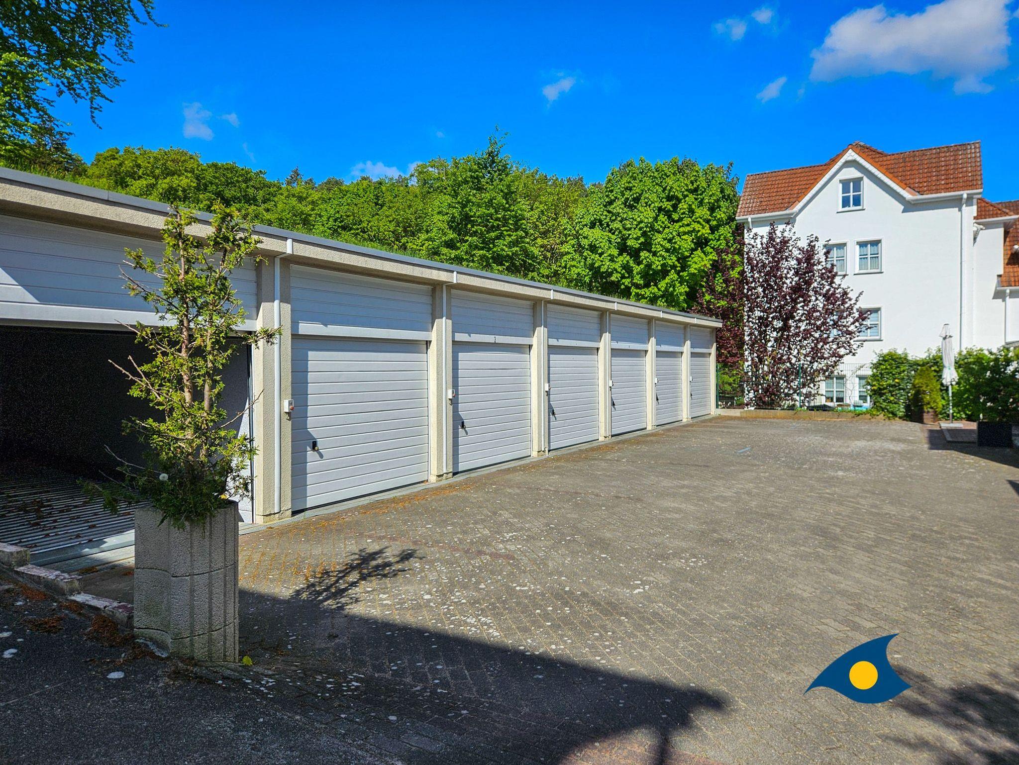 Zu diesem Appartement gehört eine Garage mit Doppelparksystem hinter dem Haus.